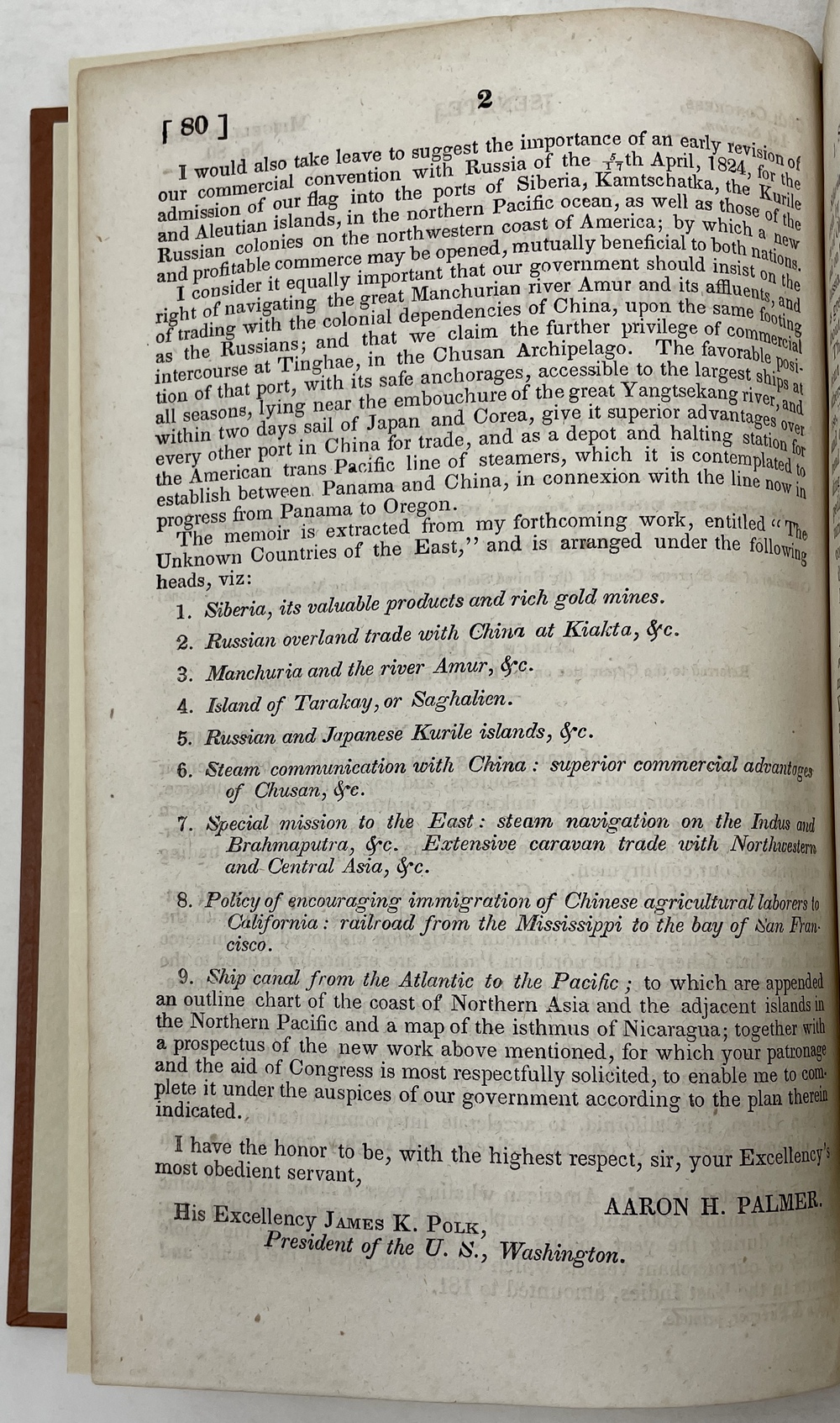 本書は、パーマーによる数多くの提言の中でも比較的早い時期に印刷されたもの一つで、ポーク大統領(James K. Polk, 1795 - 1849)に、北太平洋上にある諸国との通商関係をアメリカが開くことの重要性を強く主張したものです。パーマーによると、この提言は、当時パーマーが公刊することを予定していたと題した大部の作品の一部を抜粋したもので、次のような構成をとっています。