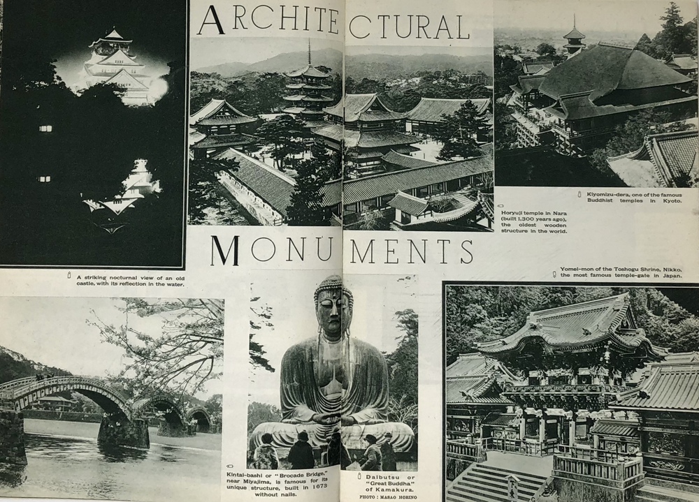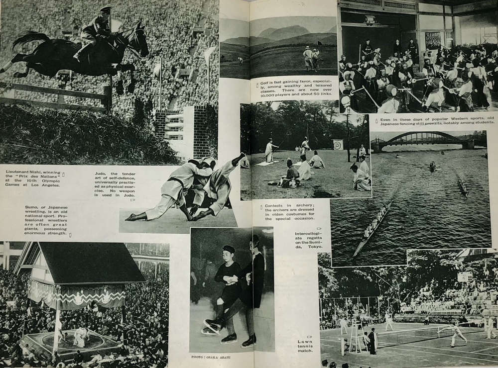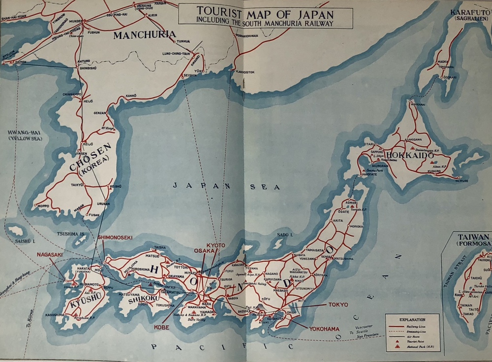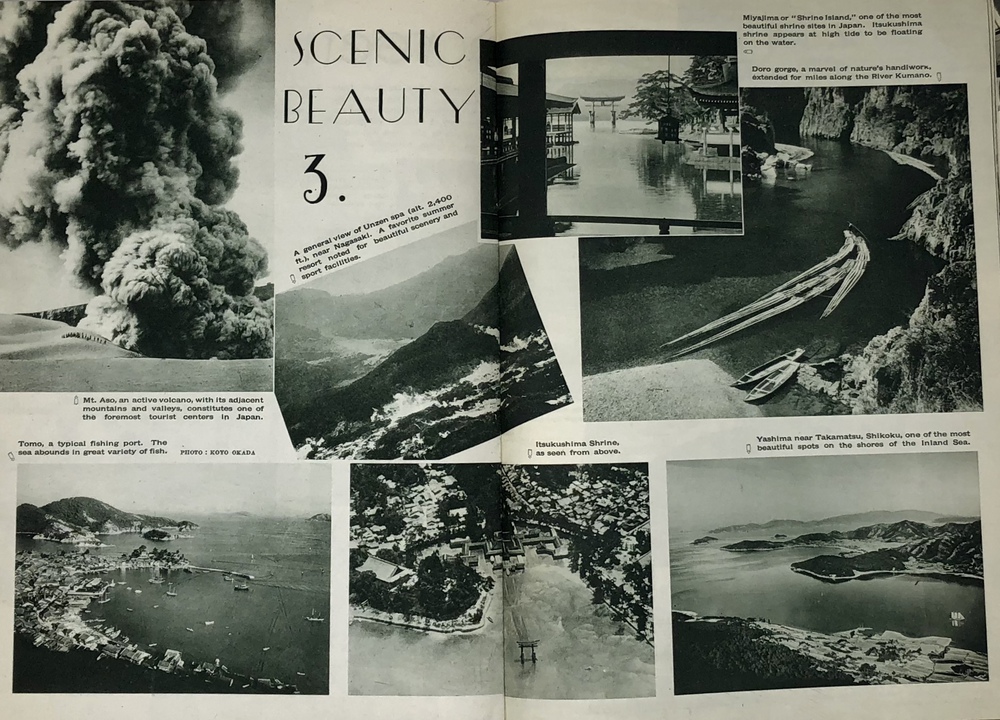 本書は、鉄道省などの歴代鉄道官庁が作成した英文ガイドブックのうちの一つで、シンプルにJAPANと題されています。同じタイトルを持つもっと小型のガイドブックも早くから刊行されていますが、本書は実際的な情報よりも日本への観光誘致を強く意識した写真を中心としたビジュアル誌として作成されているように思われます。 表紙の美しい日本画を作成した人物は残念ながら店主には不明ですが、裏面に落款があることから特定は可能でしょう。刊行年の記載はありませんが、おそらくテキストの内容から見て1933年ごろと思われます。 冒頭で紹介されるのは、日本を象徴する富士山で、見開きを使って様々な顔を見せる富士山の写真を6枚掲載しています。首都である大都市東京、四季の美しい日本の風景、祭り、京都や奈良の歴史的建造物や遺跡といった伝統的側面だけでなく、娯楽としての海水浴や競馬、スポーツも紹介されています。スポーツでは、ロサンゼルスオリンピック(1932年)で活躍し、欧米でも多くのファンがいた西竹一(通称バロン西、映画『硫黄島からの手紙』で伊原剛志が演じた)の雄姿や、嘉納治五郎の尽力によって国際的な認知を高めつつあった柔道、テニスやレガッタ、アイススケートなどの写真があります。また能や歌舞伎といった伝統舞台芸術とともに映画撮影の様子を紹介した写真もあります。 また、ジャポニズムブーム以来海外で定着した感のある、美しい「日本女性」を紹介する写真とテキストも見られます。伝統的な側面と合わせて、最新の工業設備も写真で紹介しており、伝統と最新技術とを併せ持つ魅力的な国としての日本を演出しようという明確な意図が伺えます。植民地としてた朝鮮や台湾、満州も本書では紹介されており、当時の日本が海外に見せたかった像としての日本像が、このガイドブックには凝縮して詰められていると言えるでしょう。