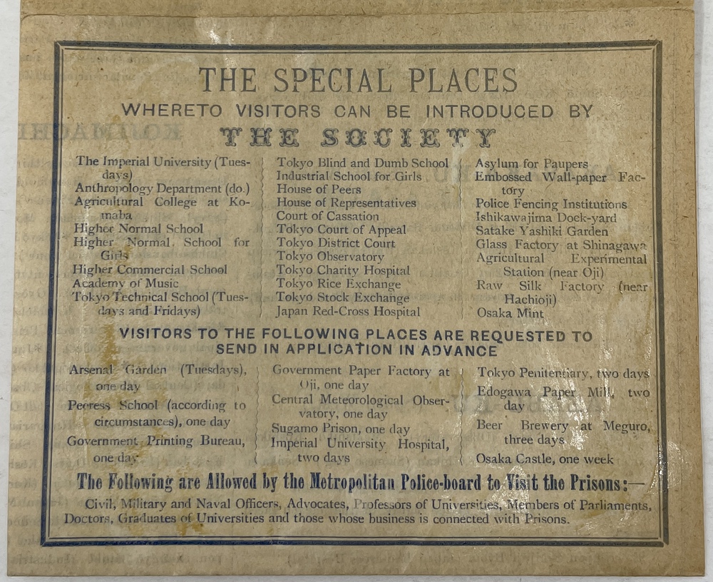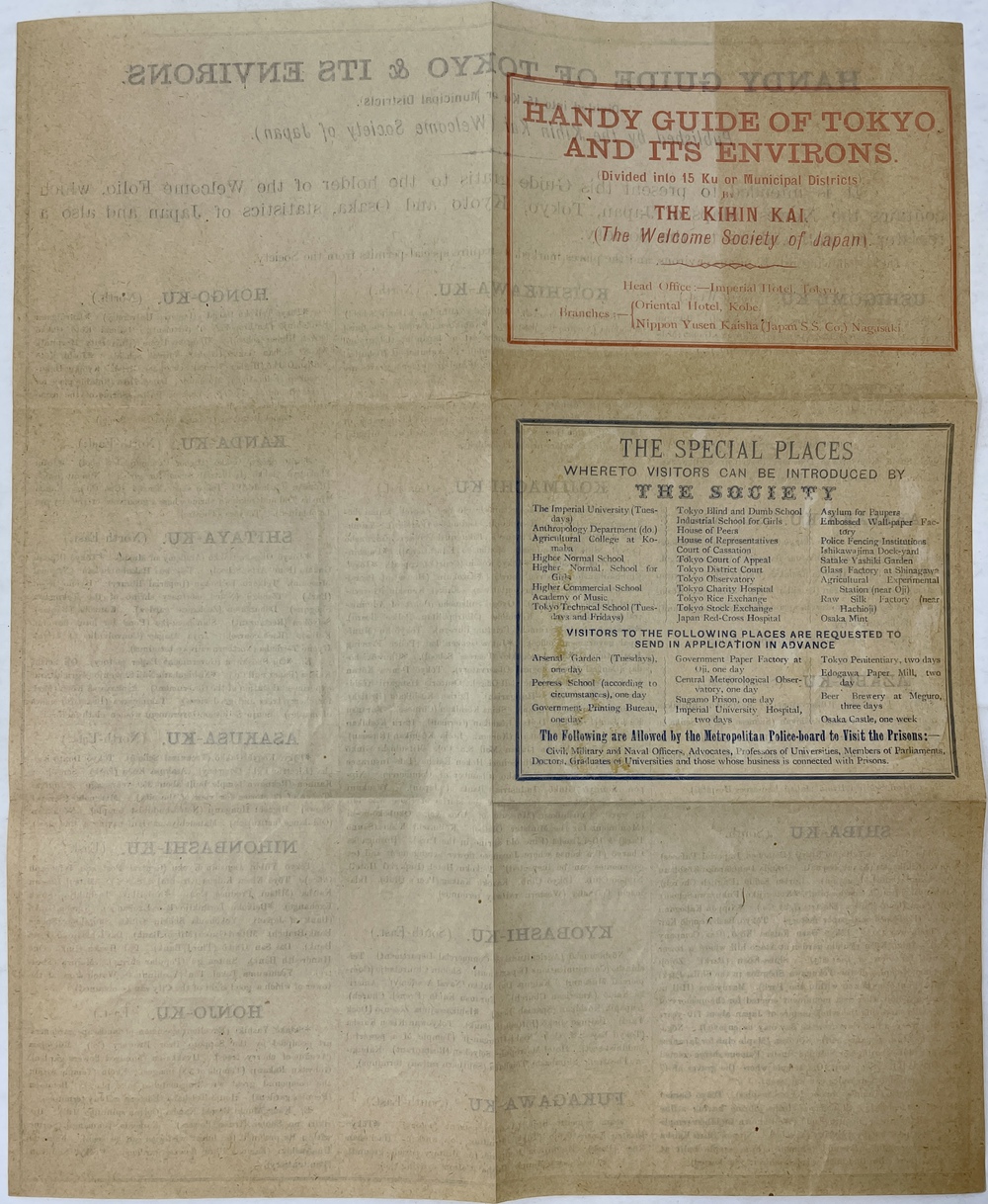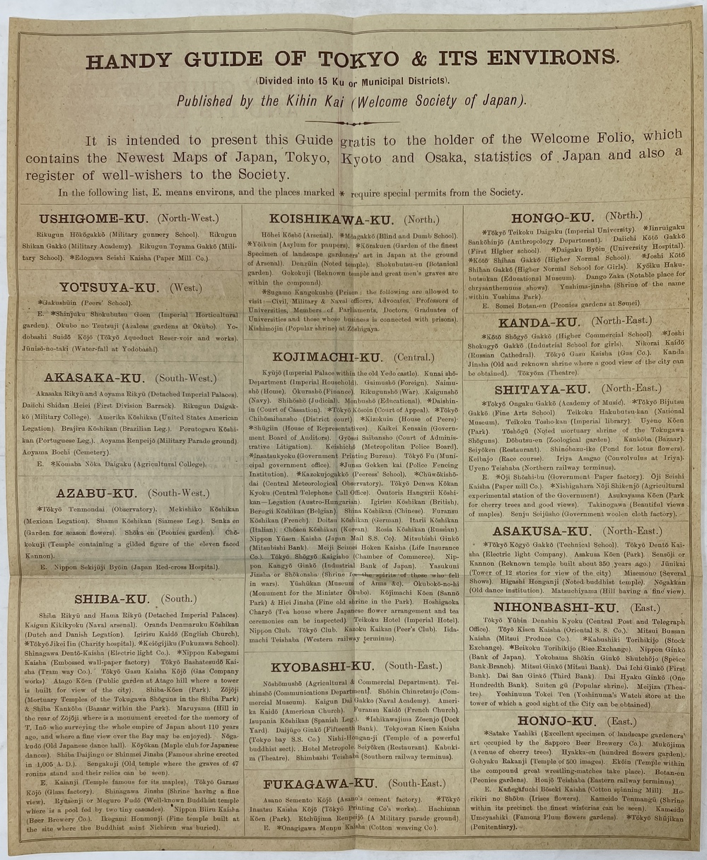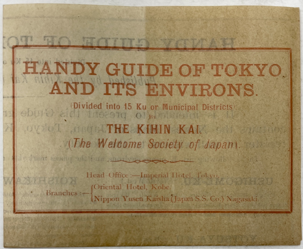 この地図を発行していた喜賓会(Welcome Society of Japan)とは、1893(明治26)年に、東京商業会議所の初代会頭であった渋沢栄一、三井物産の設立と三井財閥の近代化に大きく貢献した益田孝、貴族院議長であった蜂須賀茂韶らによって設立された非営利組織で、主に来日外国人に対する様々な便宜を図ることをその主たる目的としていました。明治日本における最初の来日観光客を対象とした組織であり、今で言うところの「インバウンド」について初めて対応した日本における、観光組織の原点とも言える存在です。現代の日本交通公社の前身であるジャパン・ツーリスト・ビューロー(1912年設立)が設立されるまで、増加する来日外国人観光客の対応を手探りながら一手に担っていました。 この小さな折り込みパンフレットは、喜賓会の比較的書記の刊行物と思われるもので、当時15区に分かれていた東京市の簡単な英文ガイドとなっています。刊行年などの書誌情報は一切記載されていませんが、「Welcome Folio」と当時喜賓会が呼んでいた英文ガイドマップに言及しており、その特徴(東京、京都、大阪の市街図と各種の統計情報を掲載しており、会員証を兼ねていること)に合致する地図が1901年に刊行された第3版のガイドマップであることから、この第3版のガイドマップの補遺として製作されたものではないかと思われます。英文での喜賓会の呼称を、「The Welcome Society of Japan」という英語表現よりも、会名をそのままローマ字で記した「THE KIHIN KAI」を優先している点も特徴的です。帝国ホテルをヘッド・オフィスとしながら、神戸のオリエンタルホテルと長崎の日本郵船会社を支部としても記載していることも興味深い点です。このブックレットはごく簡単に東京市内を紹介した小さな印刷物に過ぎませんが、それだけに残存していること自体が非常に珍しく、喜賓会による印刷の幅広さやその変遷を理解する上では大変貴重なものと言えます。