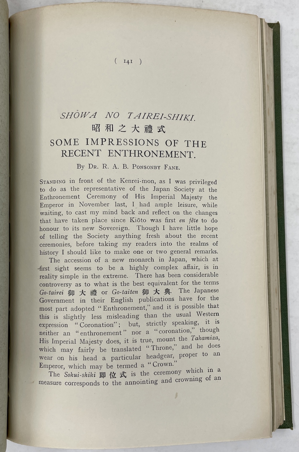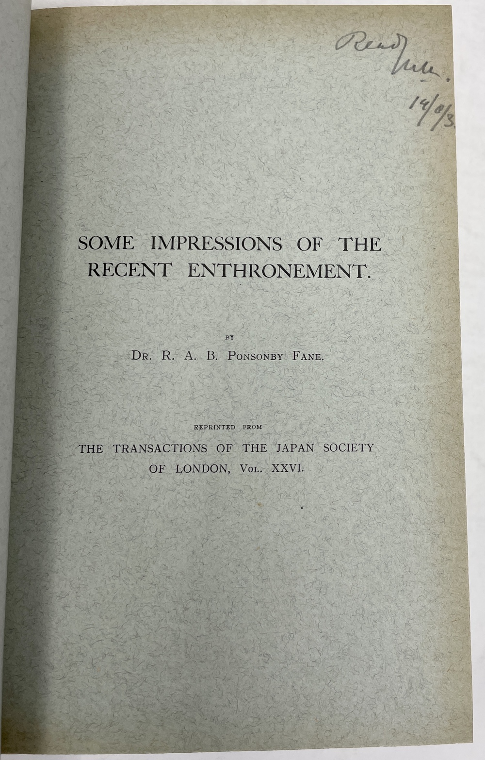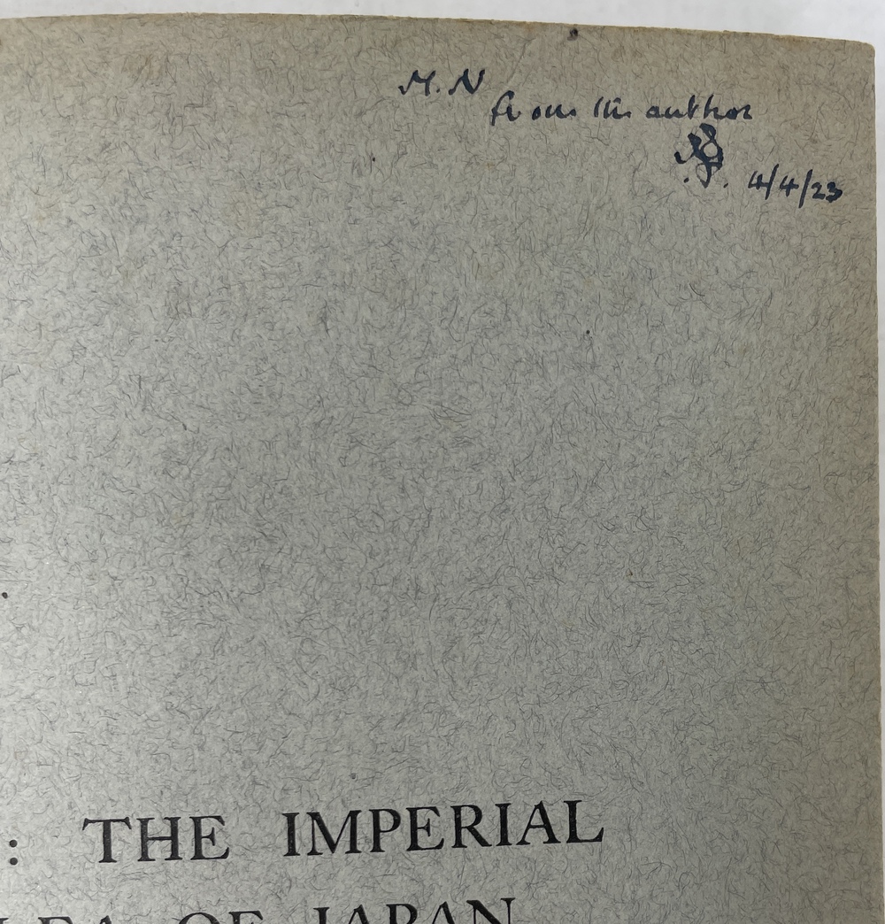 9. 「昭和の大禮式:先般の即位式についての印象記」SHOWA NO TAIREI-SHUKI. SOME IMPRESSIONS OF THE RECENT ENTHRONEMENT. (TJSL, Vol. XXVI).著者献辞あり。