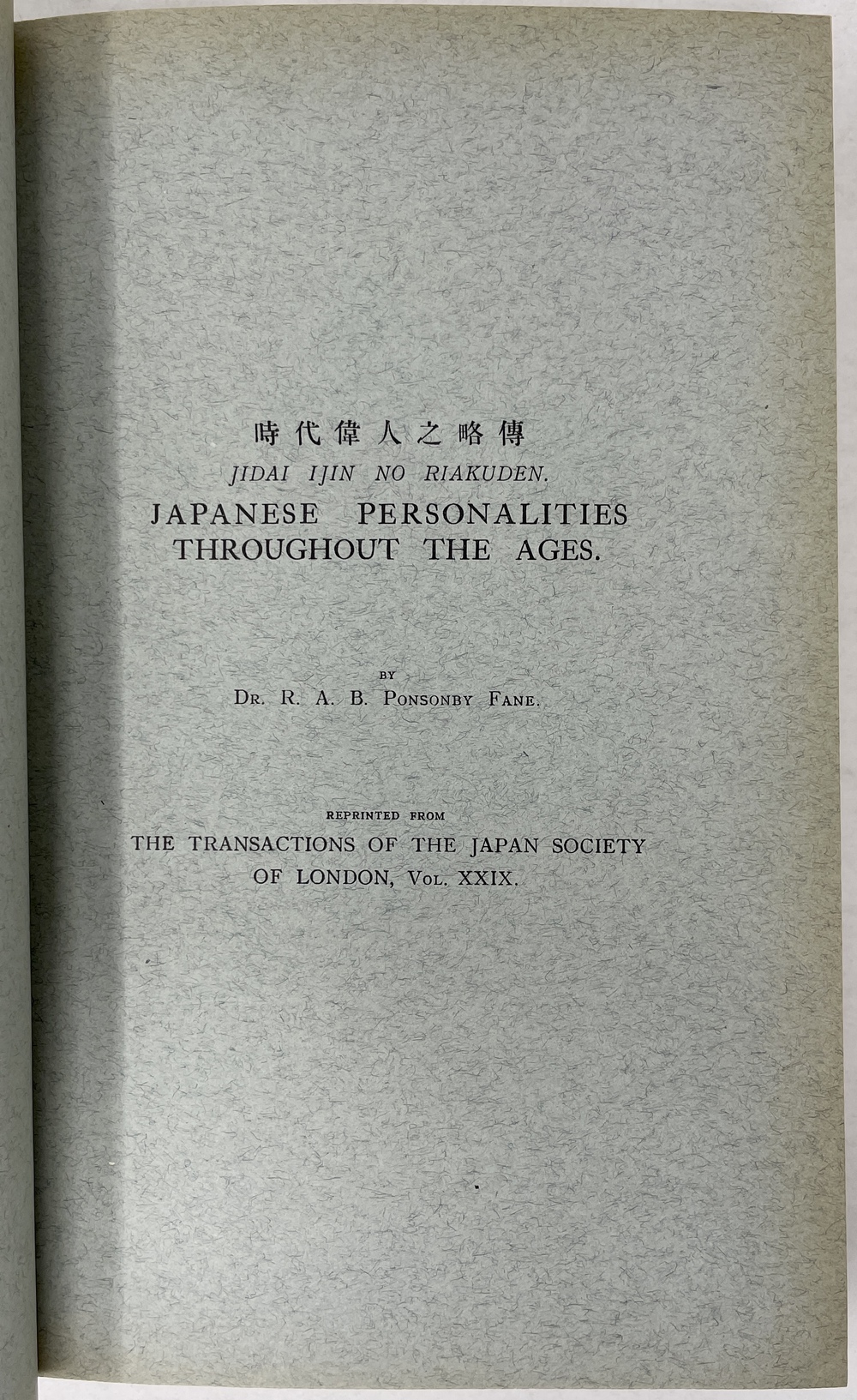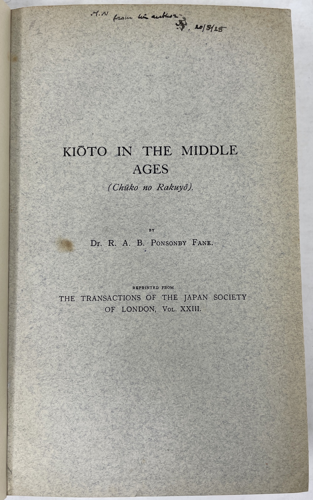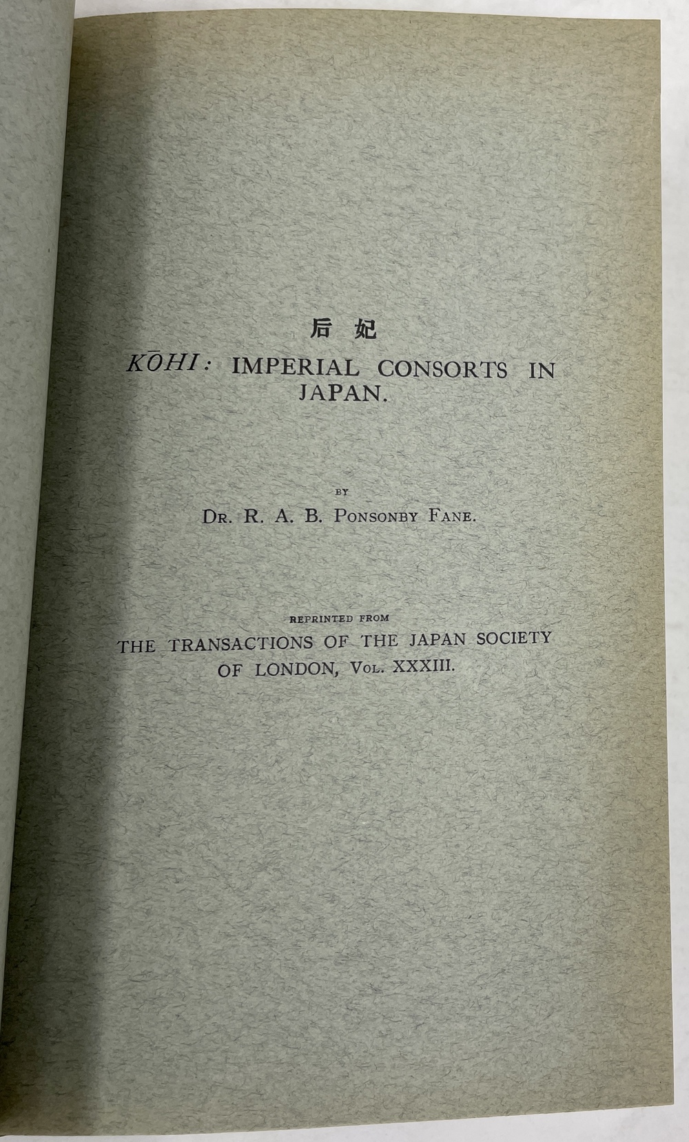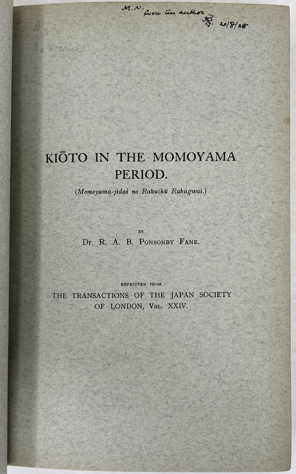 本書は、長年にわたって日本に滞在し、とりわけ1925年から亡くなる1937年まで京都に暮らし、京都をこよなく愛した英国人ポンソンビー=フェイン(Richard Arthur Brabazon Ponsonby-Fane, 1878 - 1937)の16本の著作をまとめたものです。『ロンドン日本協会紀要(Transactions of the Japan Society of London)に多年にわたって掲載されたポンソンビー=フェインの数多くの日本研究が3冊に綴じられたもので、しかも彼と長年深い親交があった旧蔵者への献辞本を多く含んでいる貴重な書物です。