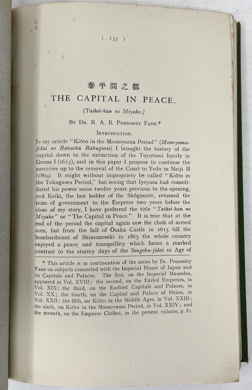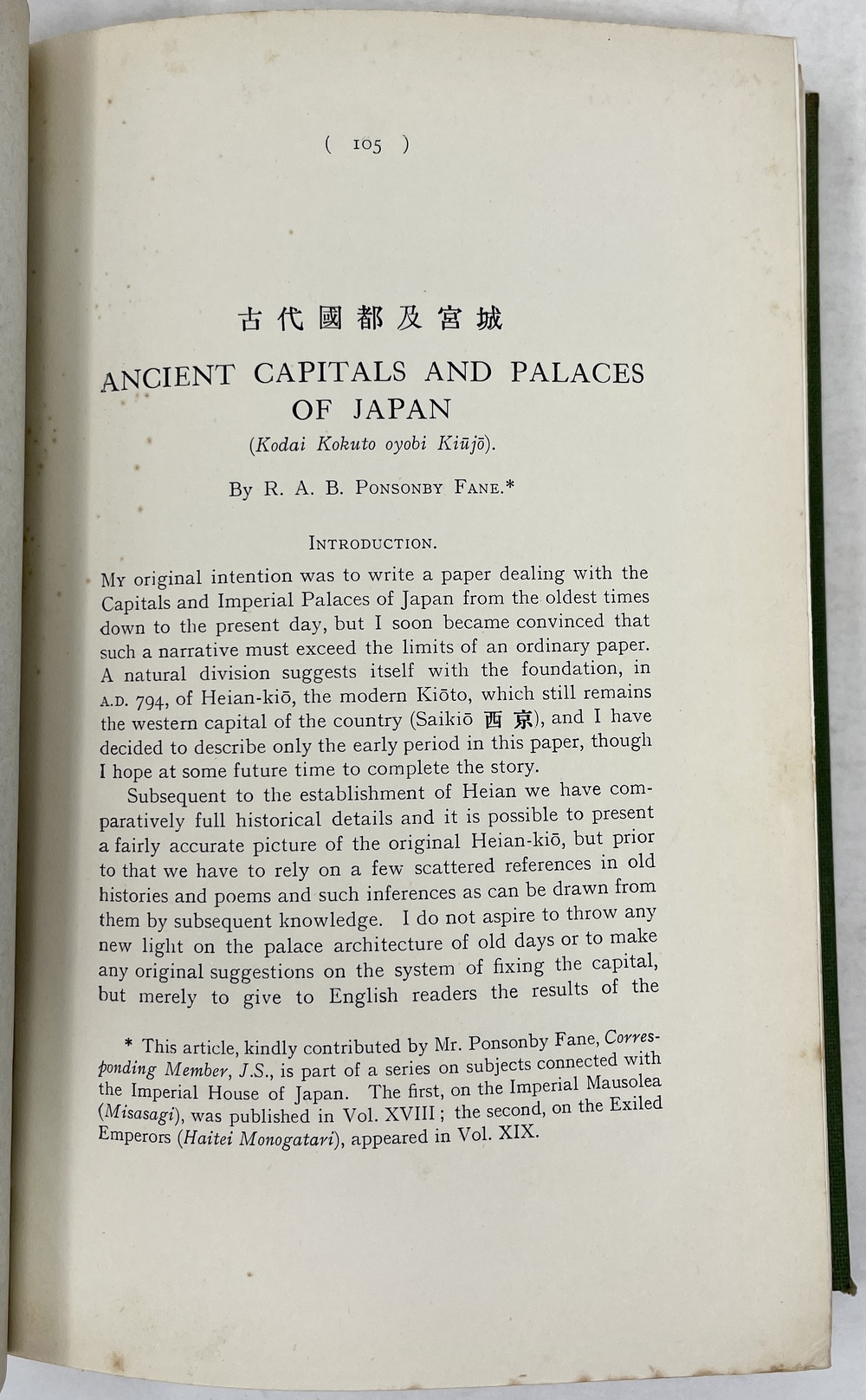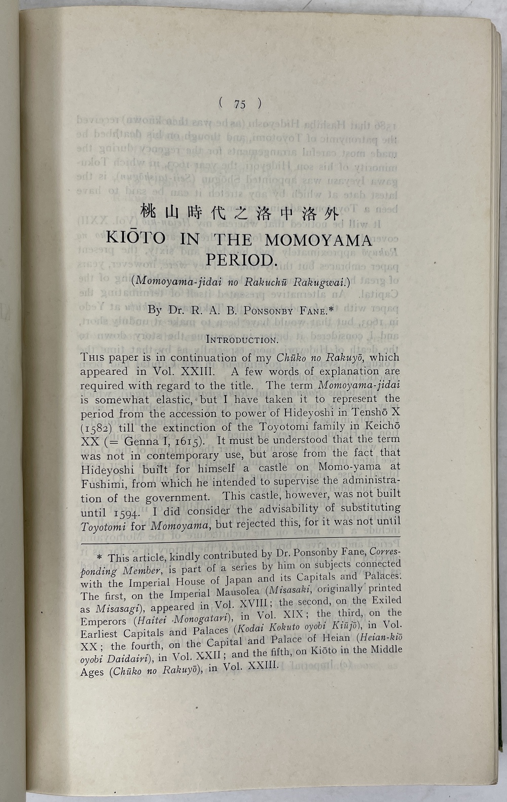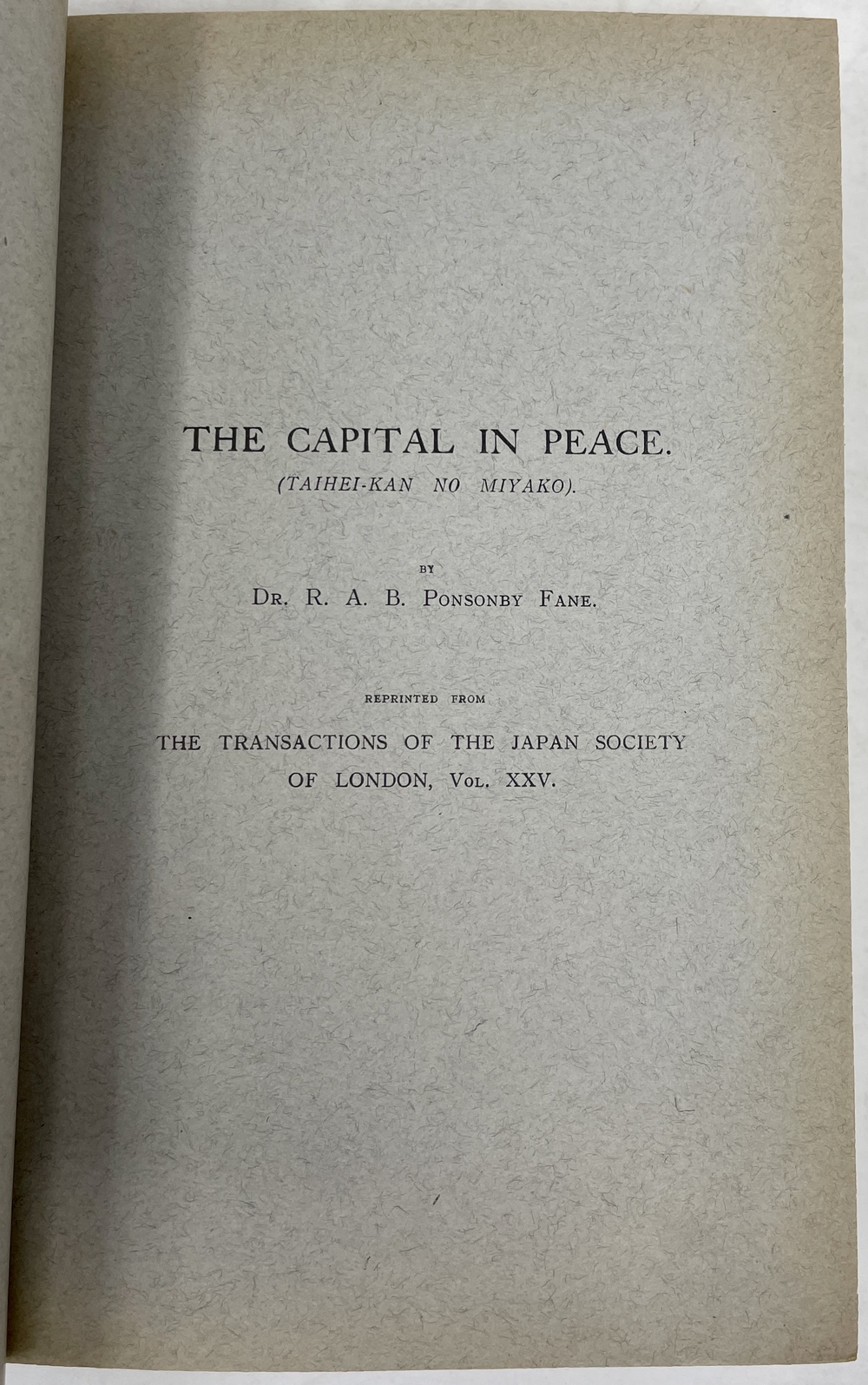 本書は、長年にわたって日本に滞在し、とりわけ1925年から亡くなる1937年まで京都に暮らし、京都をこよなく愛した英国人ポンソンビー=フェイン(Richard Arthur Brabazon Ponsonby-Fane, 1878 - 1937)の16本の著作をまとめたものです。『ロンドン日本協会紀要(Transactions of the Japan Society of London)に多年にわたって掲載されたポンソンビー=フェインの数多くの日本研究が3冊に綴じられたもので、しかも彼と長年深い親交があった旧蔵者への献辞本を多く含んでいる貴重な書物です。
