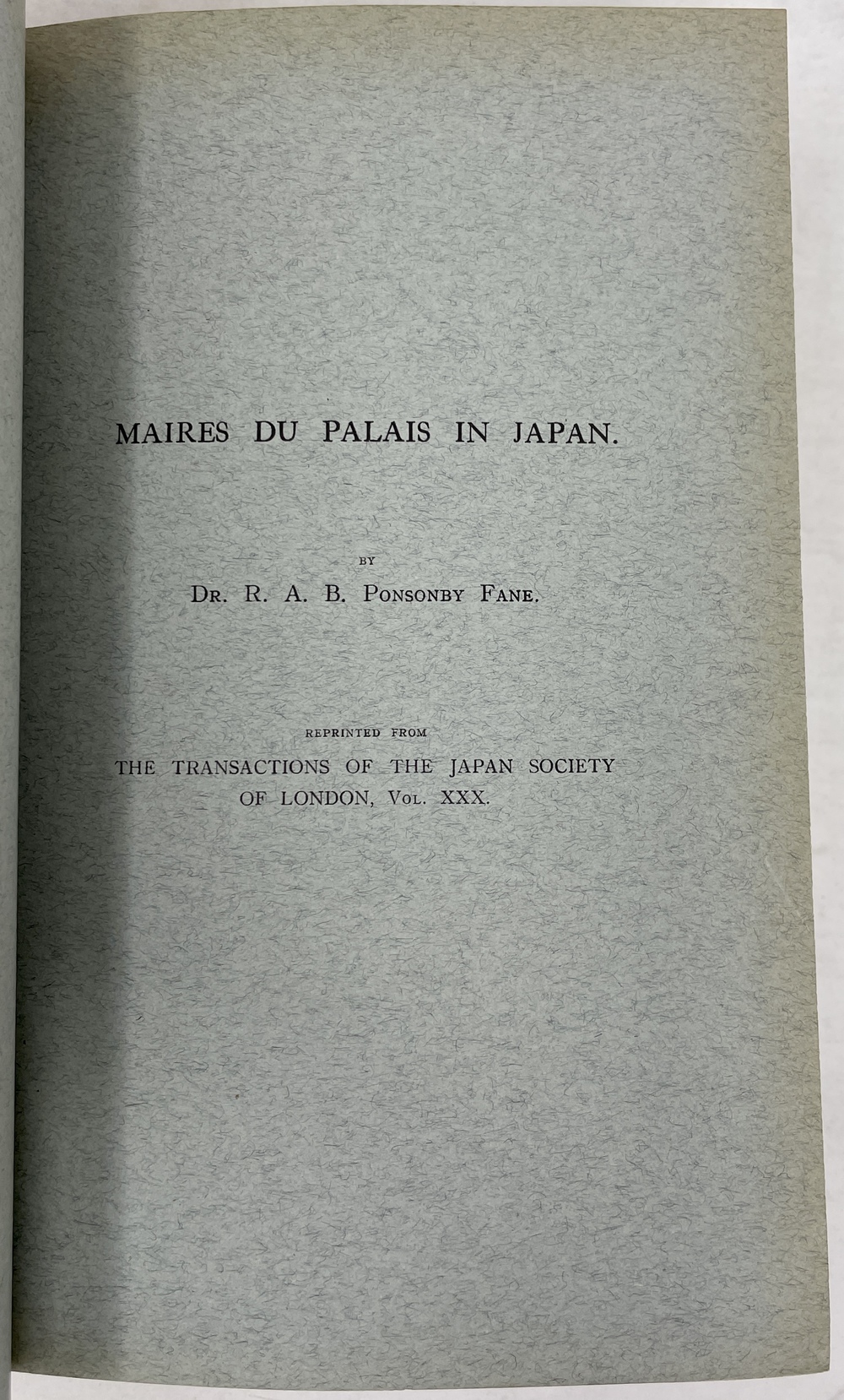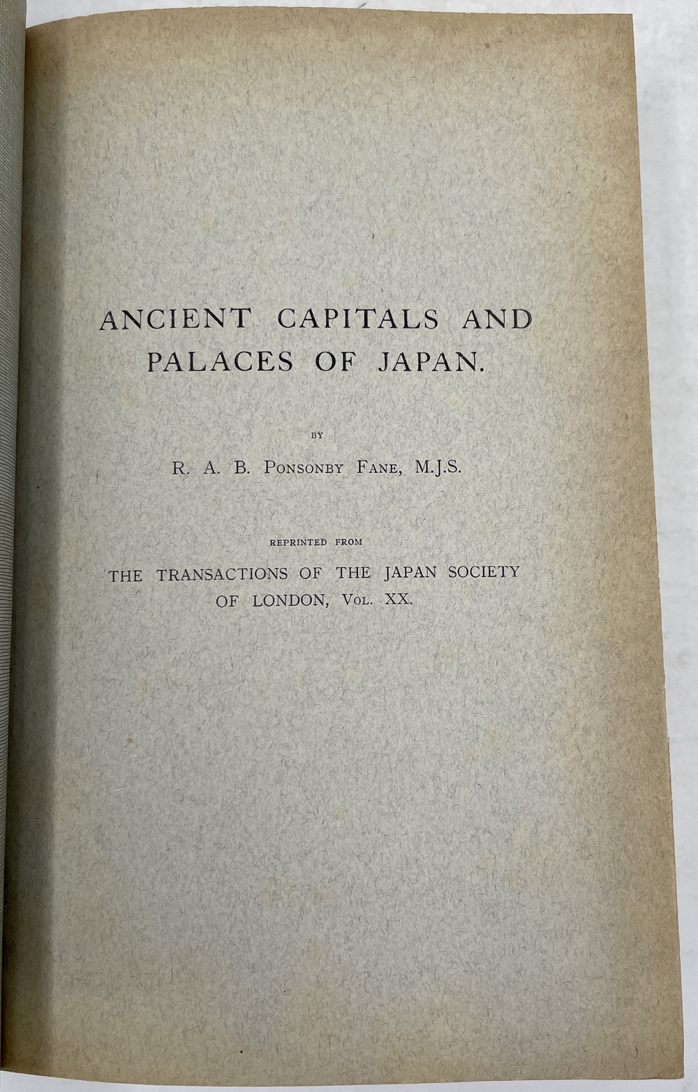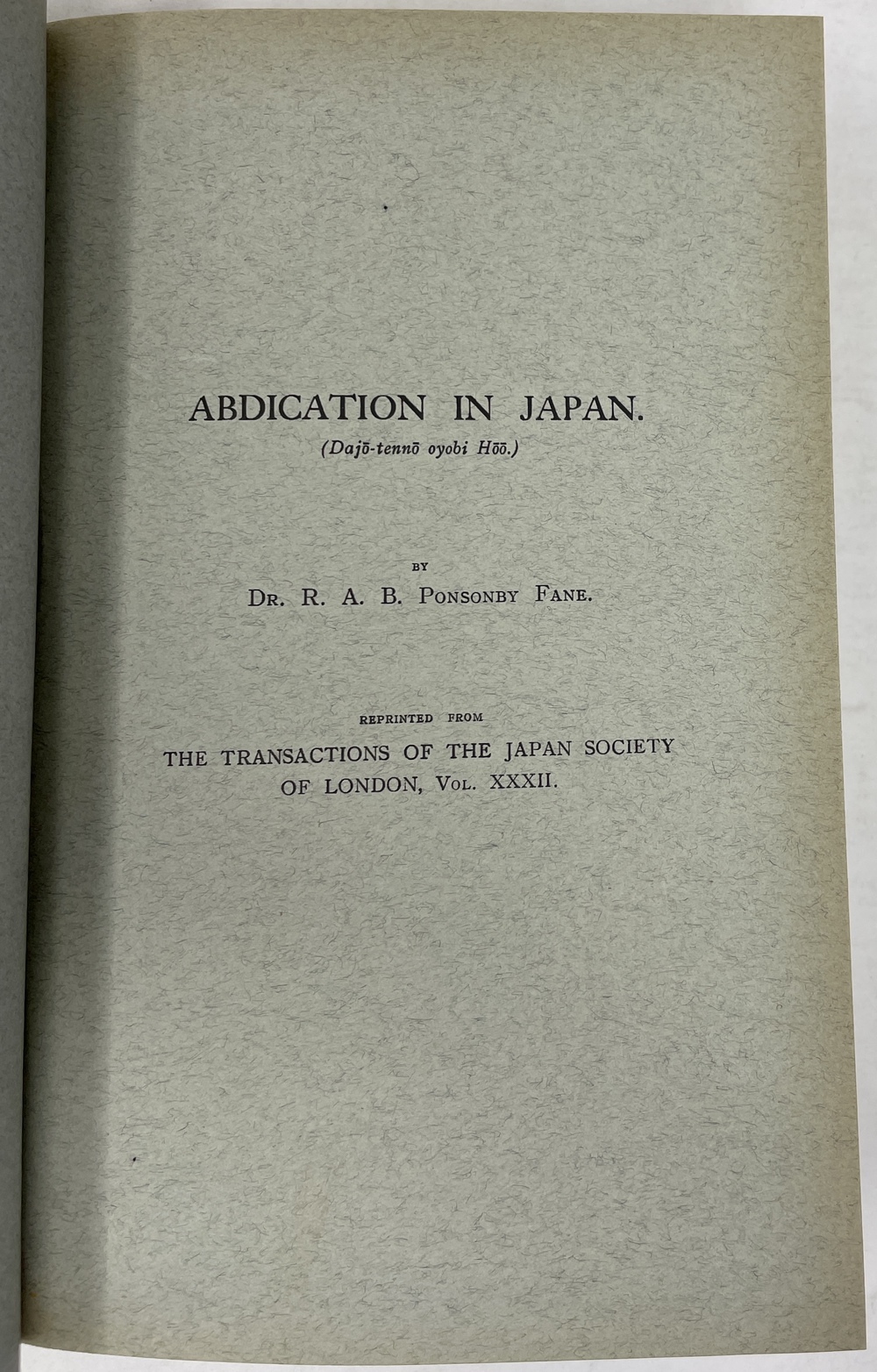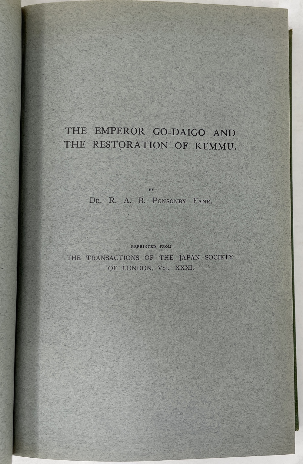 本書は、長年にわたって日本に滞在し、とりわけ1925年から亡くなる1937年まで京都に暮らし、京都をこよなく愛した英国人ポンソンビー=フェイン(Richard Arthur Brabazon Ponsonby-Fane, 1878 - 1937)の16本の著作をまとめたものです。『ロンドン日本協会紀要(Transactions of the Japan Society of London)に多年にわたって掲載されたポンソンビー=フェインの数多くの日本研究が3冊に綴じられたもので、しかも彼と長年深い親交があった旧蔵者への献辞本を多く含んでいる貴重な書物です。