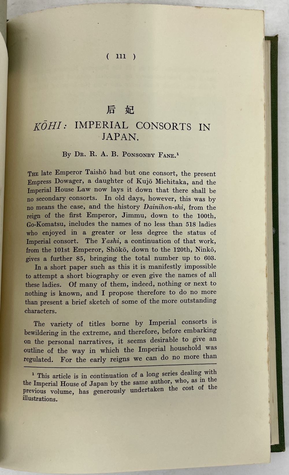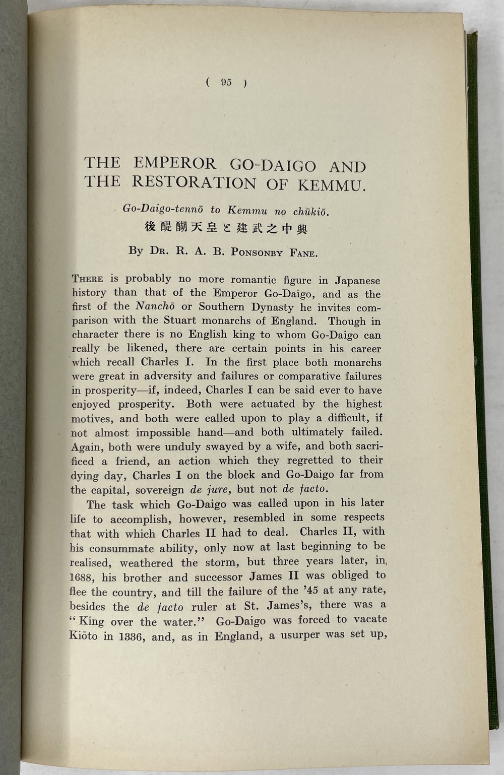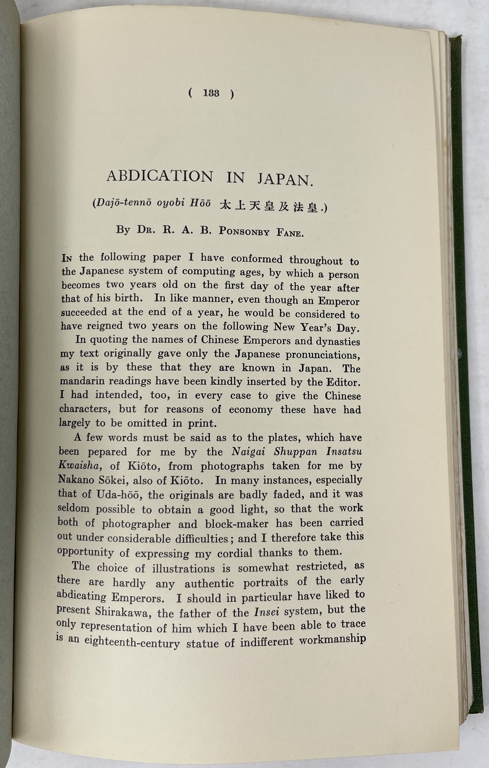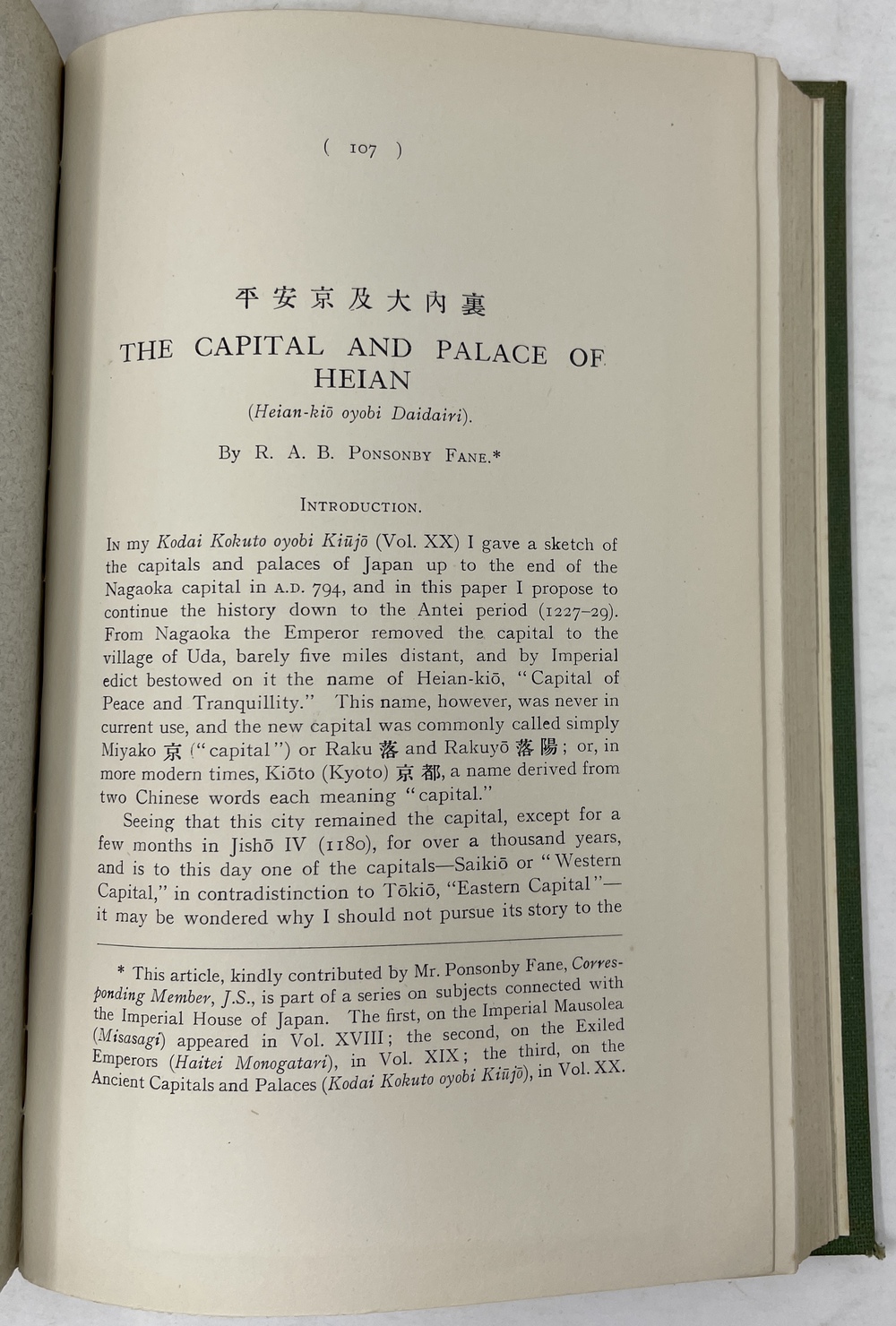 本書は、長年にわたって日本に滞在し、とりわけ1925年から亡くなる1937年まで京都に暮らし、京都をこよなく愛した英国人ポンソンビー=フェイン(Richard Arthur Brabazon Ponsonby-Fane, 1878 - 1937)の16本の著作をまとめたものです。『ロンドン日本協会紀要(Transactions of the Japan Society of London)に多年にわたって掲載されたポンソンビー=フェインの数多くの日本研究が3冊に綴じられたもので、しかも彼と長年深い親交があった旧蔵者への献辞本を多く含んでいる貴重な書物です。