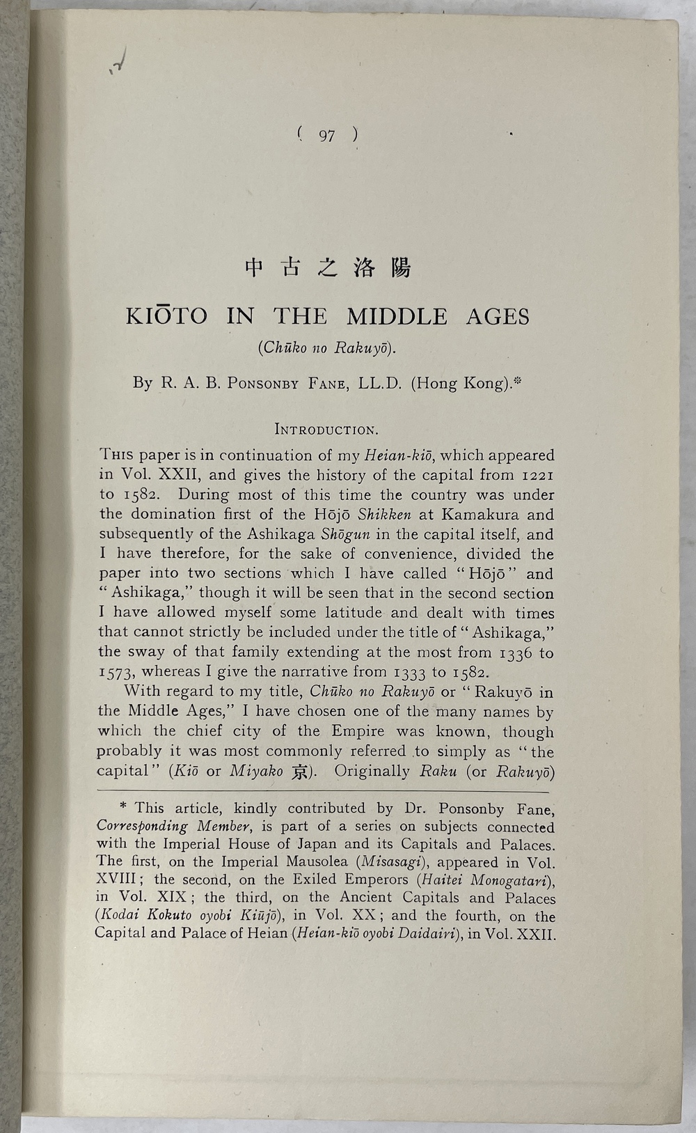 5. 「中古の洛陽(中世の京都)」KIOTO IN THE MIDDLE AGES (Chuko no Rakuyo). (TJSL, Vol. XXIII)著者献辞あり。