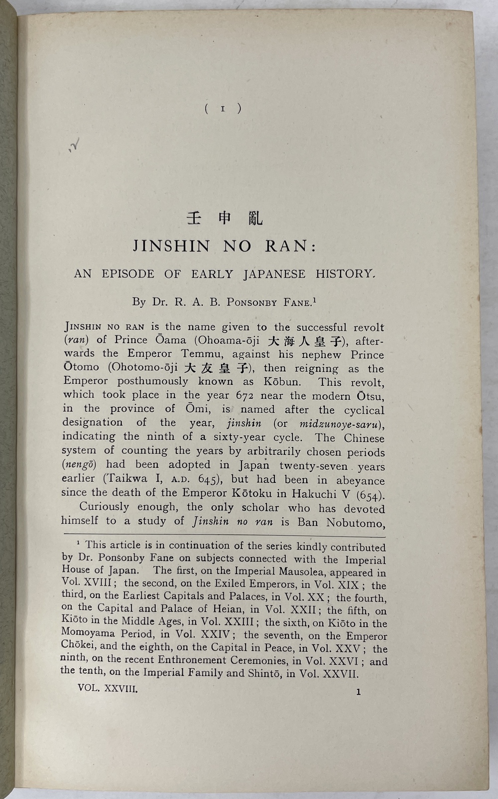 11. 「壬申の乱:初期日本の歴史におけるある事件」JINSHIN NO RAN: AN EPISODE OF EARLY JAPANESE HISTORY. (TSJL, Vol. XXVIII)