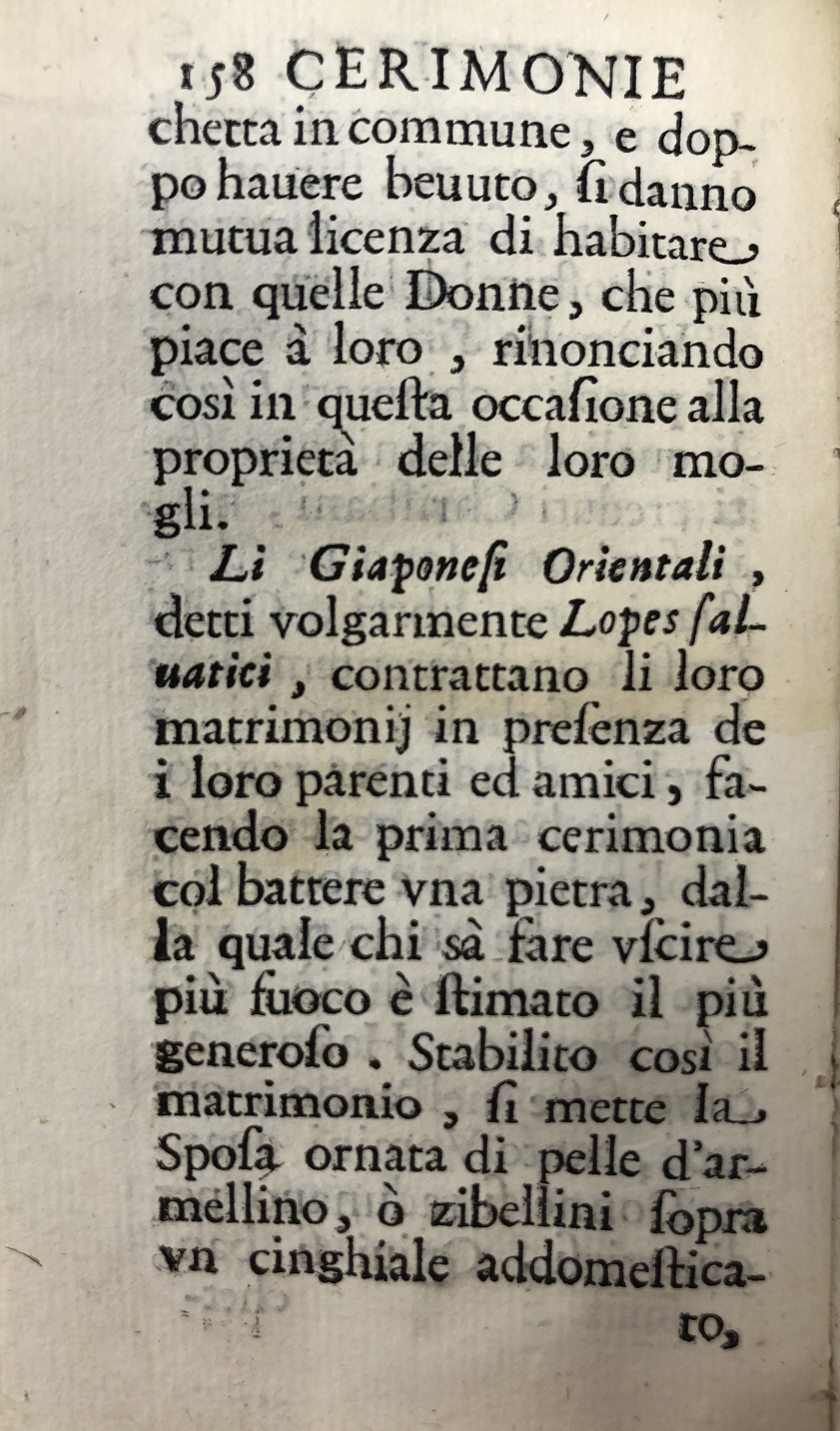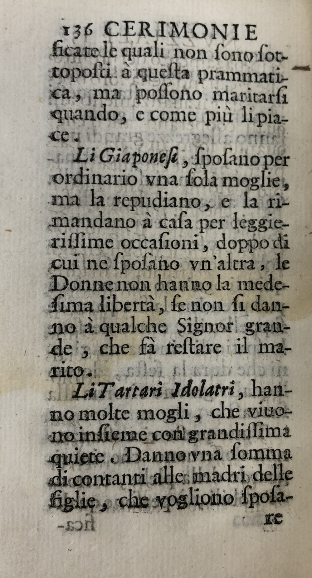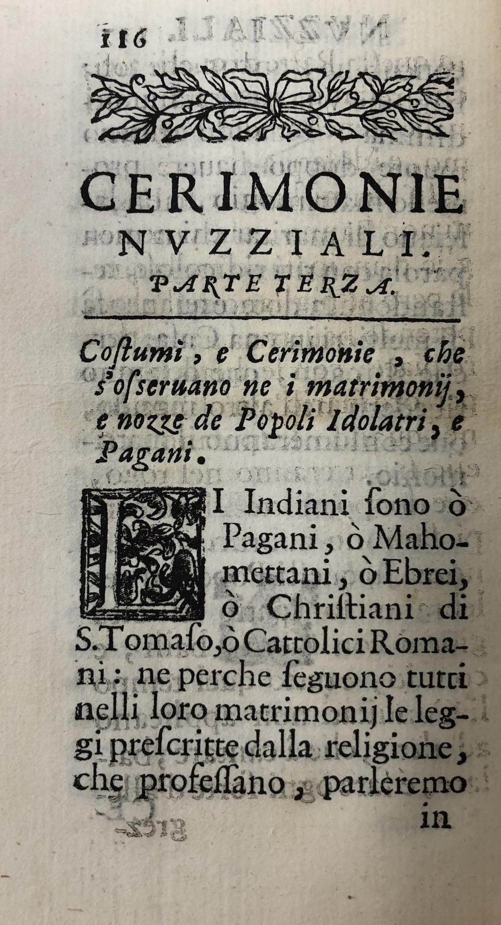 本書はそのタイトルが示す通り、1685年当時に著者が知り得た世界中の婚姻儀式と文化についてまとめた、大変ユニークな書物です。著者とされている人物の詳しいことは分かっていませんが、同時代の様々な文献を用いて本書を作成したようで、日本の婚姻制度や婚姻儀式についても収録しています。 テキストは全3部構成となっており、第1部はヨーロッパを中心としたキリスト教世界を扱い、カソリック、ルター派、カルヴァン派(プロテスタント)を主として、古代ギリシャや周辺のエチオピアやエジプトのコプト正教会についても言及しています。第2部は、イスラーム教世界を中心に扱っています。 日本については、第3部の偶像崇拝諸国における婚姻儀式の中に収録されています。ここでは、一神教世界とは異なる世界各地の諸宗教における婚姻儀式と文化が紹介されており、その中で日本も一節を設けて記されています。おそらくイエズス会士による日本報告書などを情報源にしているものと思われますが、男性が自由に些細な理由で婚姻を解消できるのに対して、女性にはその権利が認められていない不平等性などが紹介されており、また比較的細かに婚姻儀式の様子を記しています。 本書はこれまで日本研究書としては全く扱われてこなかった文献と思われますが、婚姻というカソリック世界において極めて重要な儀式が、世界各地のそれら、あるいは古代ギリシャのそれらと「比較」して論じられていること自体が、17世紀末のヨーロッパにおけるキリスト教世界の唯一性に対する揺らぎを物語っているものと思われます。こうしたある種の「比較宗教」「比較文化」論の試みは、18世紀に入ってピカート(Bernard Picart, 1673 - 1733)とバーナード(Jean Frederic Bernard, 1680 – 1744)とによって刊行された『偶像崇拝の国々の宗教文化と儀式(Céremonies et coutumes religieuses de tous les peuples du monde...1723-1737) 』によって本格化していき、啓蒙の世紀と呼ばれる18世紀を形成していきますが、本書はそれに先駆けて17世紀末にすでにこうした試みの萌芽が存在していたことを物語る、大変ユニークな資料です。