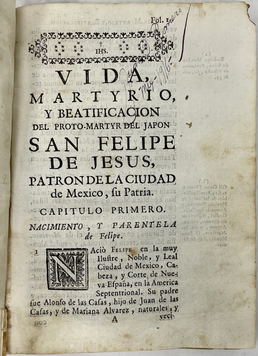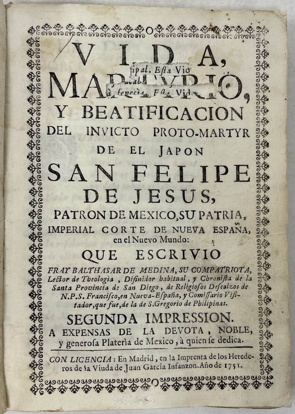 VIDA, MARTYRIO, Y BEATIFICACION DEL INVICTO PROTO-MARTYR DE EL JAPON SAN FELIPE DE JESUS, PATRON DE MEXICO, SUPATRIA, IMPERIAL CORTE DE NUEVA ESPAÑA, en el Nuevo Mundo:…SEGUNDA IMPRESSION.