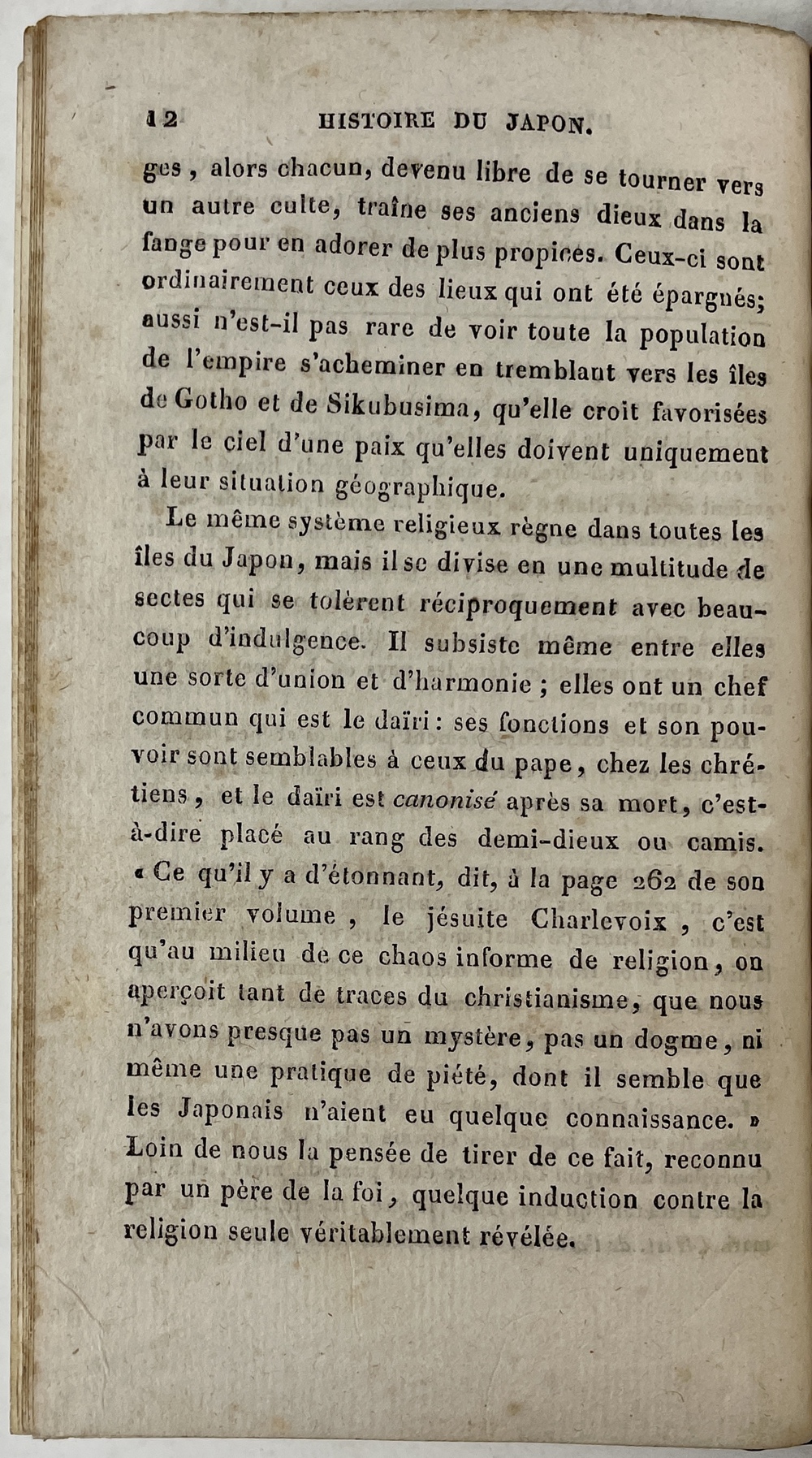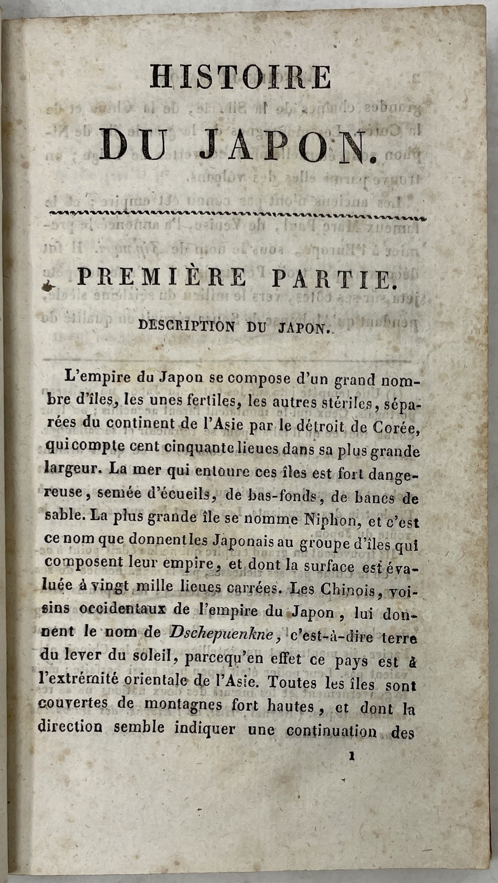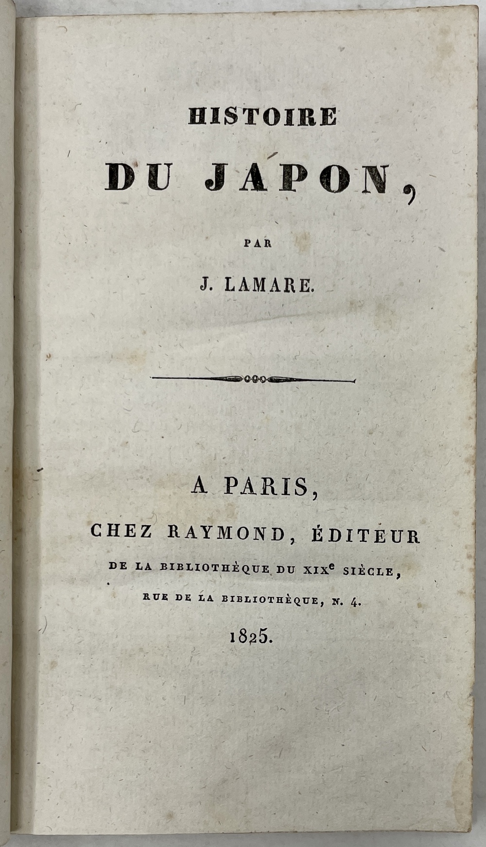本書は1825年にパリで刊行された新書サイズの書物で、ラメール(J. Lamare)による『日本誌』と題された、日本論を主題とする作品です。著者ラメールについての詳細歳は不明ですが、200ページ以上の分量を有する日本関係欧文図書でありながら、Cordierをはじめとした主要な日本関係欧文図書目録にも収録されておらず、国内外の研究機関の所蔵もほとんど見られないという、大変珍しい書物でもあります。