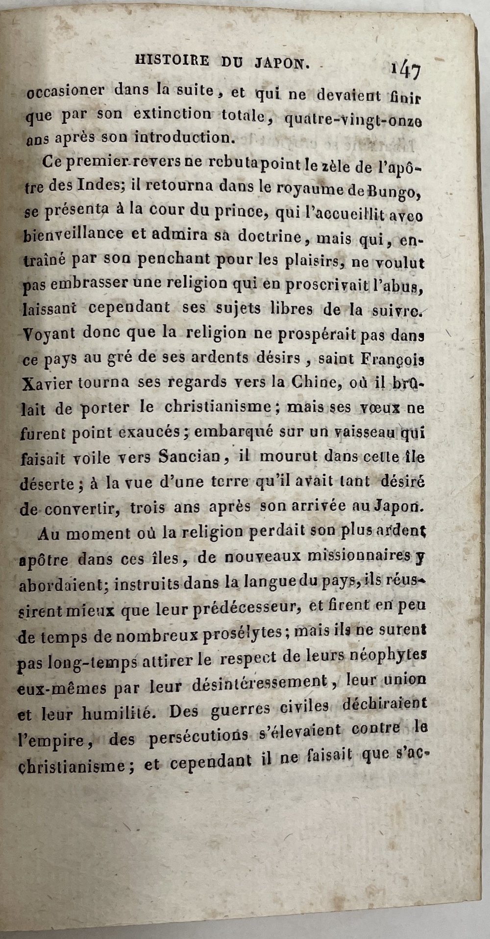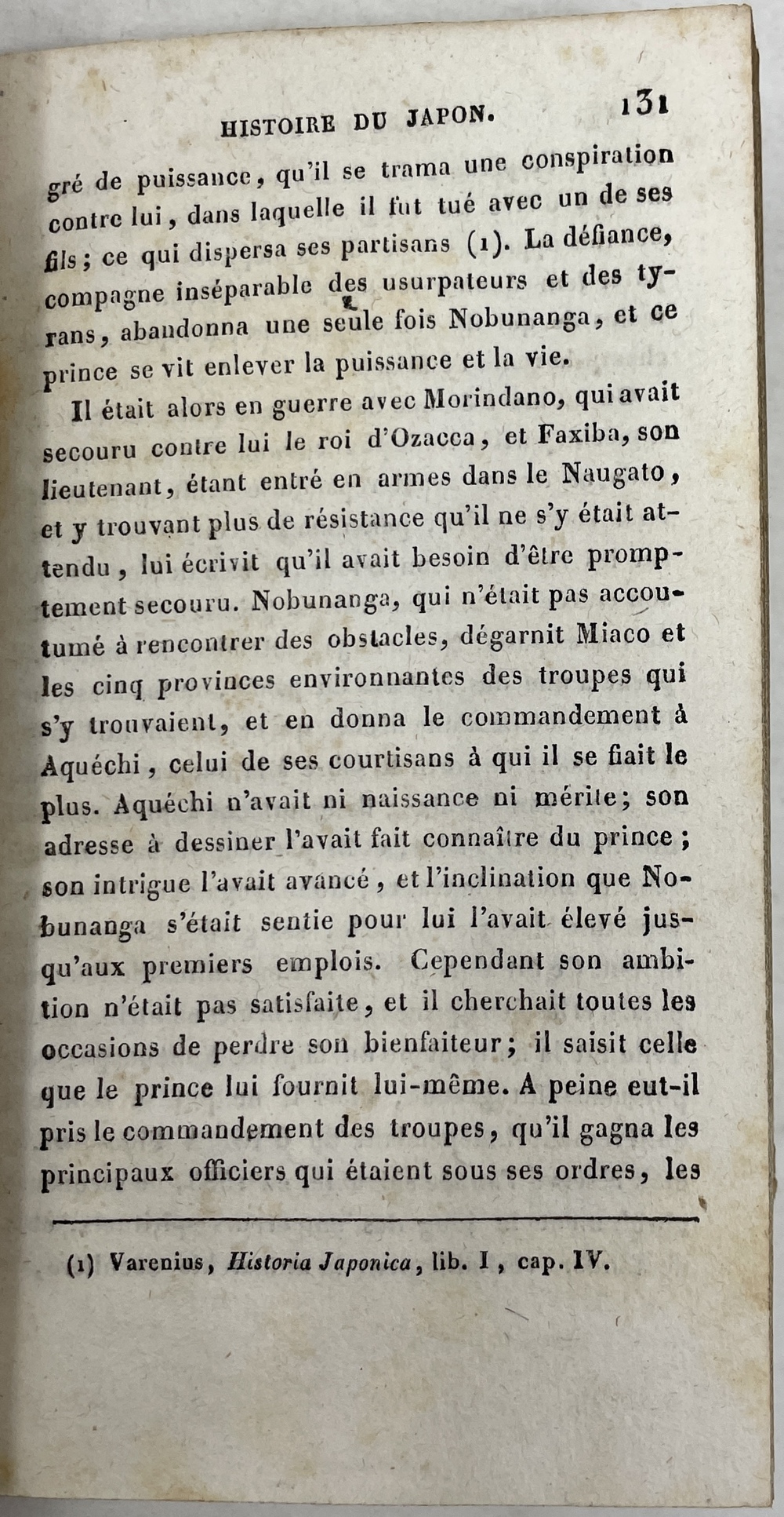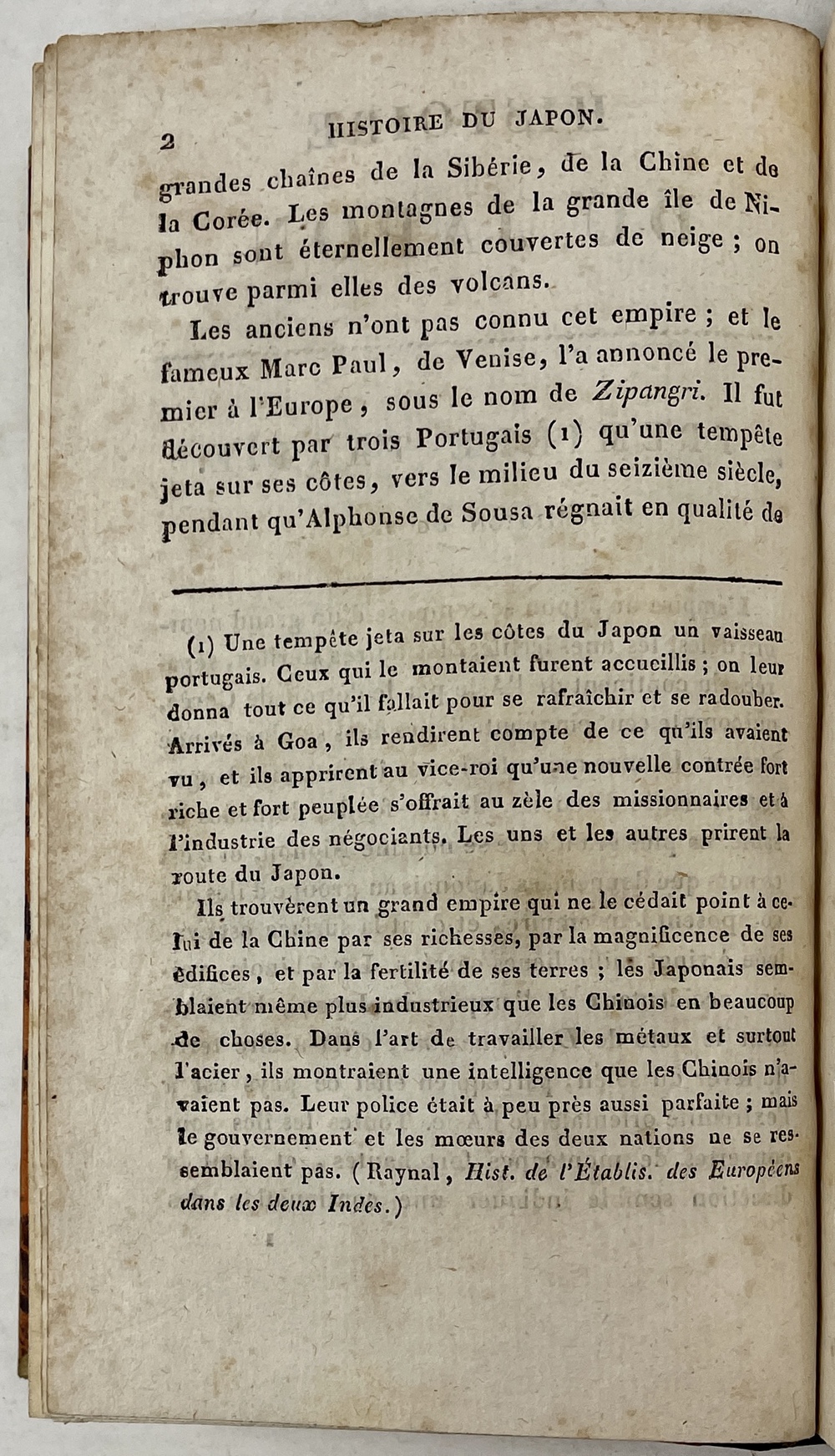 本書は1825年にパリで刊行された新書サイズの書物で、ラメール(J. Lamare)による『日本誌』と題された、日本論を主題とする作品です。著者ラメールについての詳細歳は不明ですが、200ページ以上の分量を有する日本関係欧文図書でありながら、Cordierをはじめとした主要な日本関係欧文図書目録にも収録されておらず、国内外の研究機関の所蔵もほとんど見られないという、大変珍しい書物でもあります。