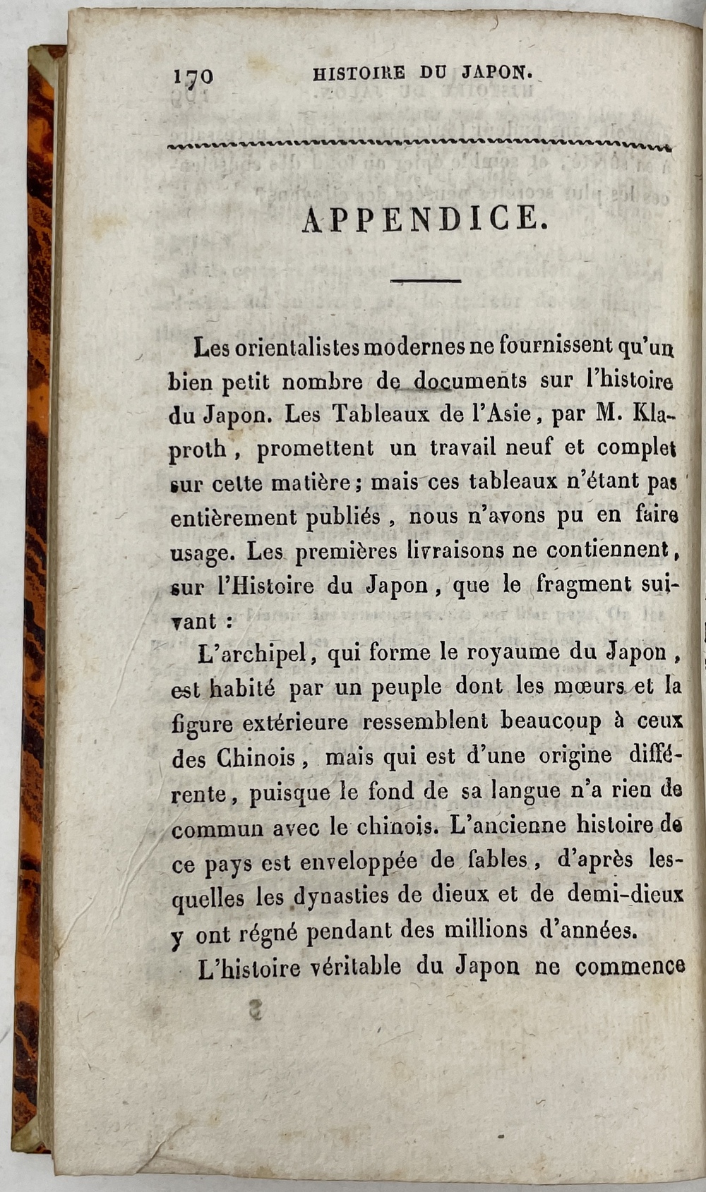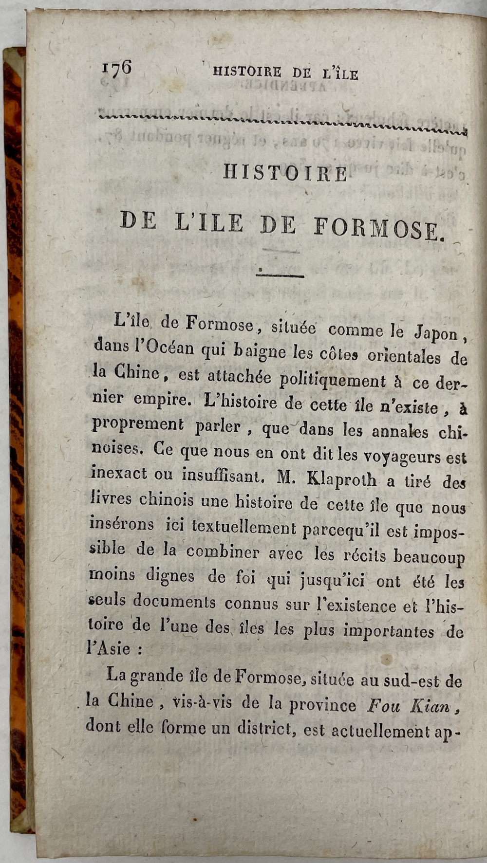 本書の主要部分を構成しているのは上記の第1部、第2部で、残りは補遺(170ページ〜)となっていて、ここではやはり同時代のフランス東洋学を代表する著作家であったクラプロート(Julius Heinrich Klaproth, 1783 - 1835)による『アジア歴史地図』 (Tableaux historiques de l’Asie,...Paris, 1826)に言及しつつ、日本を中心としたアジア地域全体の歴史と地理についての概説がなされています。クラプロートによるこの著作は本書執筆当時にはまだ完結しておらず(おそらく一部のみが雑誌で先行して発表されていた)、全体が刊行されたのは本書刊行の翌年1826年のことですが、ラメールはクラプロートによるこの作品が、これまでになかった日本とアジアの地理と歴史に関する重要著作であると考え、補遺で論じているようです。このことは、ラメールが同時代のフランスを中心とした東洋学者ネットワークの中に位置づけられうる人物であった可能性を示唆するもので大変興味深いことです。また、補遺においては「台湾誌(Histoire de l’ile de Formose)」と題した記事も収録されていて、日本と地理的にも歴史的にも関係が深い台湾についての独自の論考が収録されています。