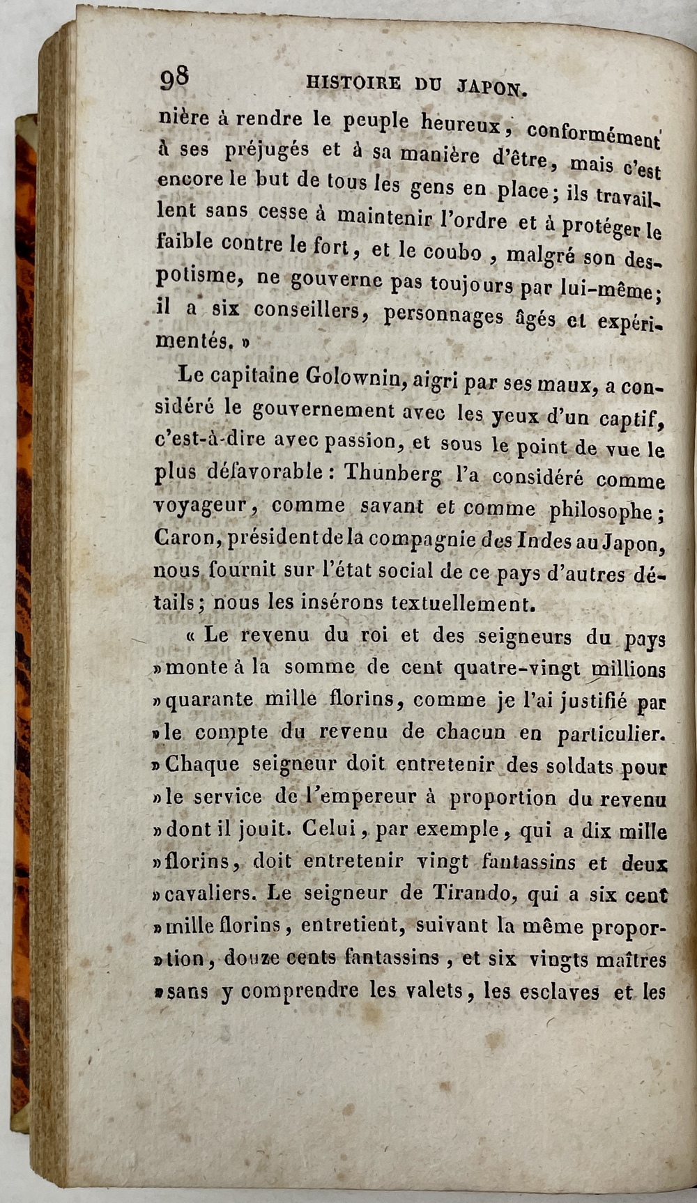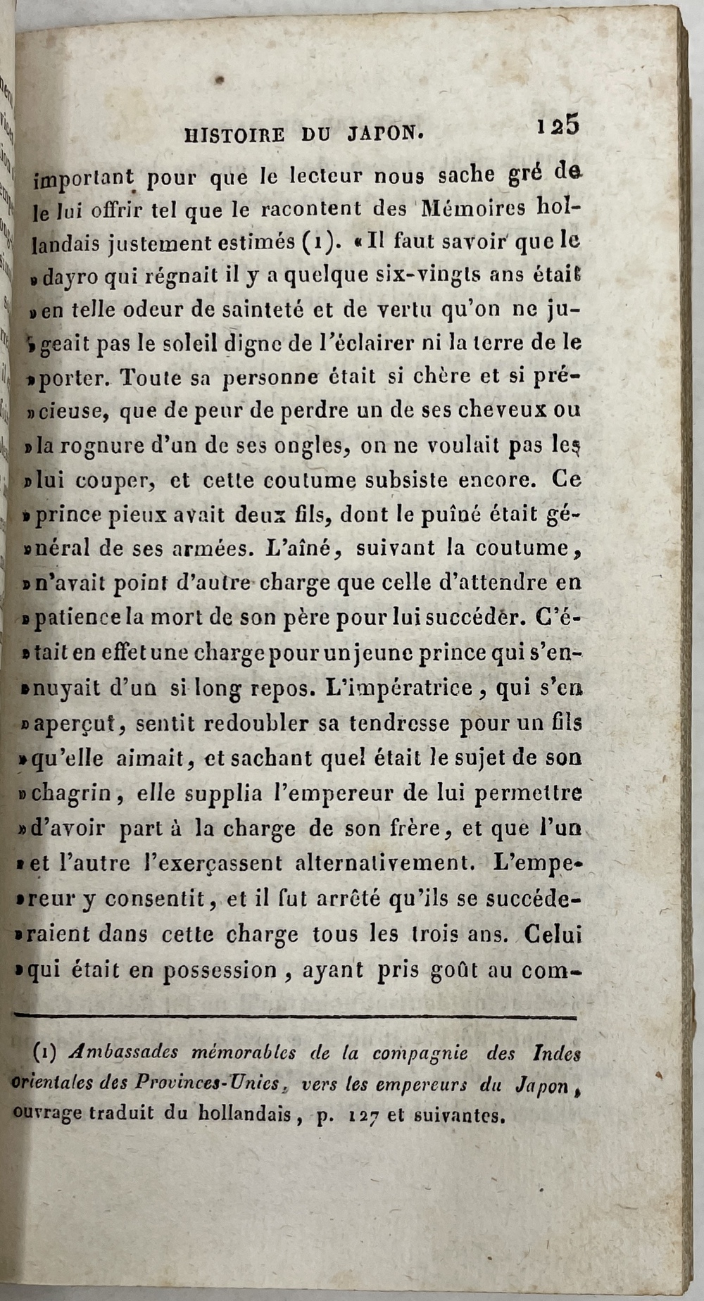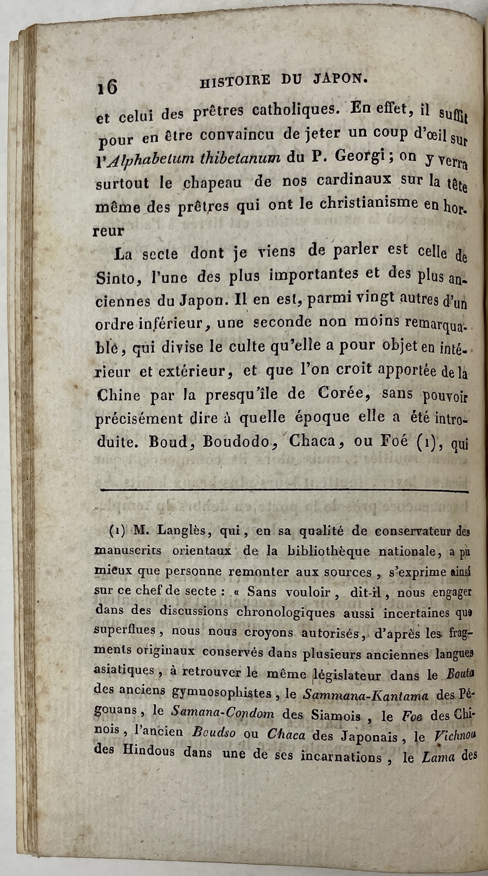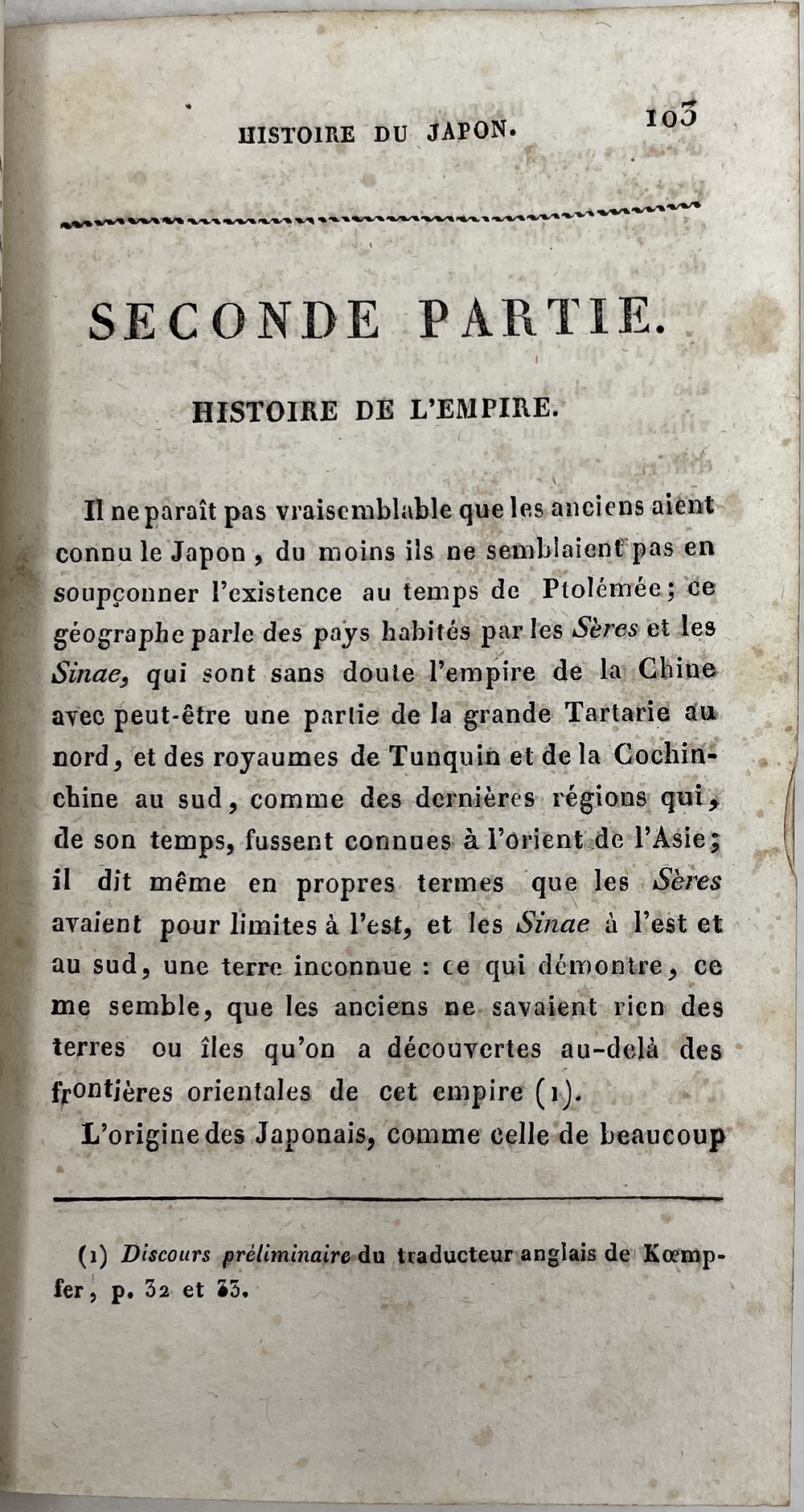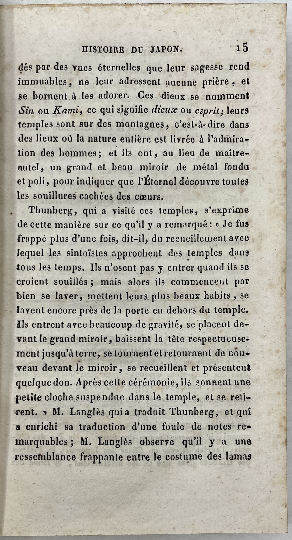 本文の記述や脚注を見る限りでは、第1部でラメールが主として参照しているのは、スウェーデンの植物学者、博物学者、医者で、植物分類学の大家リンネ(Carl von Linné, 1707-1778)の高弟でもあったツンベルク(ツュンベリーとも、Carl Peter Thunberg, 1743 - 1828)の名著『日本紀行』のフランス語訳版(Voyages de C. P. Thunberg, au Japon,...Paris, 1796)のようです。この作品は、当時のヨーロッパにおけるベストセラー作品で、スウェーデン語からフランス語、ドイツ語、英語など各国語に翻訳されたり版を重ねたりしていますが、ラメールが用いたのは、当時のフランスを代表する東洋学者の1人であったラングレス(Louis-Mathieu Langlès, 1763 - 1824)が仏訳と注釈を手がけた仏訳決定版のようで、本書の本文や注釈中でも、ツンベルク自身の記述だけでなくラングレスによる記述にも頻繁に言及しています。ラメールは、ツンベルクと並んで当時最新の日本情報源として広く読まれていた、ゴロウニン(Vasilii Mikhailovich Golovnin, 1776 - 1831)『日本幽囚記』も参照しており、概ね当時のヨーロッパで入手できた同時代の日本研究文献を踏まえた上で本書を執筆していることがうかがえます。