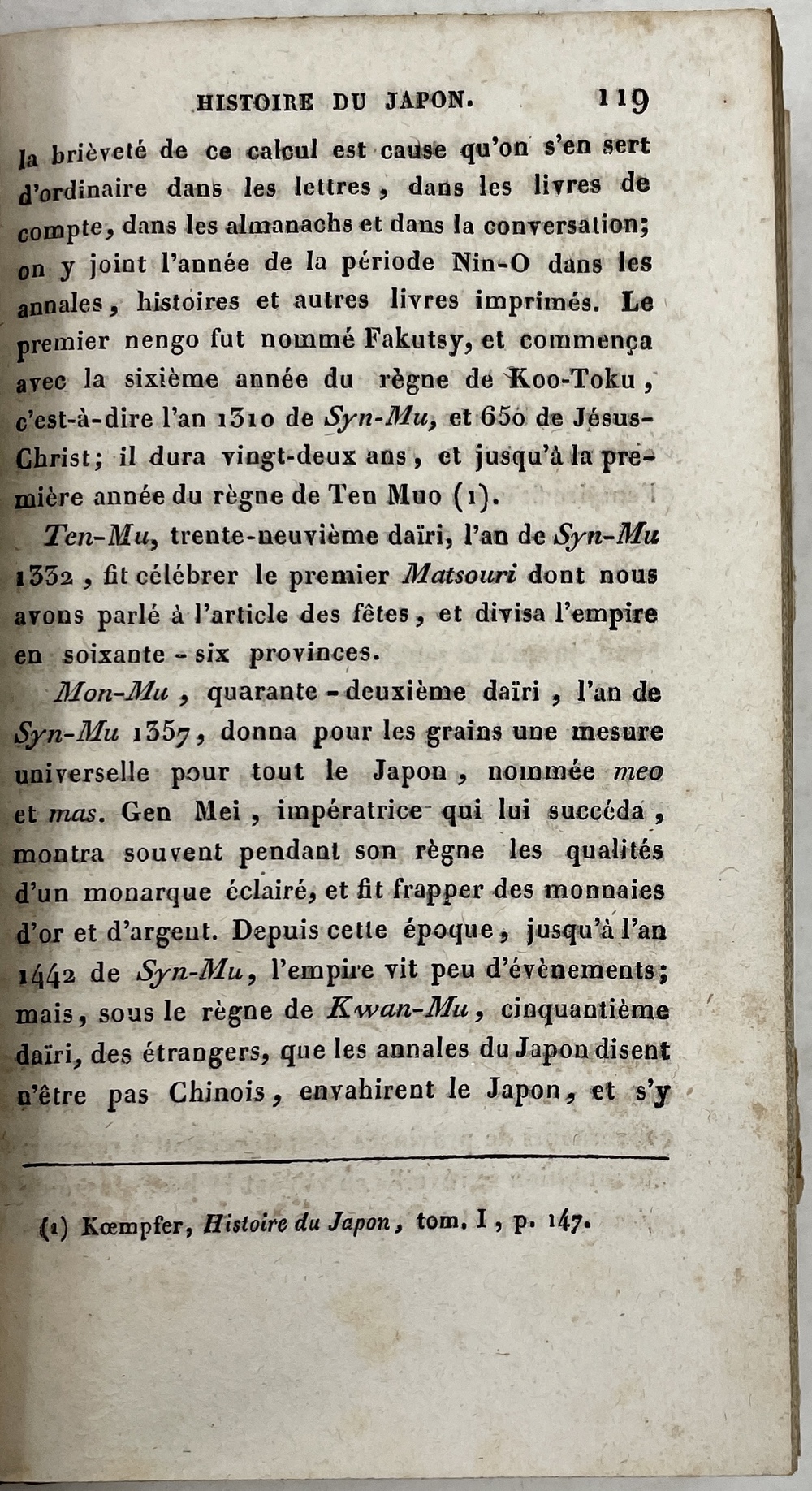 第2部(103〜175頁)は、「(日本)帝国の歴史」(Histoire de L’Empire)と題して、日本の歴史を論じる内容となっていて、日本の人々の起源から、同時代に至るまでの歴史が描き出されています。この第2部は「歴史編」ともいうべき内容ですが、ラメールがここで最も参照しているのは、ケンペル『日本誌』のようで、概ね同書に沿った構成で日本の歴史が論じられています。ただし、ケンペル『日本誌』だけに頼るのではなく、それよりもの古い17世紀後半の日本情報源として大きな影響力を有していたモンタヌスの著作なども参照しており、ここでもやはりラメール独自の考察が加えられた日本史となっていることが見て取れます。たとえば、文禄、慶長の役のように隣国に及ぶ事項を論じる際には、フランスのイエズス会士デュ・アルド(Jean Baptiste Du Halde, 1647 - 1743)が、中国についての歴史、地理、文化、政治、自然などを包括的にまとめた著作(Description Géographique Historique, Chronologique, Politique et Physique de l’Empire de laChine et de la Tartarie Chinoise…4 vols, Paris, 1735)といった中国や朝鮮半島について論じた日本関係資料以外の文献も参照するなど、著者の学究的態度が表れています。