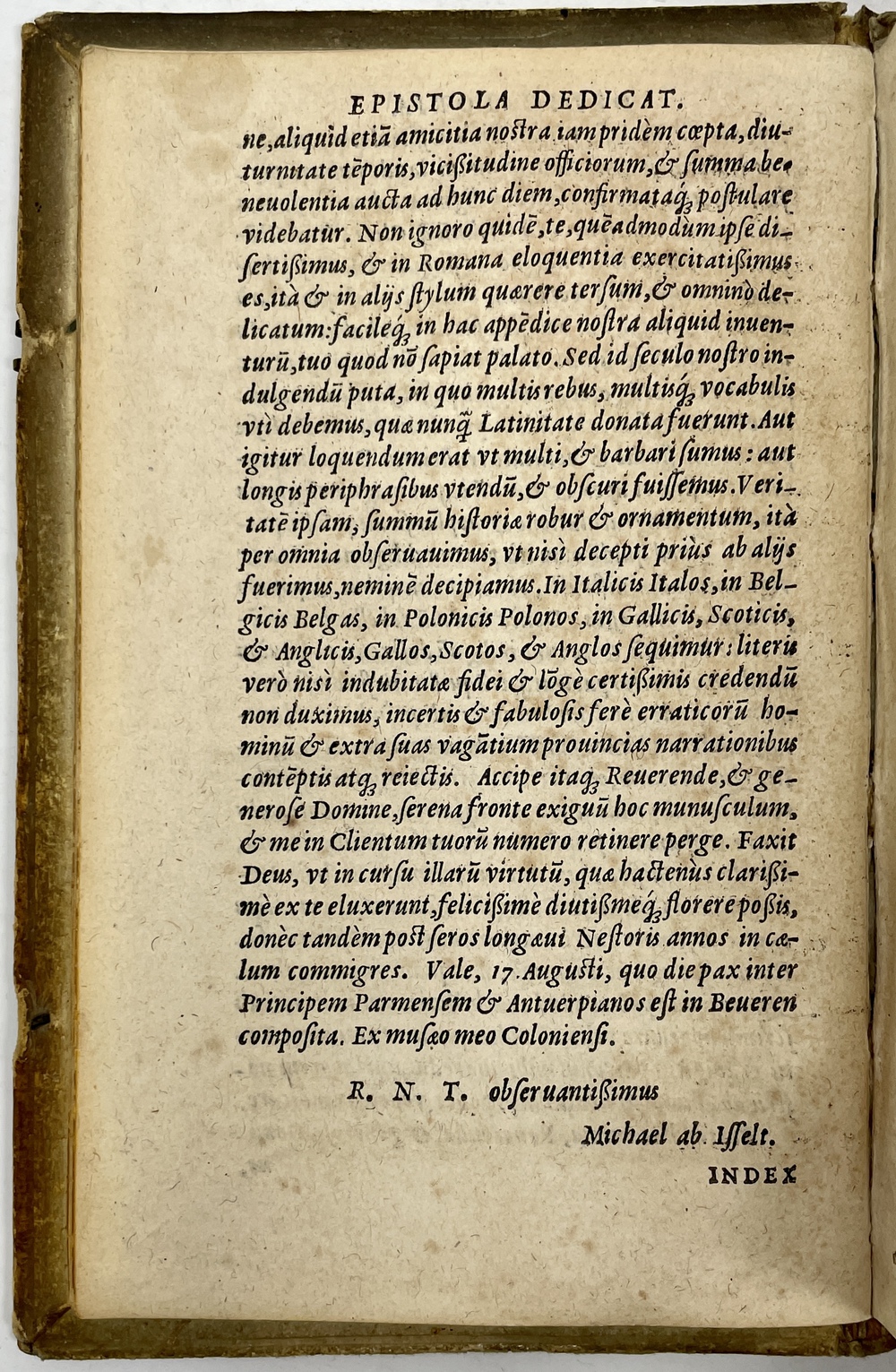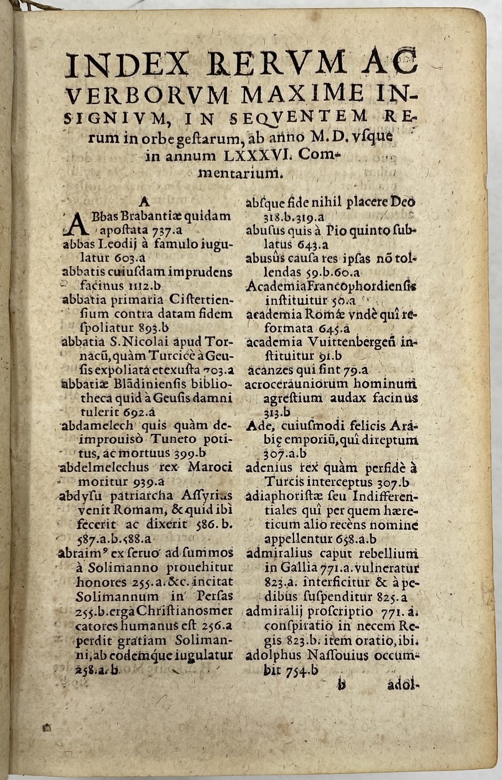 COMMENTARIVS BREVIS RERVM IN ORBE GESTARVM, AB ANNO SALVTIS M. D. VSQVE IN ANNVM M.D. LXXIIII….Nunc verò recèns ab anno M.D. LXXX auctus, & ad annum M.D. LXXXVI. Opera & Studio…Cum INDICE copiosissimo.
