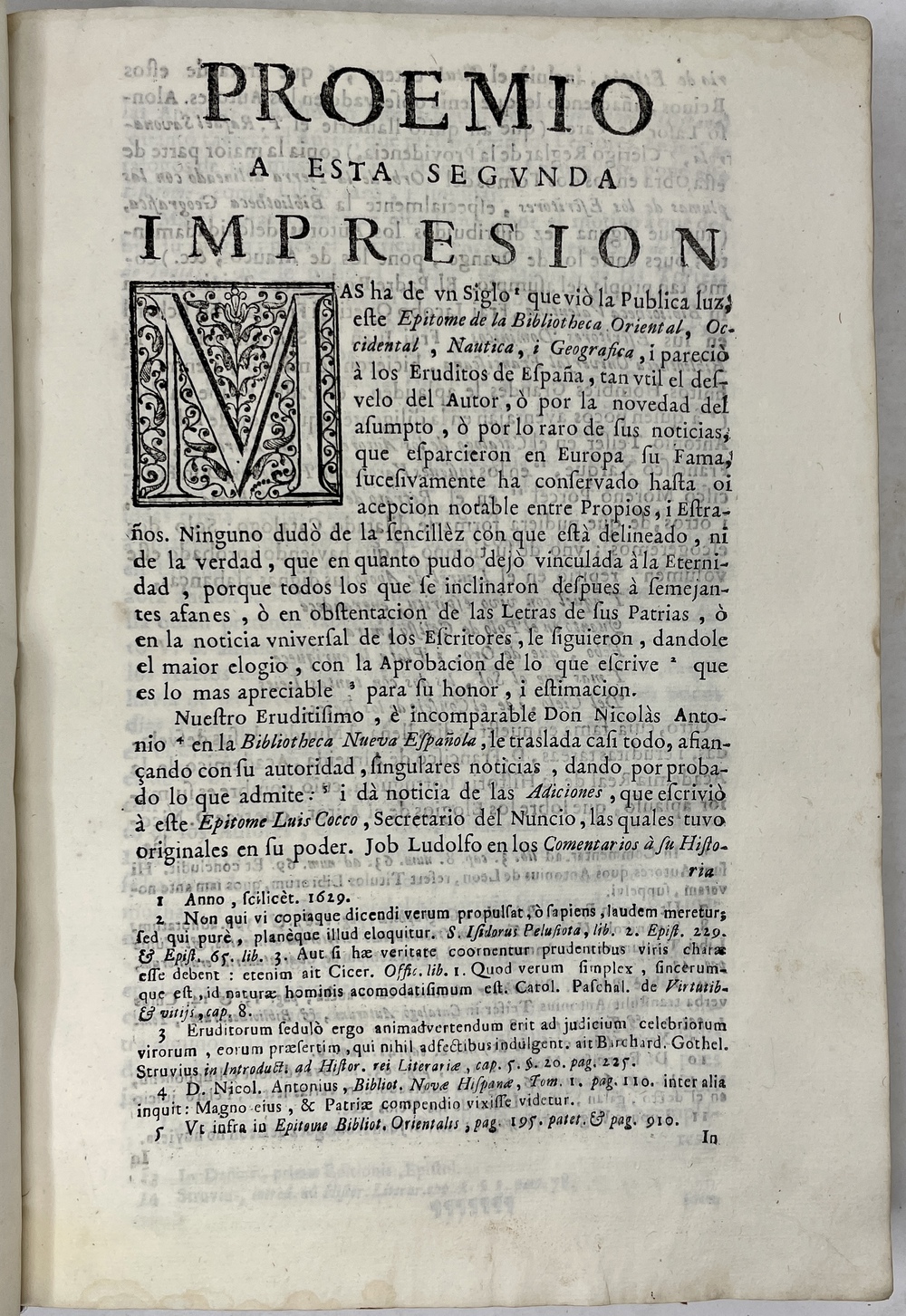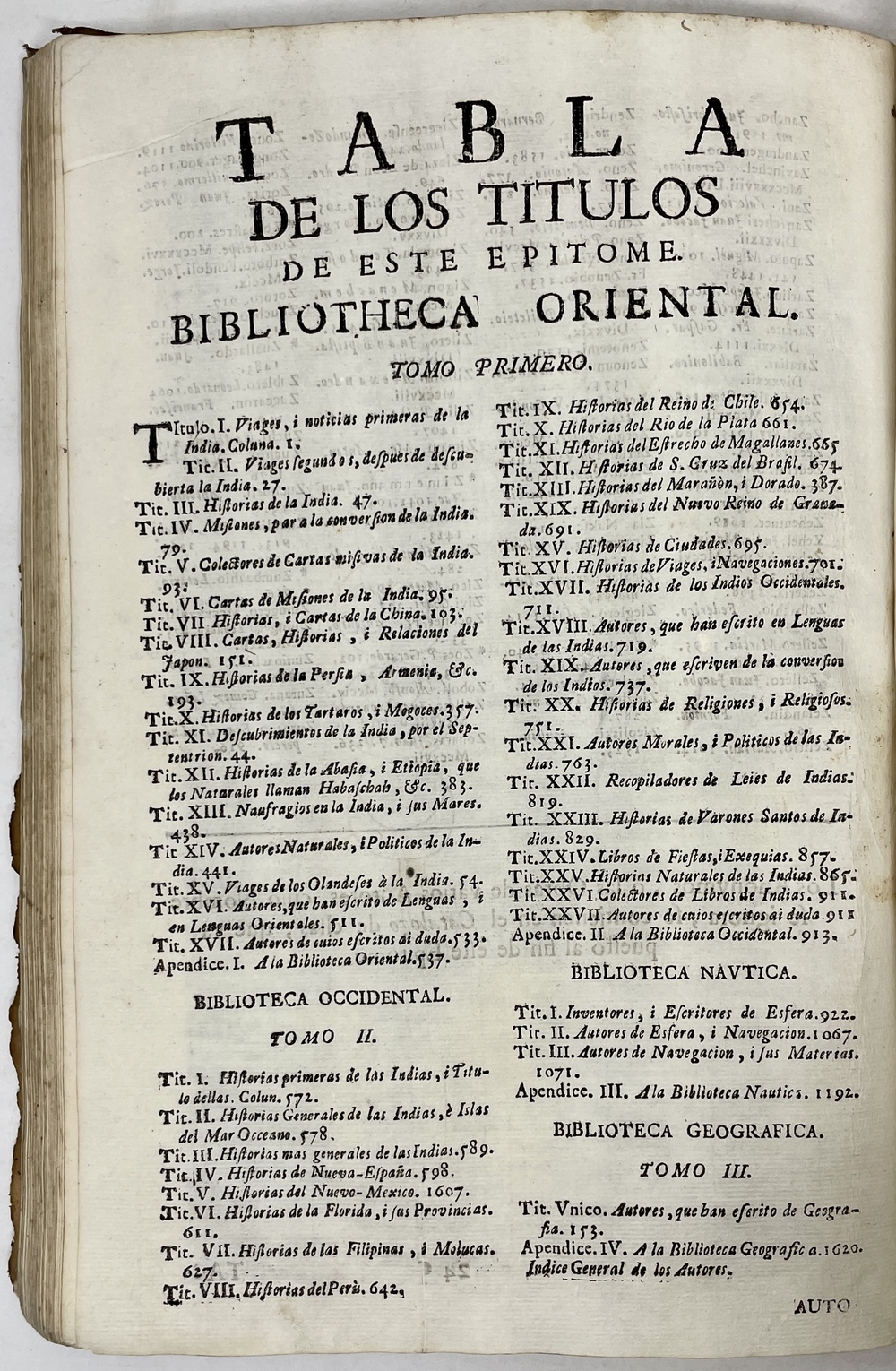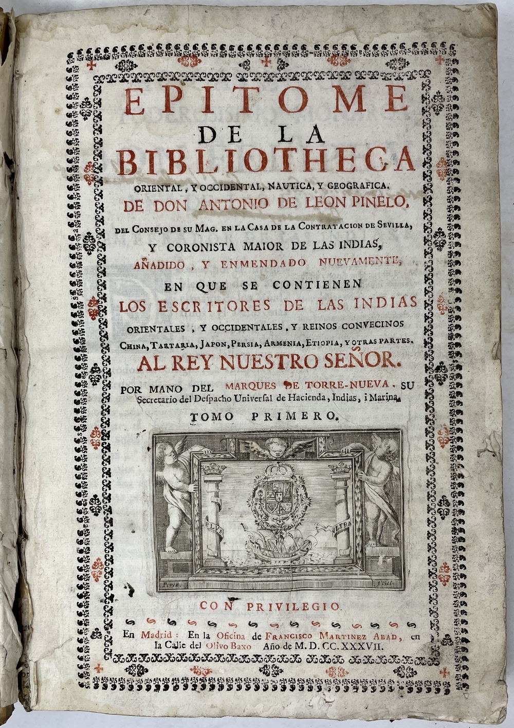 EPITOME DE LA BIBLIOTHECA ORIENTAL, Y OCCIDENTAL, NAUTICA, Y GEOGRAFICA…EN QUE SE CONTIENEN LOS ESCRITORES DE LAS INDIAS ORIENTALES, Y OCCIDENTALES, Y REINOS CONVECINOS CHINA, TARTARIA, JAPON, PERSIA, ARMENIA, ETIOPIA, Y OTRAS PARTES…TOMO PRIMERO.
