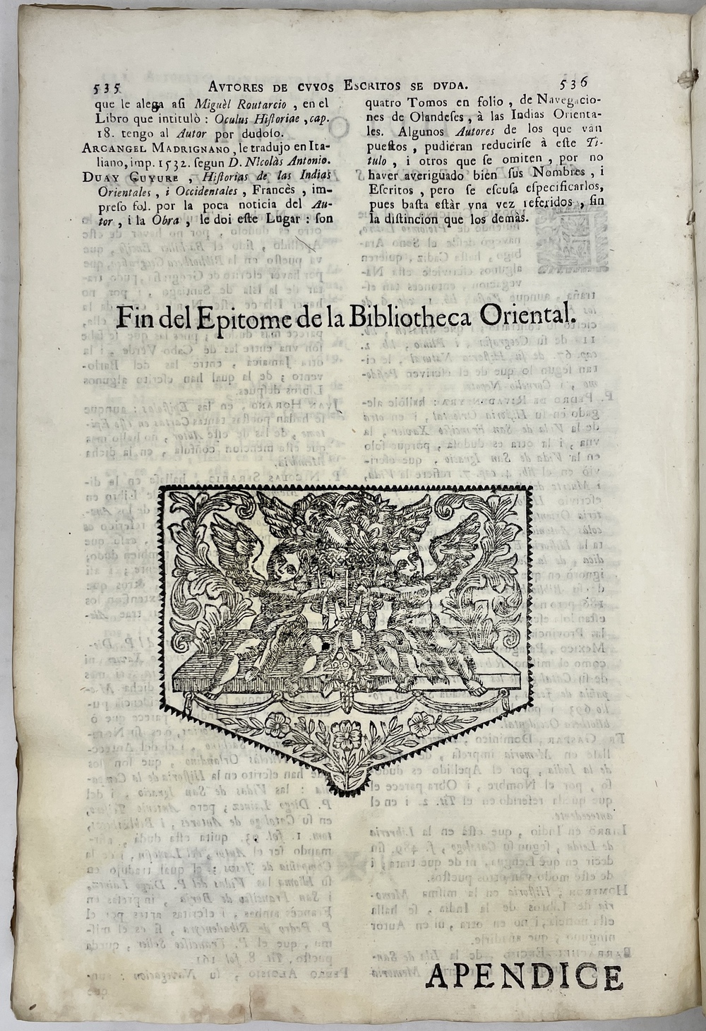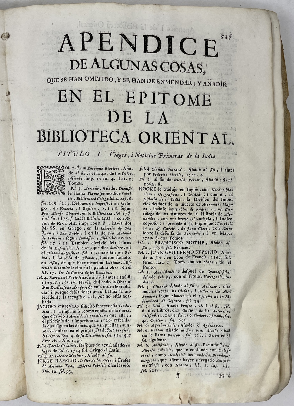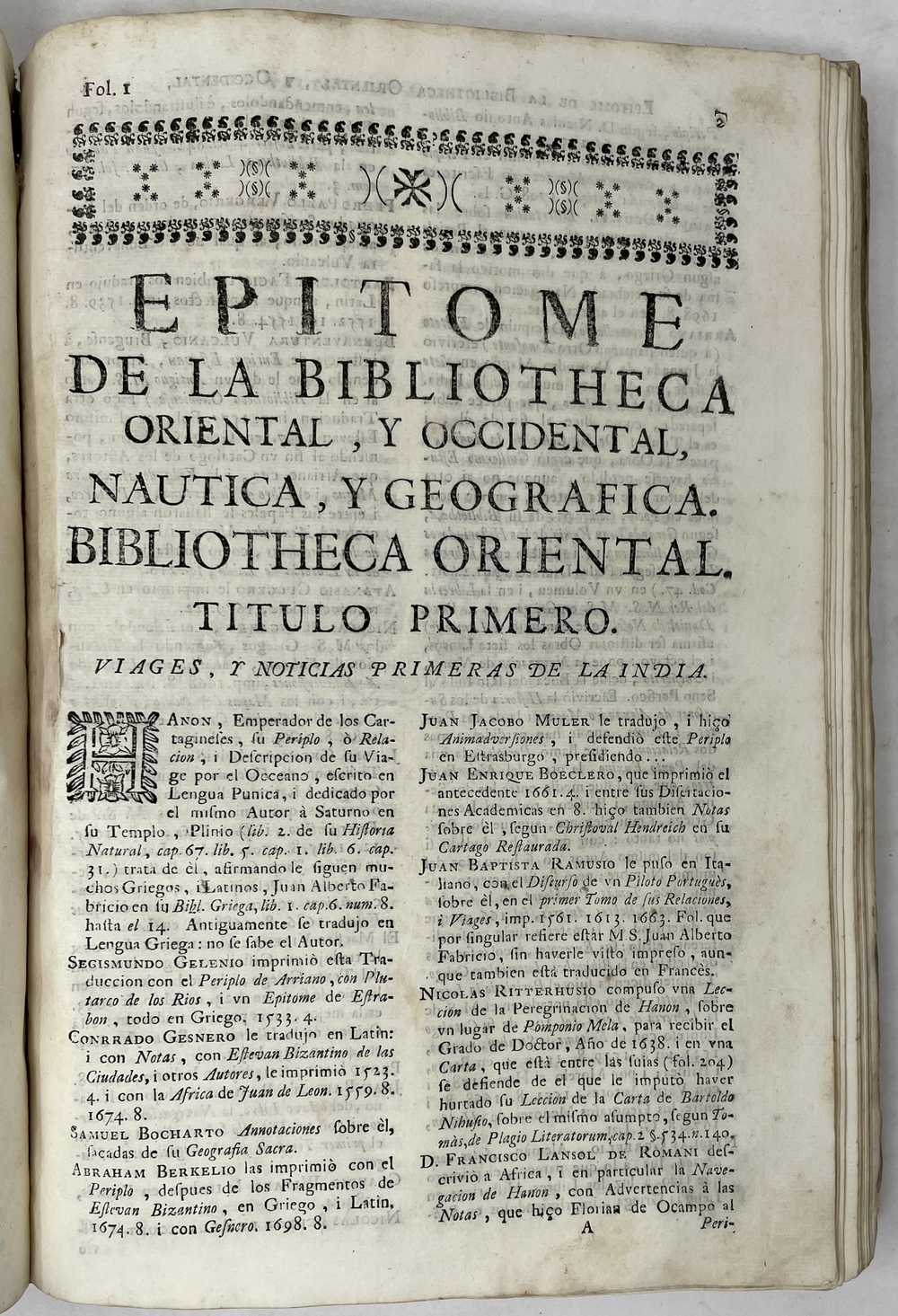 EPITOME DE LA BIBLIOTHECA ORIENTAL, Y OCCIDENTAL, NAUTICA, Y GEOGRAFICA…EN QUE SE CONTIENEN LOS ESCRITORES DE LAS INDIAS ORIENTALES, Y OCCIDENTALES, Y REINOS CONVECINOS CHINA, TARTARIA, JAPON, PERSIA, ARMENIA, ETIOPIA, Y OTRAS PARTES…TOMO PRIMERO.