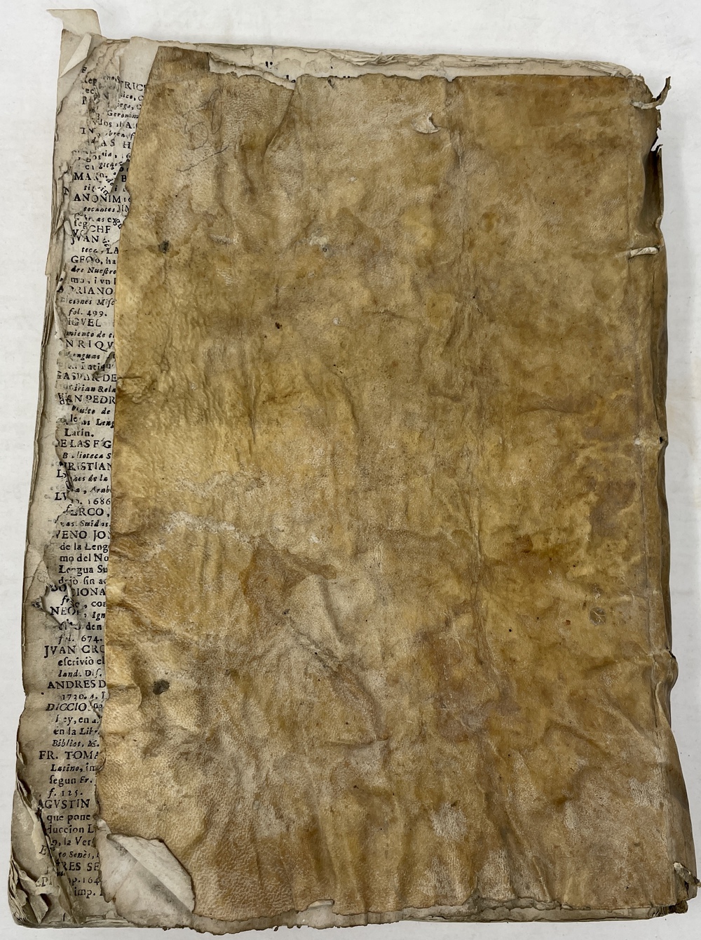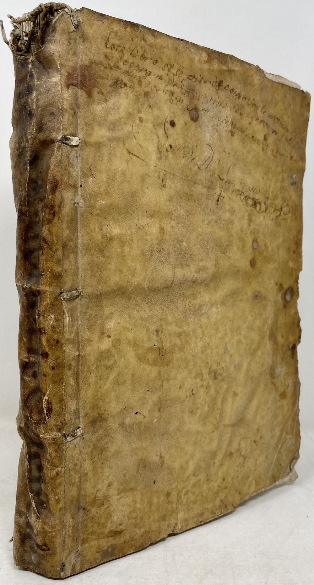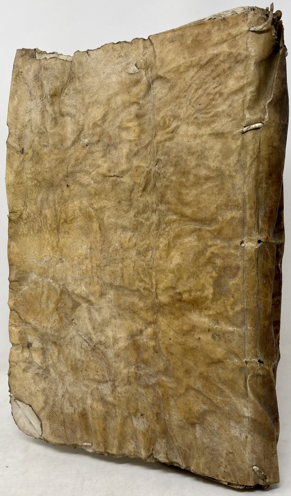 装丁の革が伸縮して傷みが激しい状態。本文1葉欠落、末尾5葉ほど端部分に欠損あり。