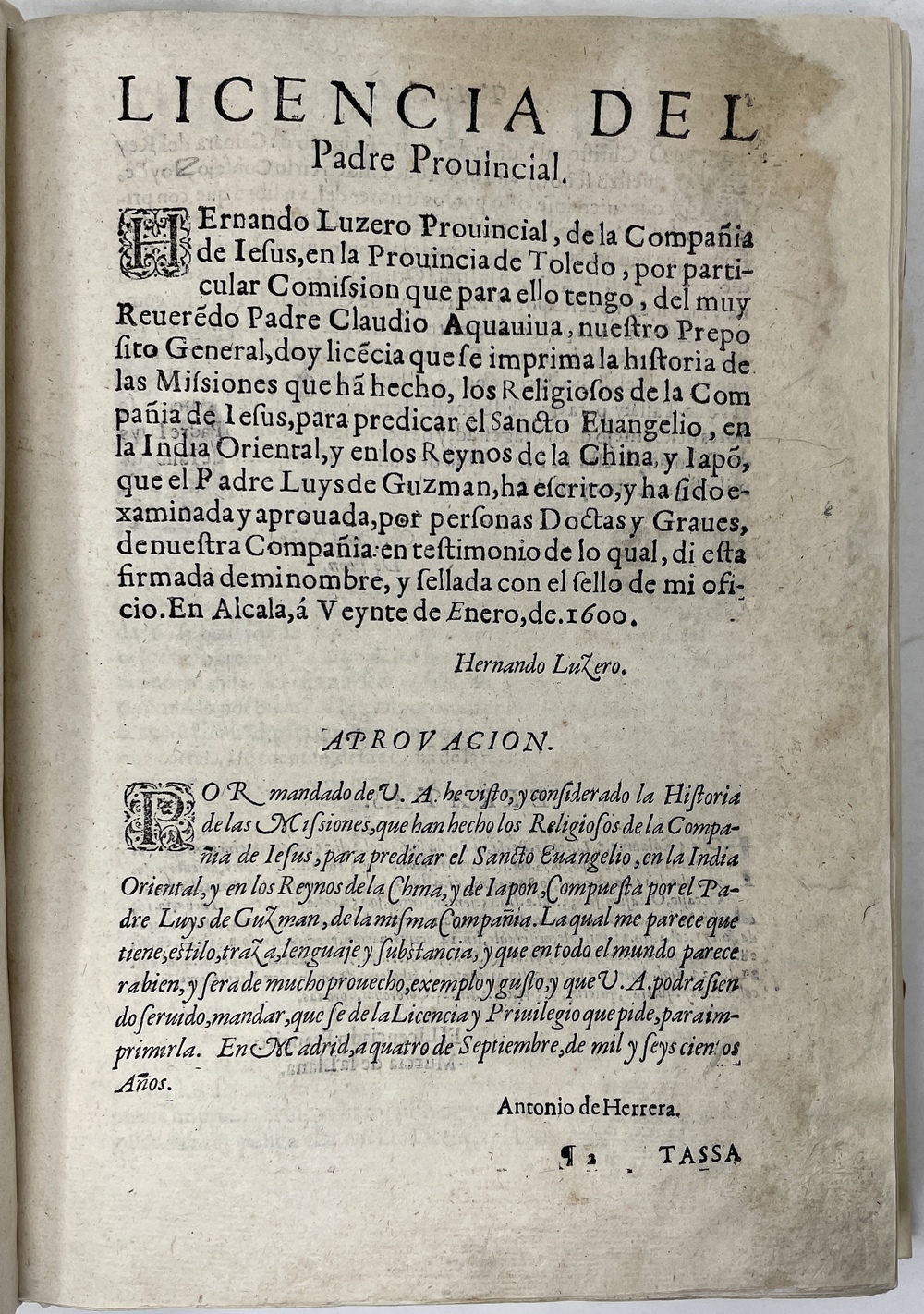 HISTORIA DE LAS MISSIONES QVE HAN HECHO LOS RELIGIOSOS DELA COMPAÑIA DE IESVS, PARA PREDICAR EL SANCTO Euangelio en la India Oriental, y en los Reynos de la China y Iapon….PRIMERA PARTE EN LA QVAL SE CONTIENEN SEYS LIBROS tres de la India Oriental, uno de