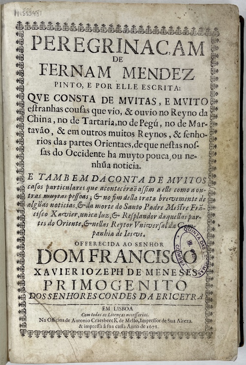 PEREGRINAC,AM DE FERNAM MENDEZ PINTO, E POR ELLE ESCRITA: QVE CONSTA DE MVITAS, E MVITO estranhas cousas que vio, & ouvio no Reyno da China, no de Tartaria, no de Pegeu, no de Martavão, & em outros muitos Reynos, & senhorios das pares Orientaes, ...