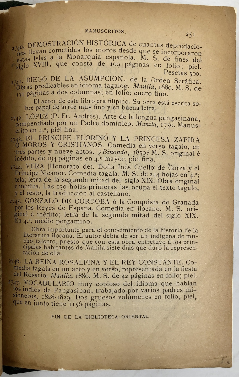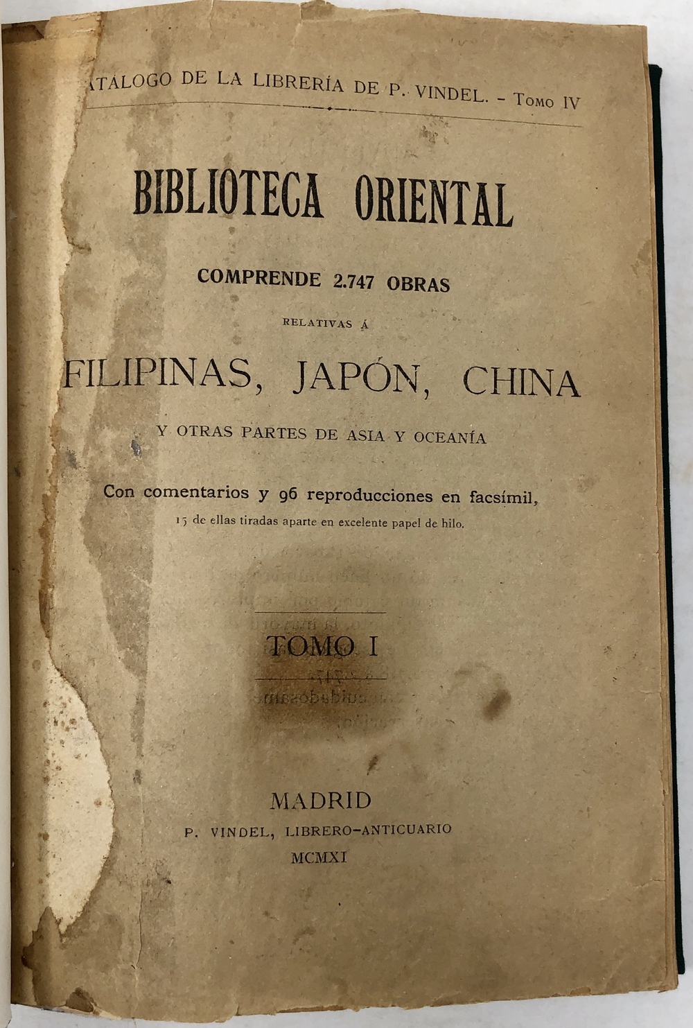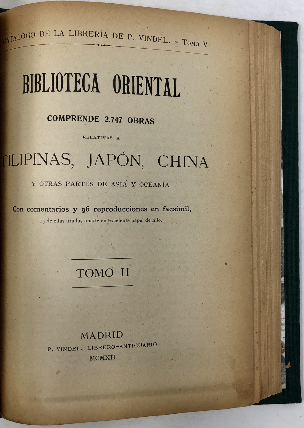BIBLIOTECA ORIENTAL COMPRENDE 2.747 RELATIVAS Á FILIPINAS, JAPÓN, CHINA Y OTRAS PARTES DE ASIA Y OCEANÍA. Con comentarios y 96 reproducciones en facsímil, 15 de ellas tiradas aparte en excelente papel de hilo. TOMO I / II.