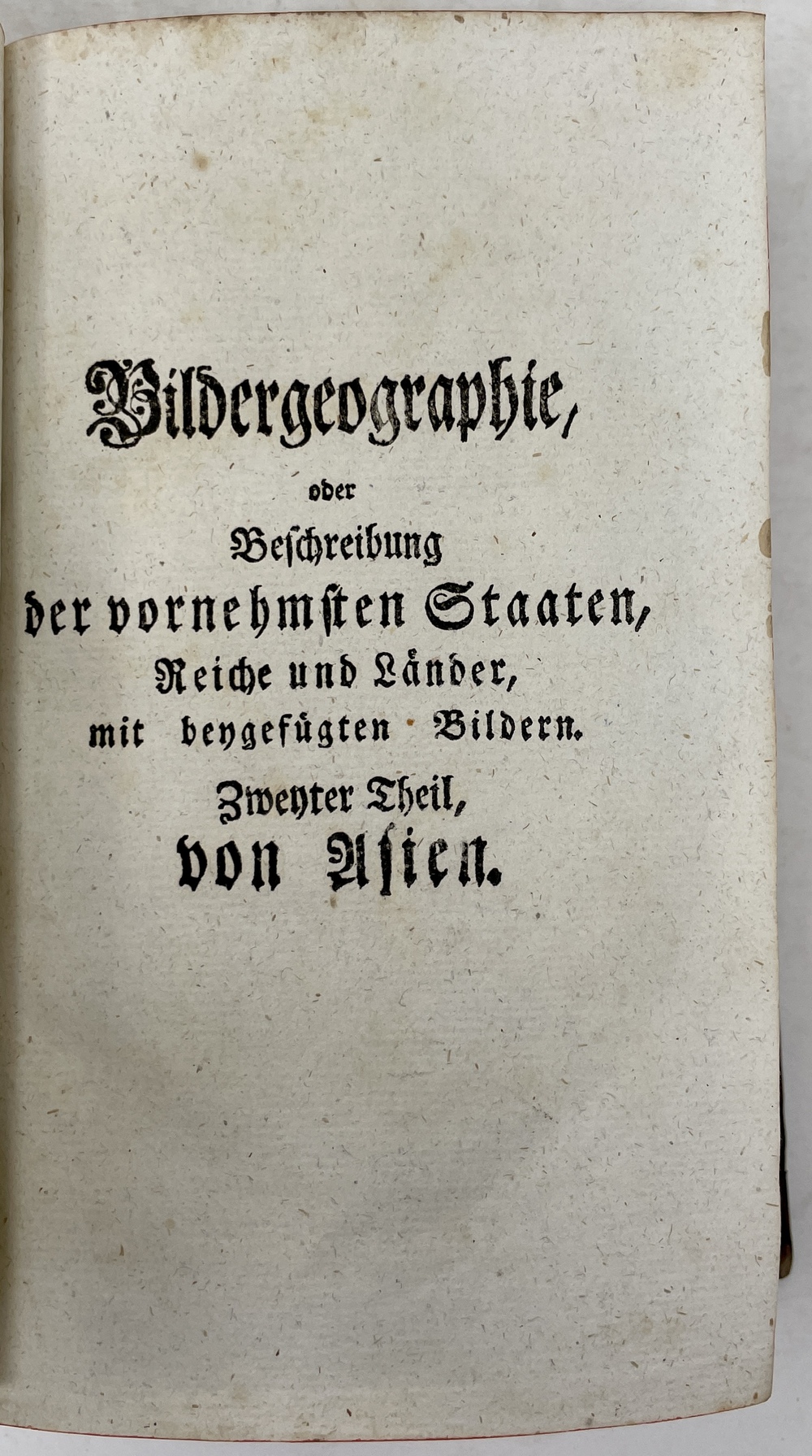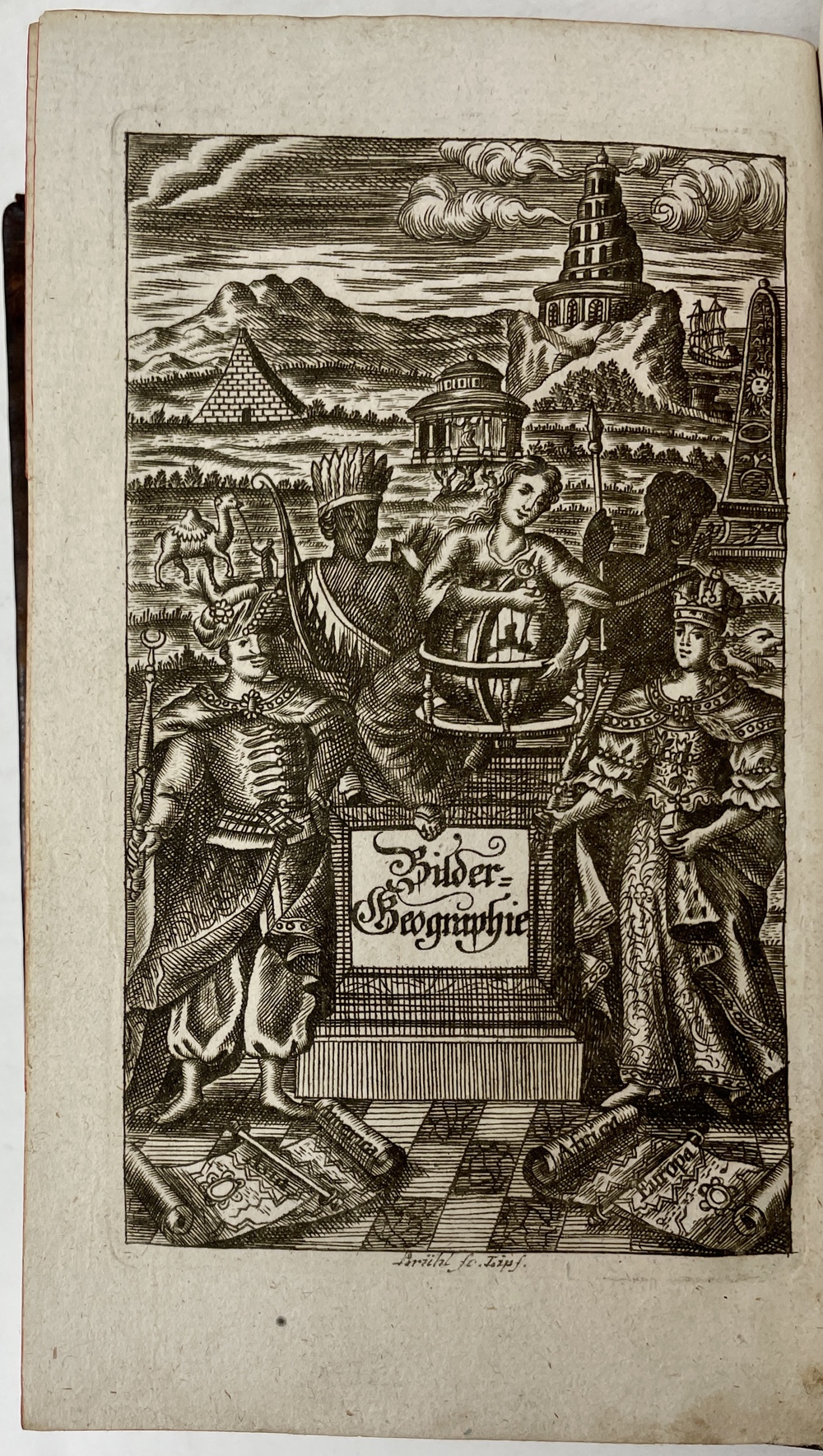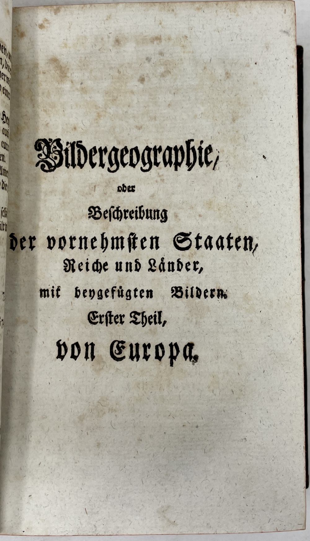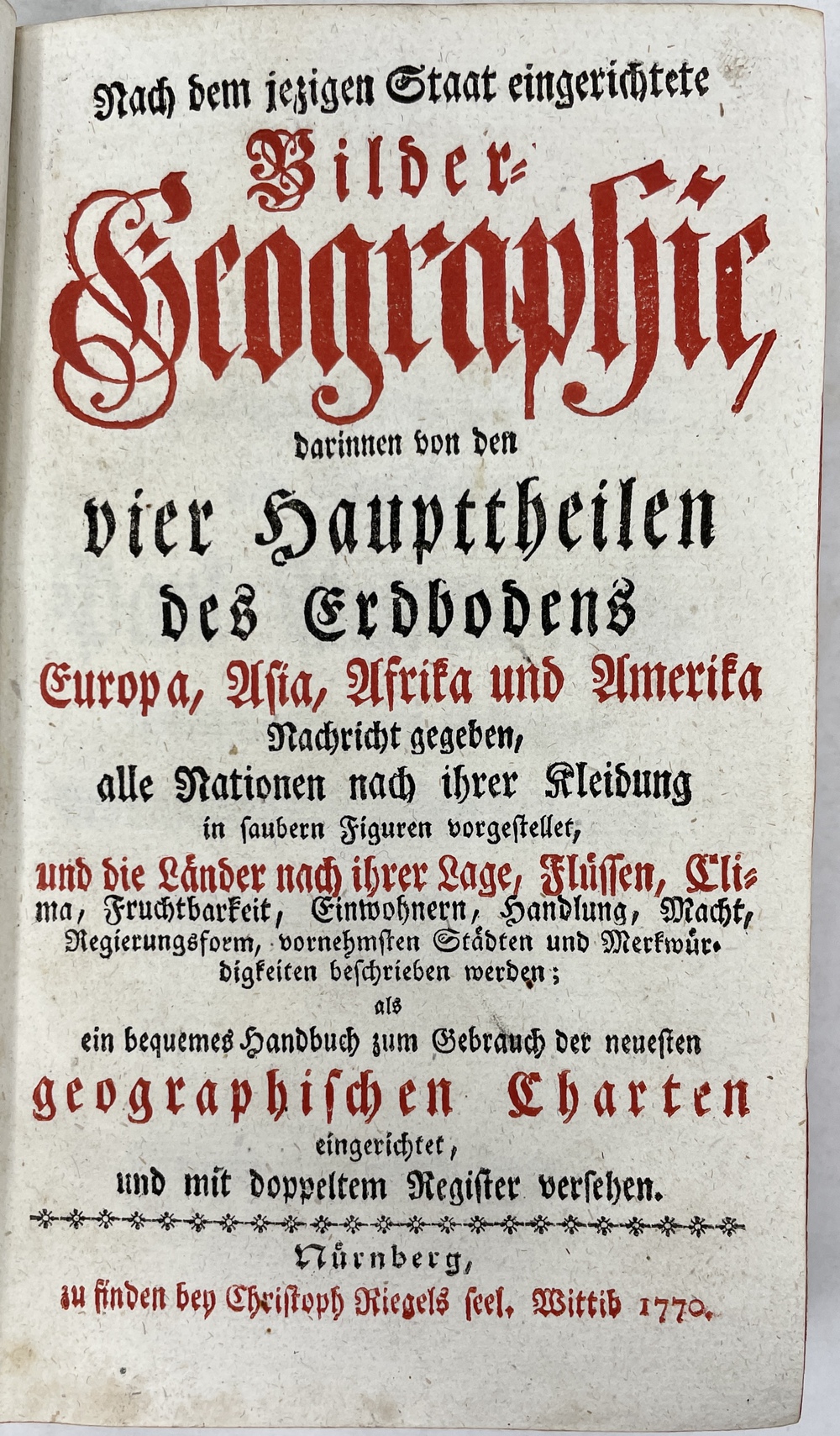 Nach dem jezigen Staat eingerichtete Bilder=Geographie, darinnen von den vier haupttheilen des Erdbodens Europa, Asia, Afrika und Amerika Nachricht gegeben, alle Nationen nach ihrer Kleidung in saubern Figuren vorgestellet,...
