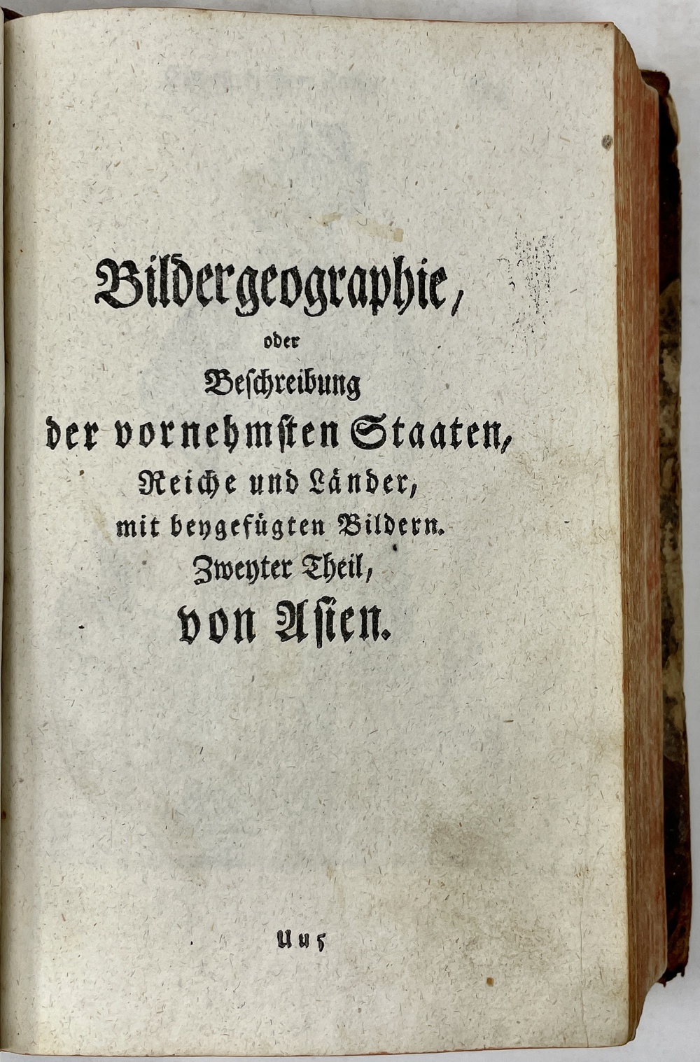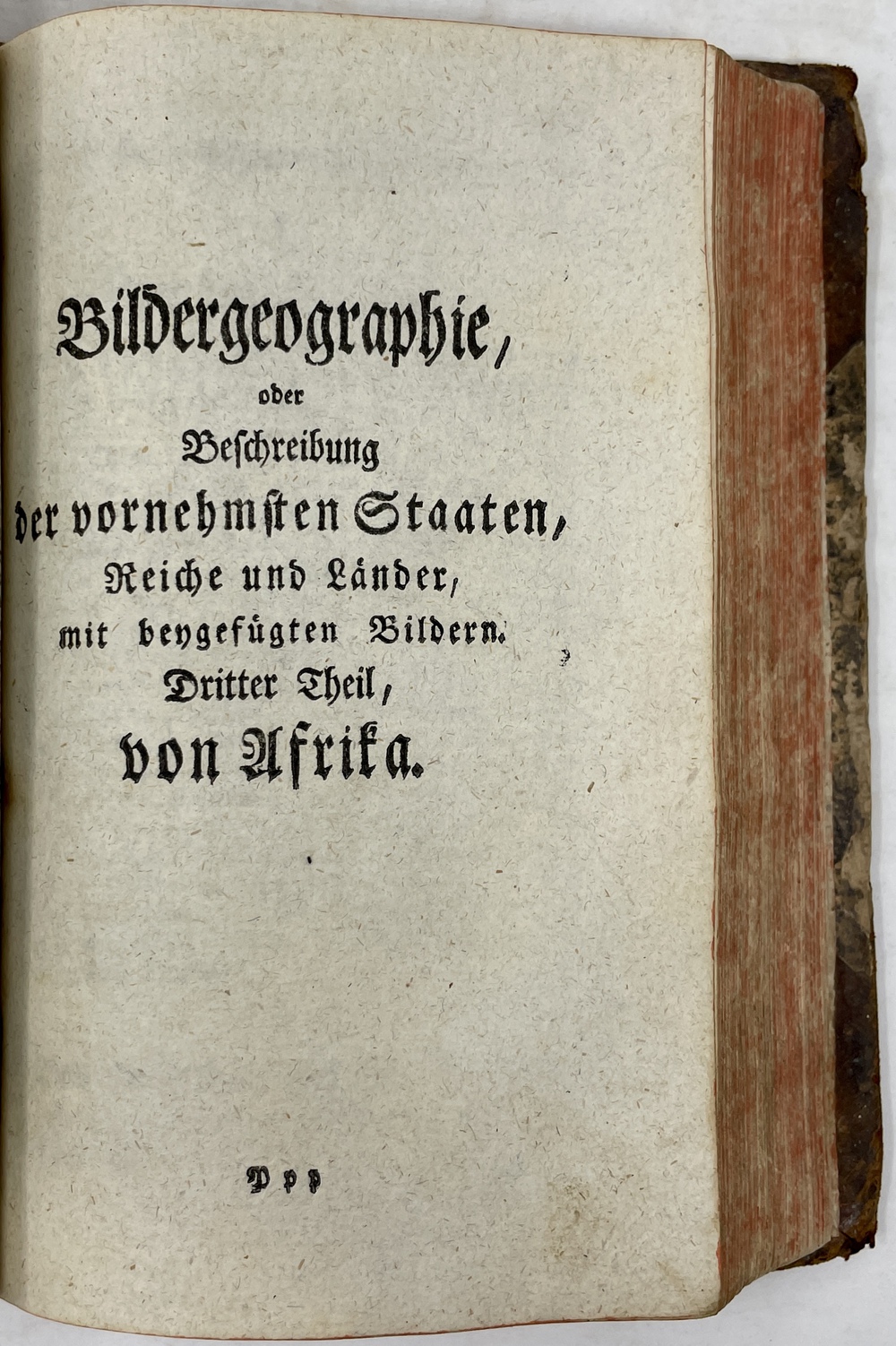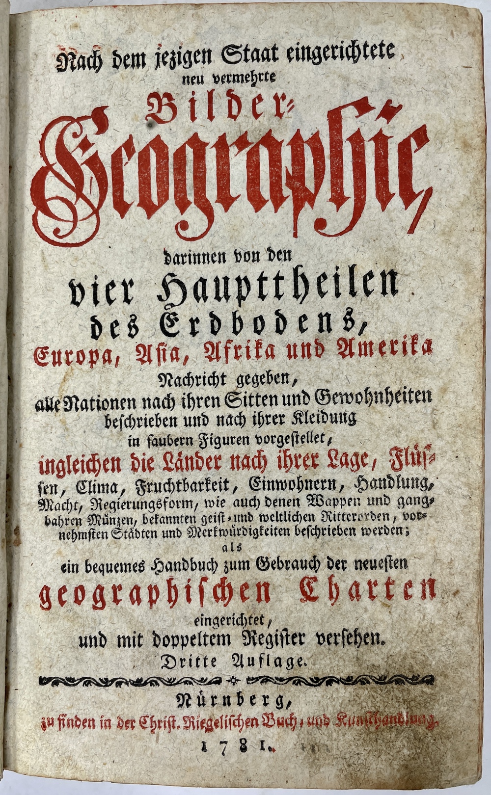 Nach dem jezigen Staat eingerichtete Bilder=Geographie, darinnen von den vier haupttheilen des Erdbodens Europa, Asia, Afrika und Amerika Nachricht gegeben, alle Nationen nach ihren Sitten und Gewohnheiten…Dritte Auflage.