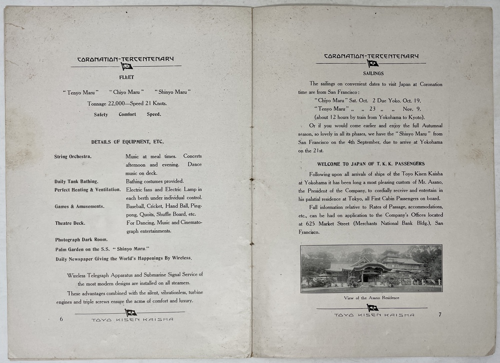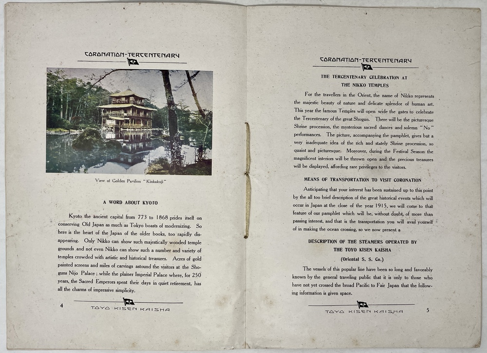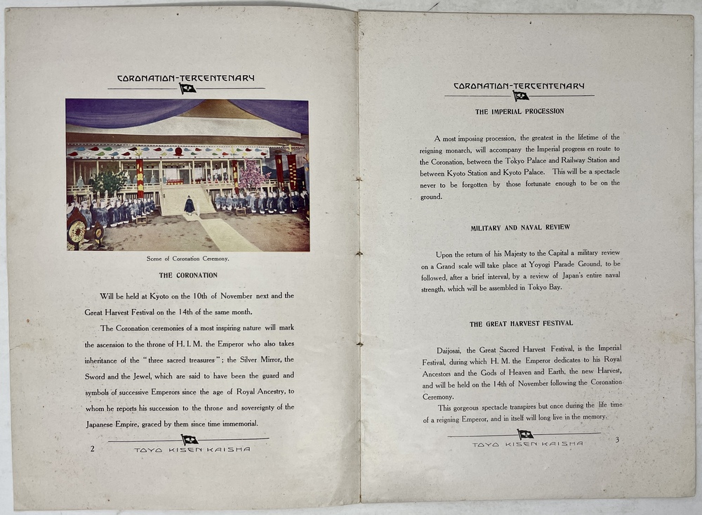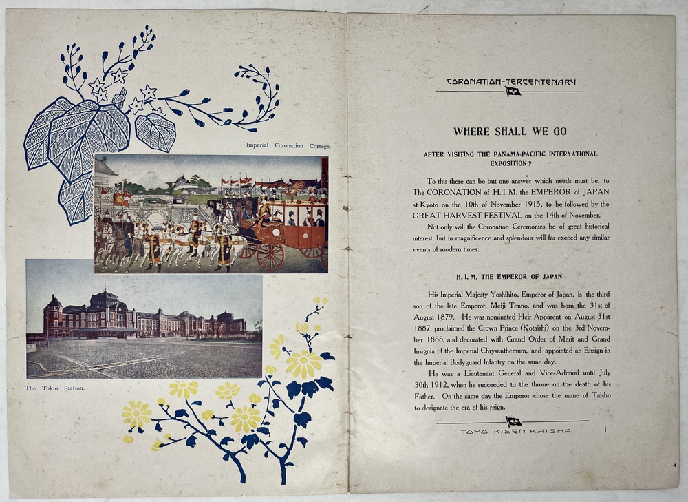 TO THE CORONATION OF H.I.M. THE EMPEROR OF JAPAN AT KYOTO, NOV. 10TH 1915. THE TOYO KISEN KAISHA (ORIENTAL S.S.Co.) WILL SHOW YOU THE WAY VIA THE TRANS-PACIFIC LINE.
