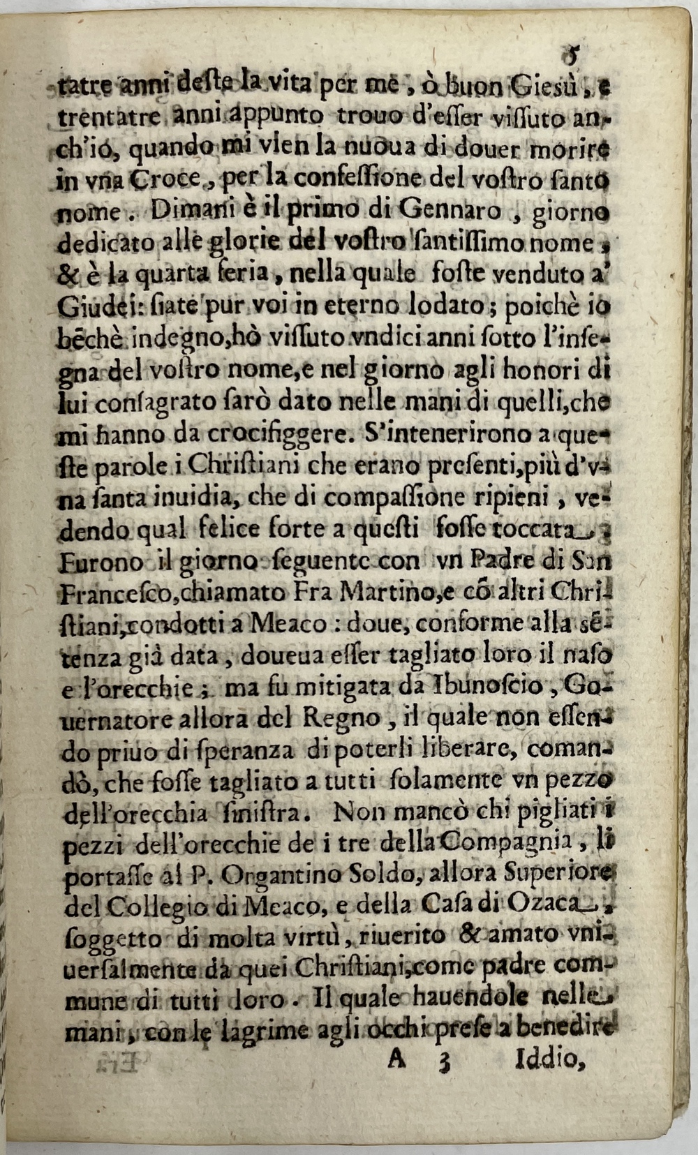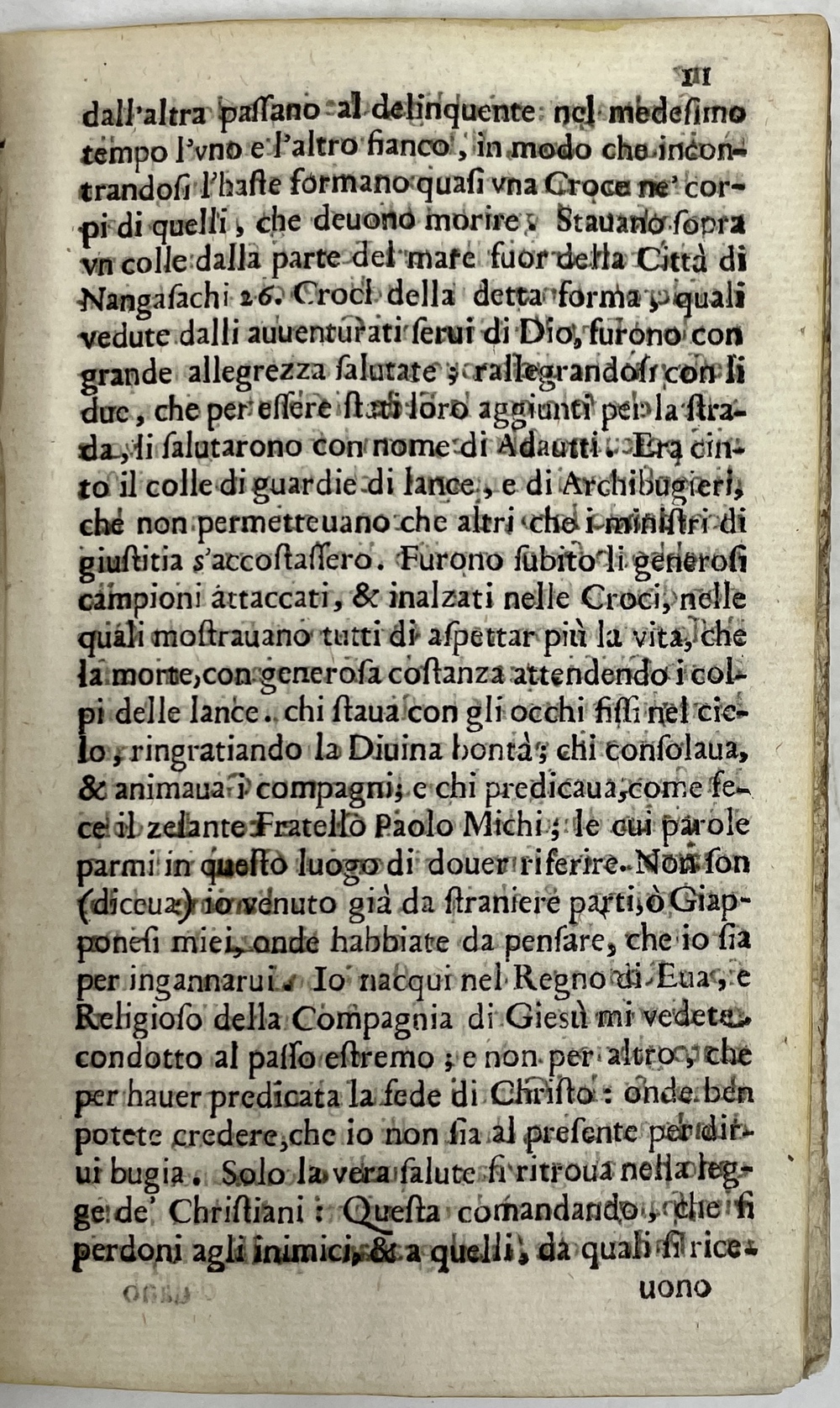 ただし、本書はペドロ・ゴメスの1597年書簡の一部を抜粋しているわけではなく、刊行された1628年の文脈に合わせる形で、編纂、加筆、訂正等がなされていることに大きな特徴があります。本書の内容は、大坂(Ozaca)でパウロ三木ら3人のイエズス会士が捕縛されるところからその記述が始まっていますが、続いて3人の経歴が紹介されており、特にイエズス会士としての活動期間が長く著名でもあったパウロ三木については非常に詳しく紹介がなされています。天草のコレジヨ(Collegio di Amacusa)で学んだことなどもここには記されていて、こうした記述は、少なくとも事件直後に刊行された上掲②フロイス報告には見られないものです。3人の経歴紹介に続いては、おおむね事件の時系列に沿って記述がなされていて、京都(京、Meaco)においてフランシスコ会のマルティノ(Fra Martino)らが捕縛され、秀吉より捕らえられた者たちの耳を削ぐよう命じられた石田三成(治部少、Ibunoscio)がそれを緩和しようと努めたことをはじめ、オルガンティーノ(P. Organtino Soldo)ら現地のイエズス会士の動向などが描かれています。イエズス会士らの名が挙げられる際には「京のコレジオ、並びに大坂のカーザの上長(allora Superiore del Collegio di Meaco, e della Casa di Ozaca)というように、当時の役職と合わせて記されていて、こうした記述も上掲②フロイス報告には見られないものです。事件発生当時のイエズス会関係者にとっては周知の事実であった宣教師の役職なども、30年余りが経過して本書が刊行された1628年の読者にとっては(場合によってはイエズス会関係者にとってすら)あまり馴染みがなかったことを考慮して、事件の背景や経過を読者に正しく理解してもらうために欠かせないこうした役職の記述が本書では追記されたのではないかと思われます。また、事件の経過を論じた後の末尾には、彼らが日本宣教の種を蒔いたザビエルに連なる日本のイエズス会士であることが強調されていて、教皇ウルバヌス8世によって3人が福者として公認されたことの意義や、読者が彼らから学ぶべきことなども論じられています。