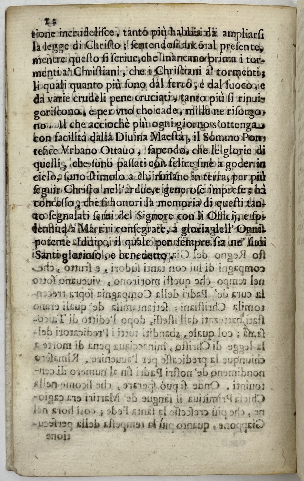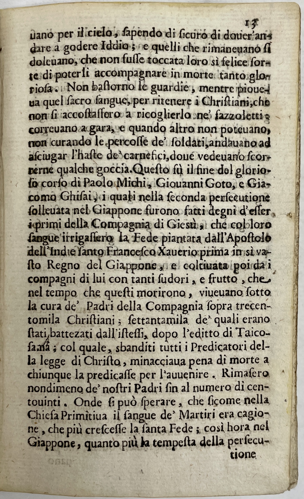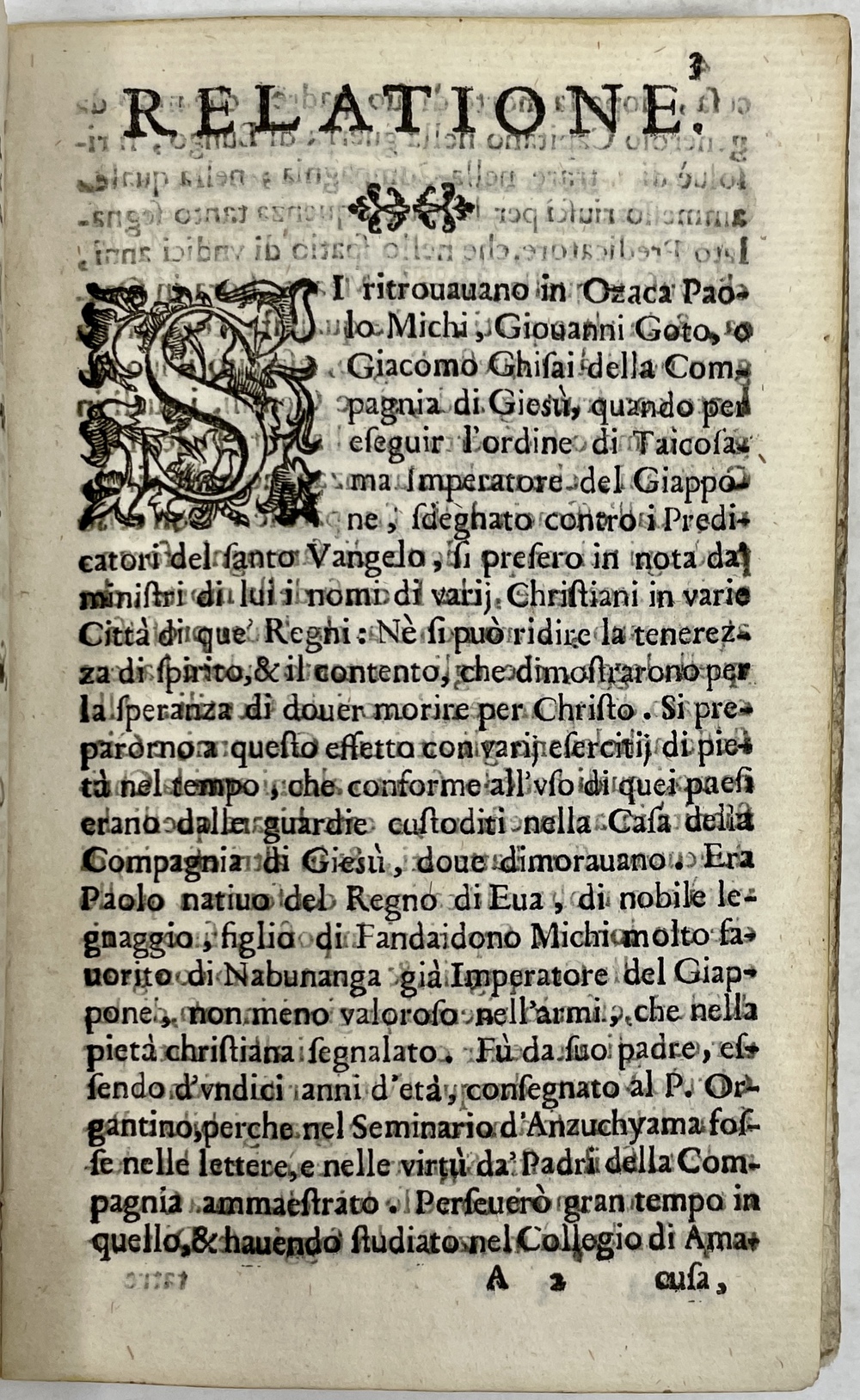 本書は、1597年2月に生じたいわゆる日本二十六聖人殉教事件の犠牲者のうち、パウロ三木(Paolo Michi)、ディエゴ喜斎(Giacomo Ghisai)、ヨハネ五島(Giovanni Goto)の三人のイエズス会士に焦点を当てて論じたもので、1627年にウルバヌス8世によって二十六人が列福されたことを受けて1628年にローマで刊行されています。事件当時に日本準管区長であったペドロ・ゴメスによって1597年に認められた書簡を典拠にしていることをうたっており、パウロ三木ら3人の履歴や事件当時の様子が詳しく記されています。また、事件以降の文脈、特に彼らが殉教者としてローマで正式に認められ福者となったことを踏まえて新たに書かれた作品でもあることから、事件発生以降のイエズス会における事件の認識の変遷を示す資料としても大変興味深い内容となっています。わずか14ページの小著ながら当時は非常によく読まれたようで、同名のタイトルを持つ異刷が少なくとも2点、また本書がもとになっていると思われる作品やその翻訳版が6点も1628年中に刊行されています。本書はイエズス会出版物刊行の中心的役割を担っていたローマのザネッティ社から刊行された初版と思われる1冊で、こうした数多くの異刷、翻訳版、類似作品、さらには19世紀半ばに至るまで数多く生み出されることになったパウロ三木ら3人を主題とした数多くの著作、版画作品の原点になったと言える重要な版であるだけでなく、国内所蔵が皆無であることはおろか、世界的にも僅か数点しか現存が確認できない大変希少な作品でもあります。