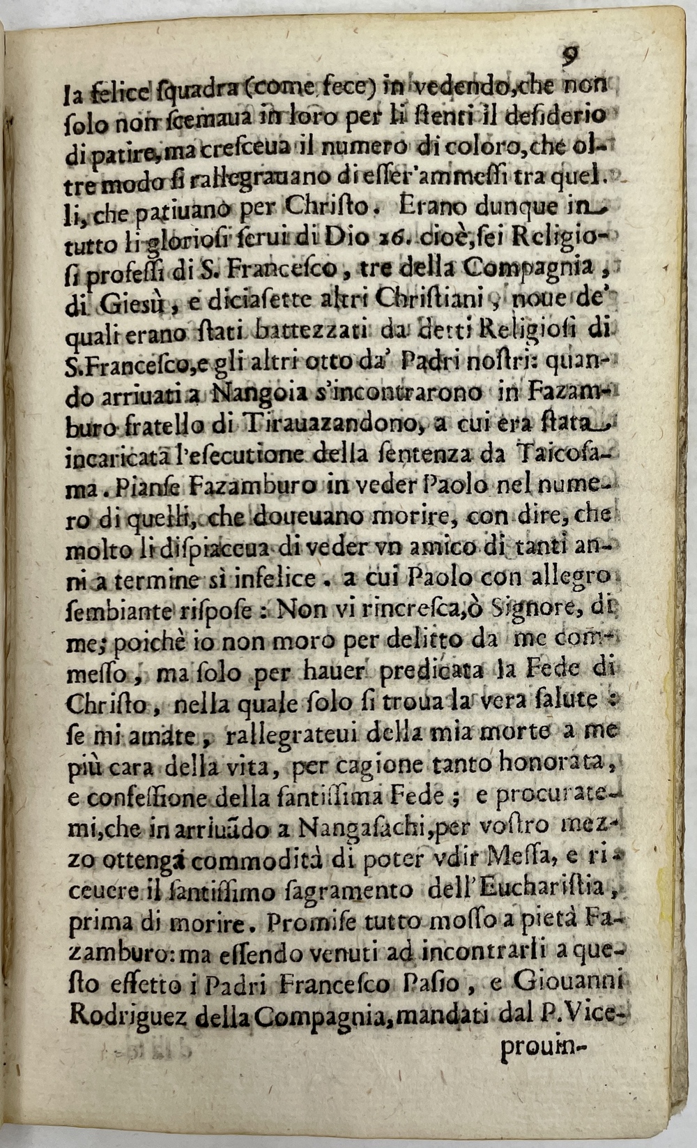 これに対して、本書は事件直後に認められたペドロ・ゴメスの書簡を典拠にしているものの、実際に事件が生じてから30年余りも経過した1628年に、犠牲者の列福がローマによって公式になされたことを受けて刊行されたという背景を有する作品であることから、上掲のような事件直後に刊行された作品とは異なる性質も帯びていることに注意が必要と思われます。本書において犠牲者26人全員が扱われるのではなく、イエズス会士であった3人だけに焦点が当てられていることは、その30年余りの間にイエズス会とフランシスコ会の対立が激化していったことを反映したもので、当初は犠牲者の列福や検証に慎重であったイエズス会も、フランシスコ会に対立する形で自身の関係者の顕彰活動を積極的に進めるようになり、その結果、イエズス会とフランシスコ会のそれぞれが、自身の関係者だけを分別する形で事件を論じるようになっていったことがその背景にあります。そのため、本書はいうまでもなくイエズス会による公式の出版物であることから、フランシスコ会関係者については(事件の概要を伝えるために最低限の紹介はするものの)ほとんど論じることはなく、イエズス会関係者である3人だけに焦点を当てて論じる内容となっています。パウロ三木、ディエゴ喜斎、ヨハネ五島の3人の名前がタイトルページに明記され、しかも彼らがはっきりと「日本の殉教者(Martiri Giapponesi)」として紹されている本書は、彼らがイエズス会の関係者であり、しかも日本における最初の殉教者に数えられる名誉ある模範的信徒であったことを殊更に強調し、それ以外のフランシスコ会士たちの存在を背後に押しやることで、イエズス会の日本宣教の成果を引き立たせようとする意図が強く感じられます。こうした態度は、フランシスコ会による同時代の出版物にも同様の傾向が見られ、彼らによる出版物はイエズス会士3名を除外した23名のみが論じられています。このように同じ事件の犠牲者を所属修道会ごとに分断して扱おうとする姿勢は、版画や絵画などの視覚作品にまで及んでおり、1862年の列聖後に至るまでこうした姿勢のもとに製作された作品が数多く生み出されることになりました。本書は、イエズス会における出版物としてこうした姿勢を明確に示した最初の作品であると考えられることから、数多く生み出されることになった同種の作品群の原点と言えるものです。