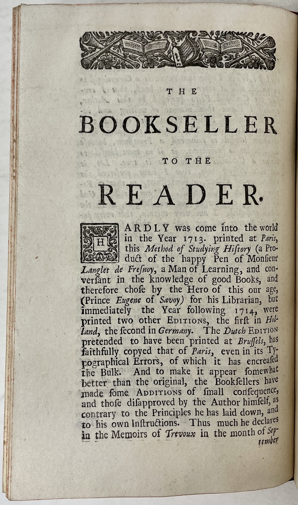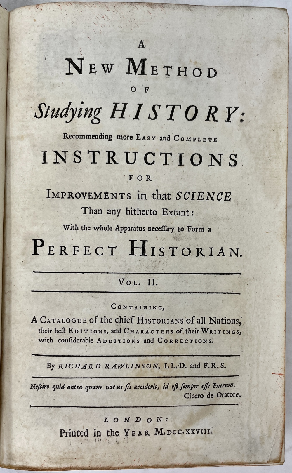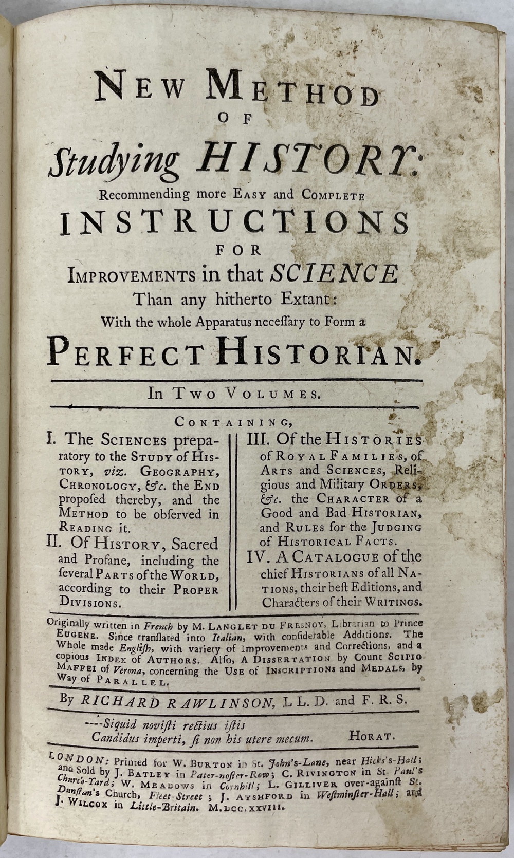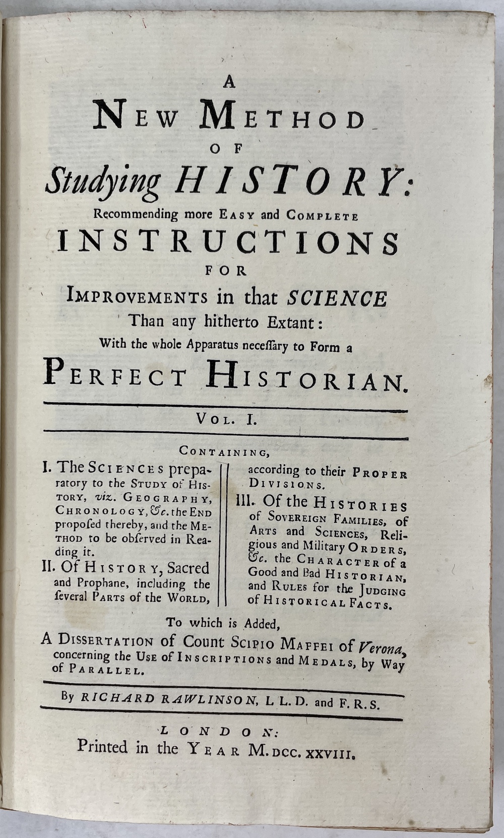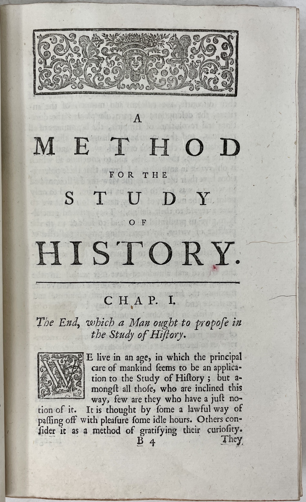 NEW METHOD OF Studying HISTORY: Recommending more EASY and COMPLETE INSTRUCTIONS FOR IMPROVEMENTS in that SCIENCE Than any hitherto Extant: With the whole Apparatus necessary to Form a PERFECT HISTORIAN. In Two VOLUMES….