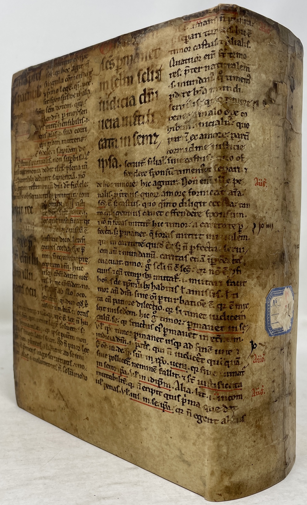 本書の来歴を示すと思われるDr. Silva Amandoの蔵書オークションと本書に関する記事(20世紀初頭の記事か?)の切り抜きが見返しにあり。タイトルページから目次までの11葉が欠損しているためファクシミリにて補填されている。冒頭一葉(j)上部欠損箇所があるが、ファクシミリにて補填。本文は奥付含め完備。刊行当時に近いものと思われる羊皮紙(なんらかの別の書物の一葉か)を用いた装丁を残す形で修復されており製本状態は極めて良好。[Laures: JL-1570-KB4]