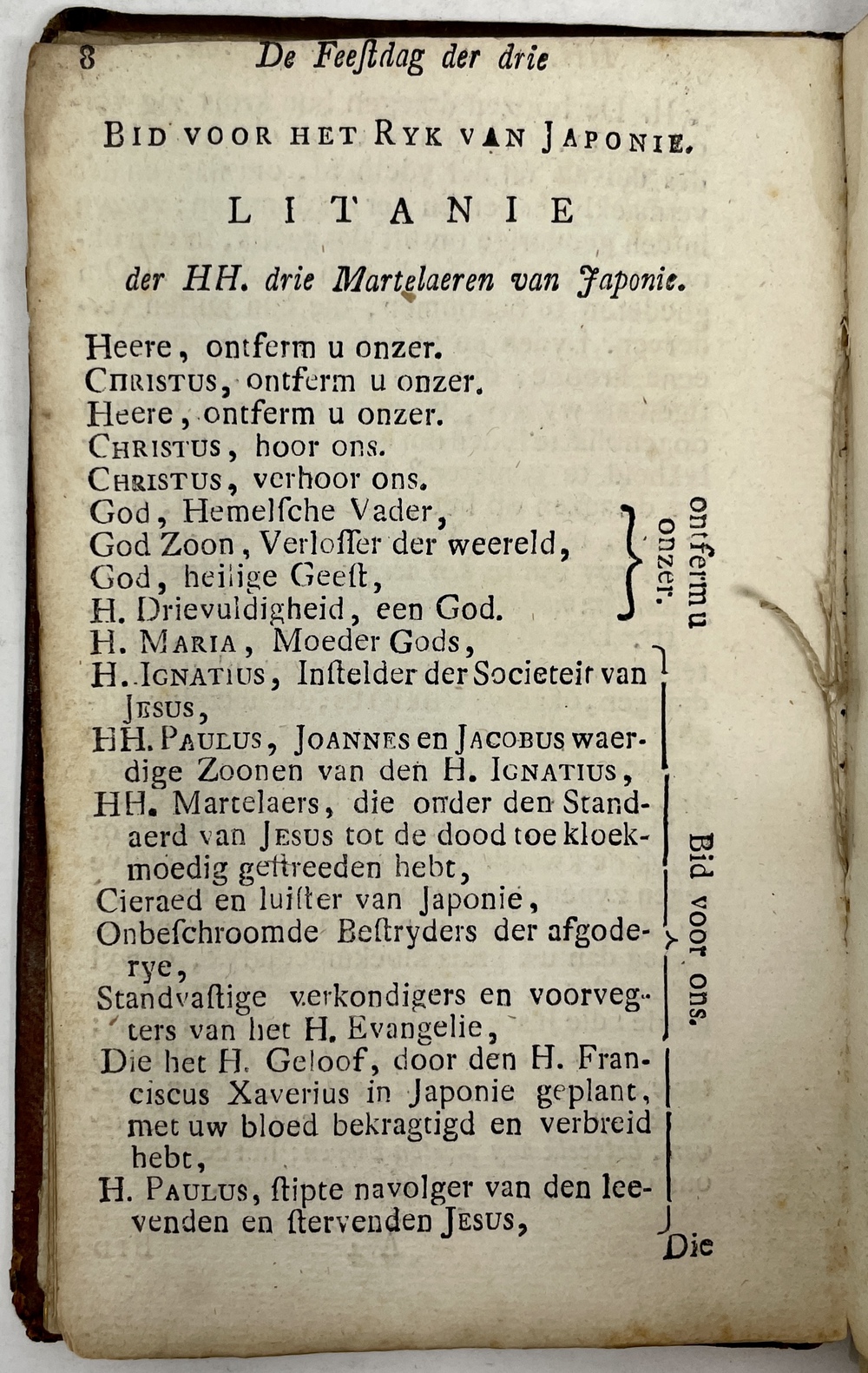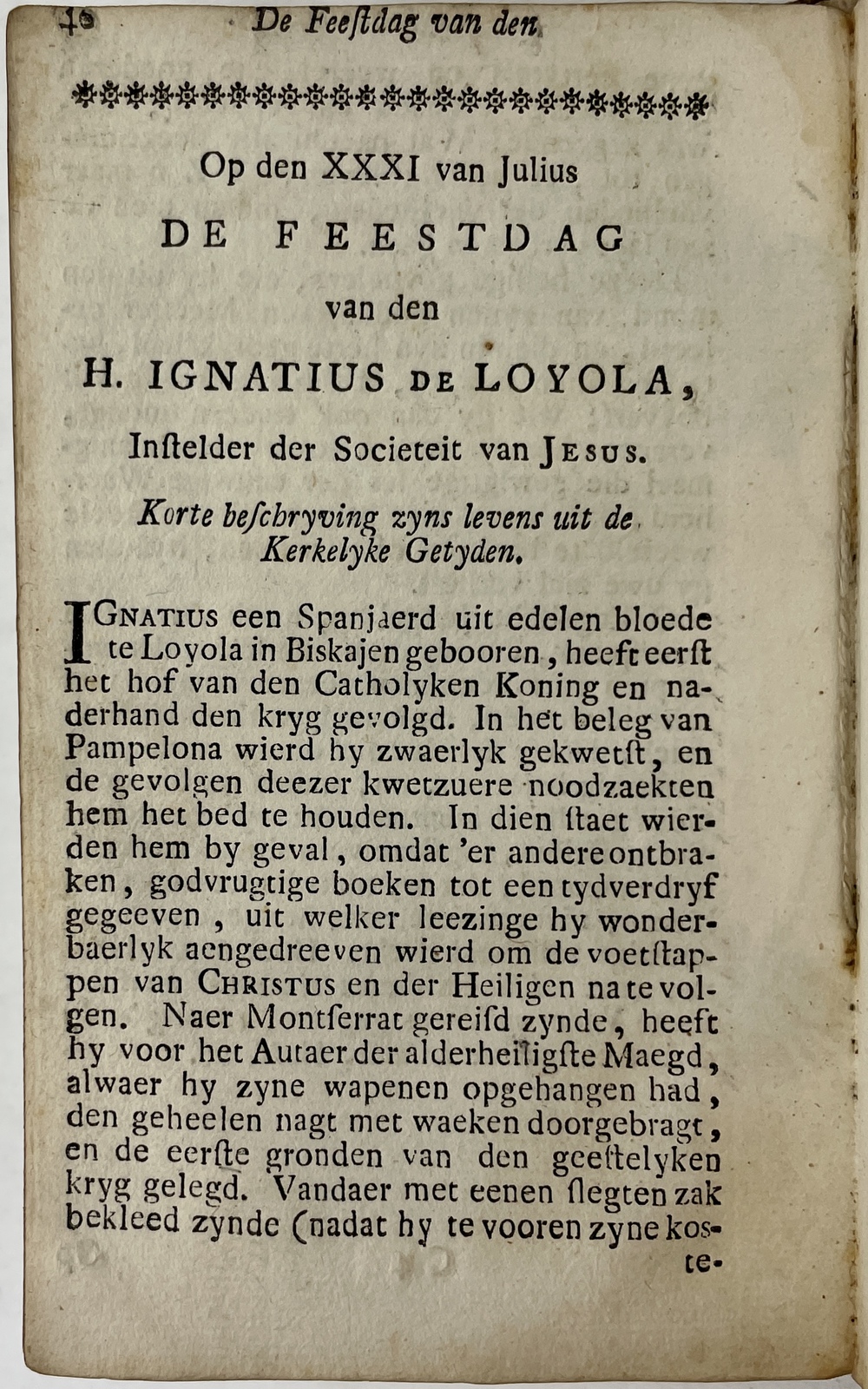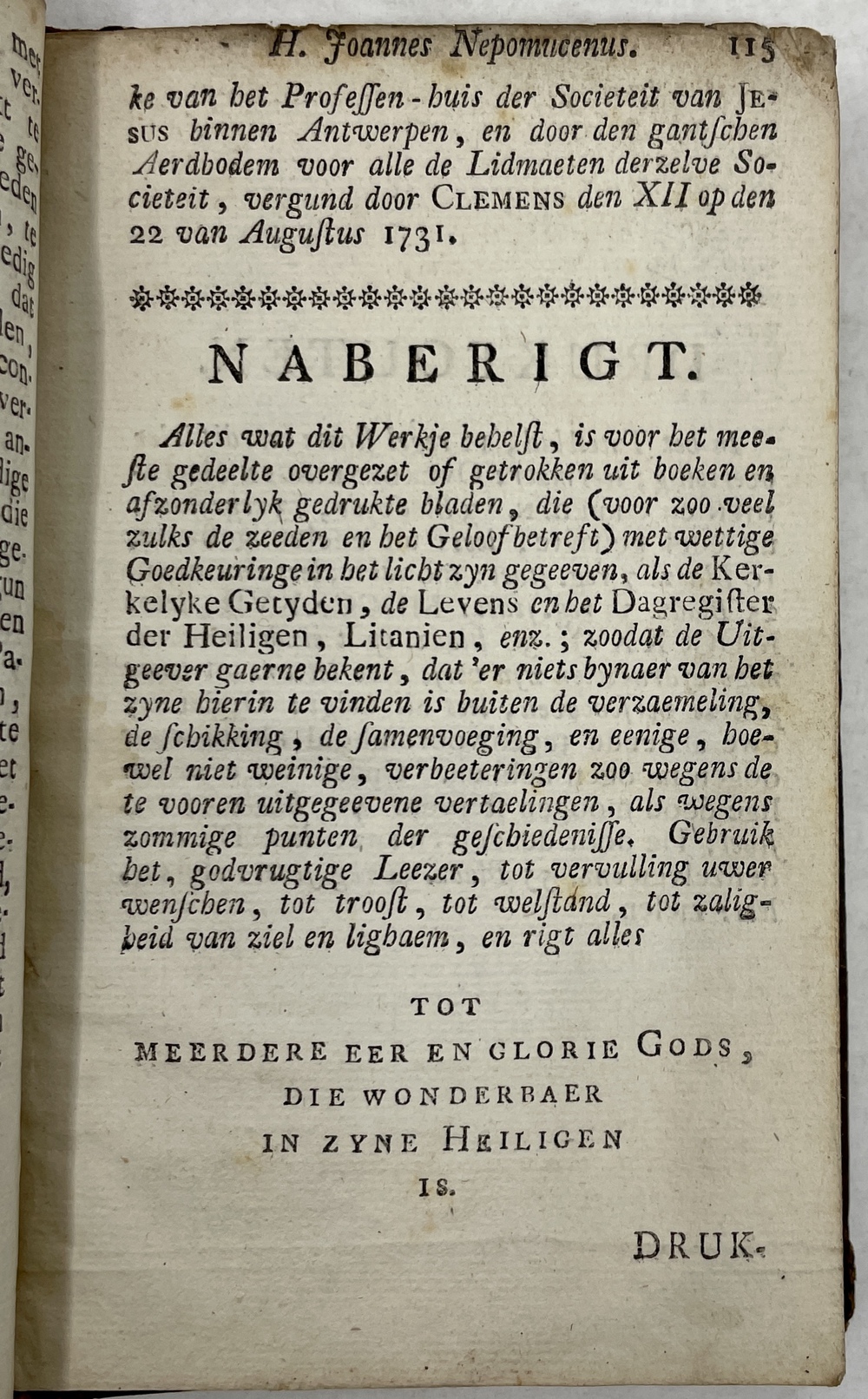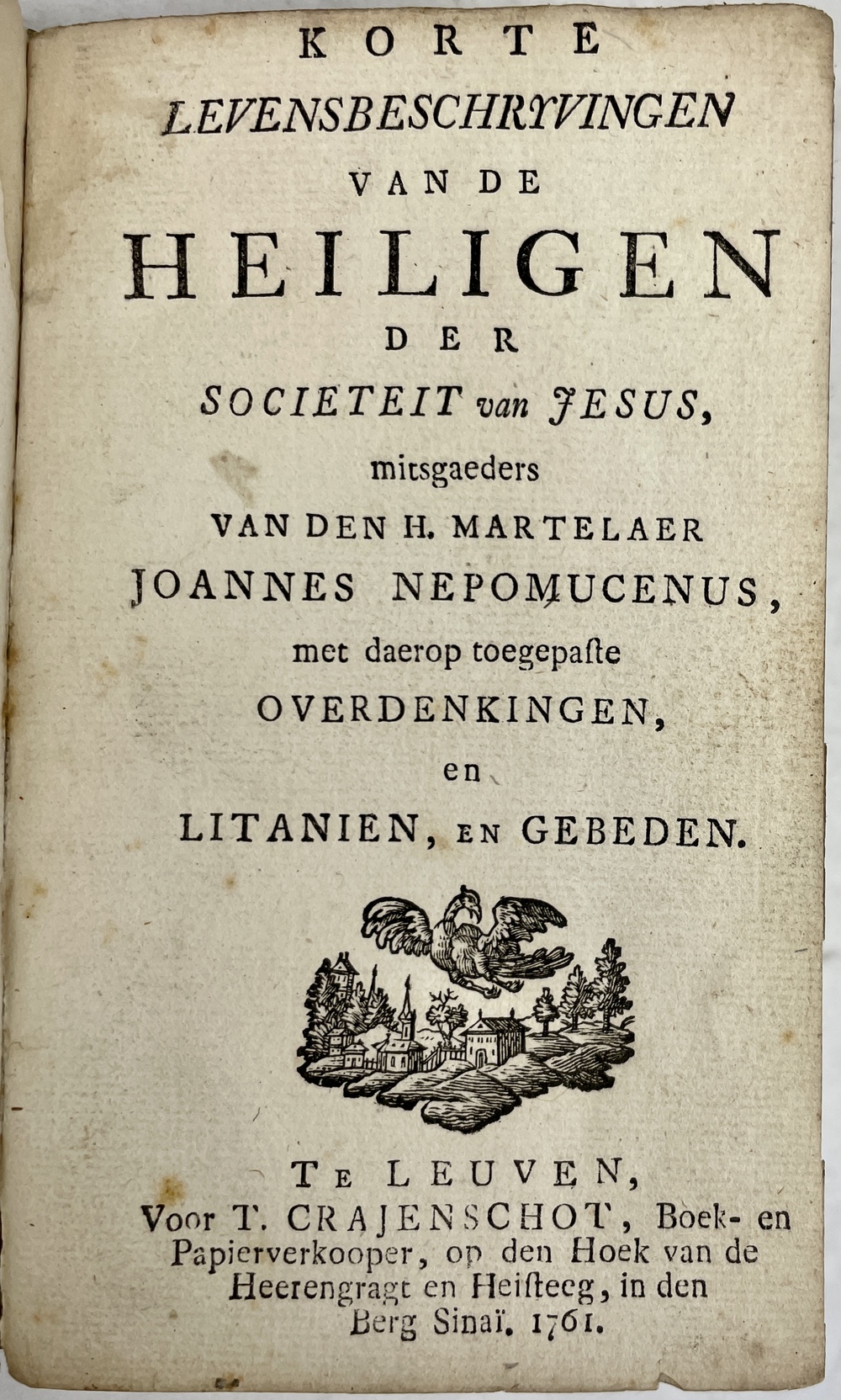 KORTE LEVENSBESCHRYVINGEN VAN DE HEILIGEN DER SOCIETEIT van JESUS, mitsgaeders VAN DEN H. MARTELAER JOANNES NEPOMUCENUS, met daerop toegepaste OVERDENKINGEN, en LITANIEN, EN GEBEDEN.