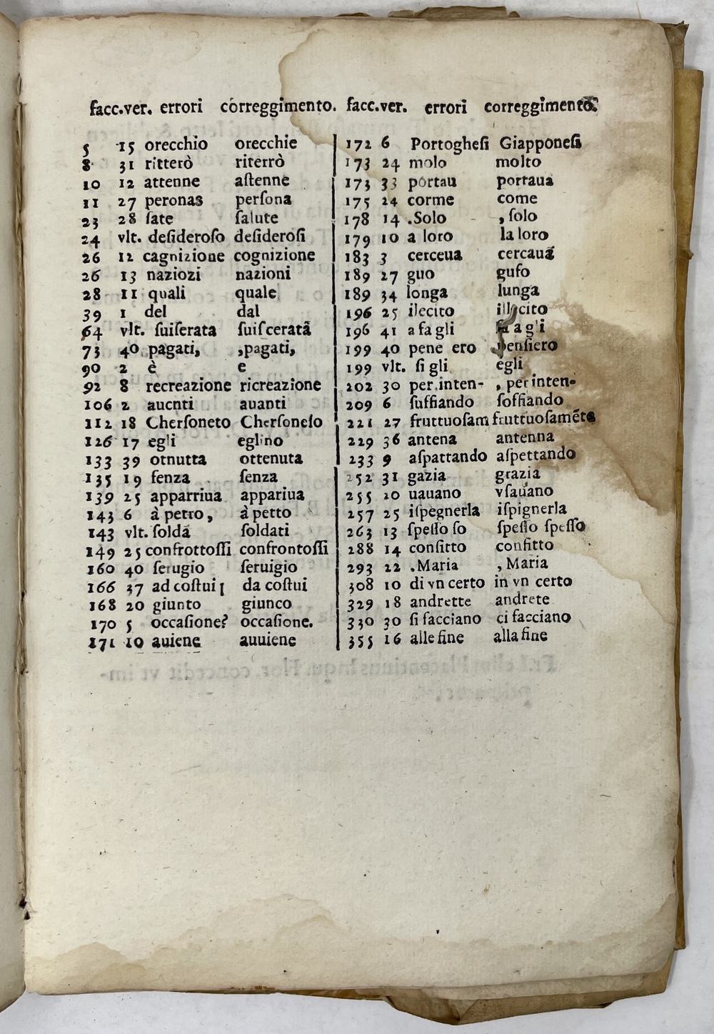 1葉(折丁E1、pp.65, 66相当)欠落のため、簡易コピーが挿入されている。製本の綴じに傷みが見られ、本文中にもシミが散見されるが、刊行当時の製本を保っており概ね良好な状態。巻末に1830年の日付を持つ当時の所有者によるメモ書きあり。[Laures: JL-1605-1-267-162] [NCID: BB20023349]