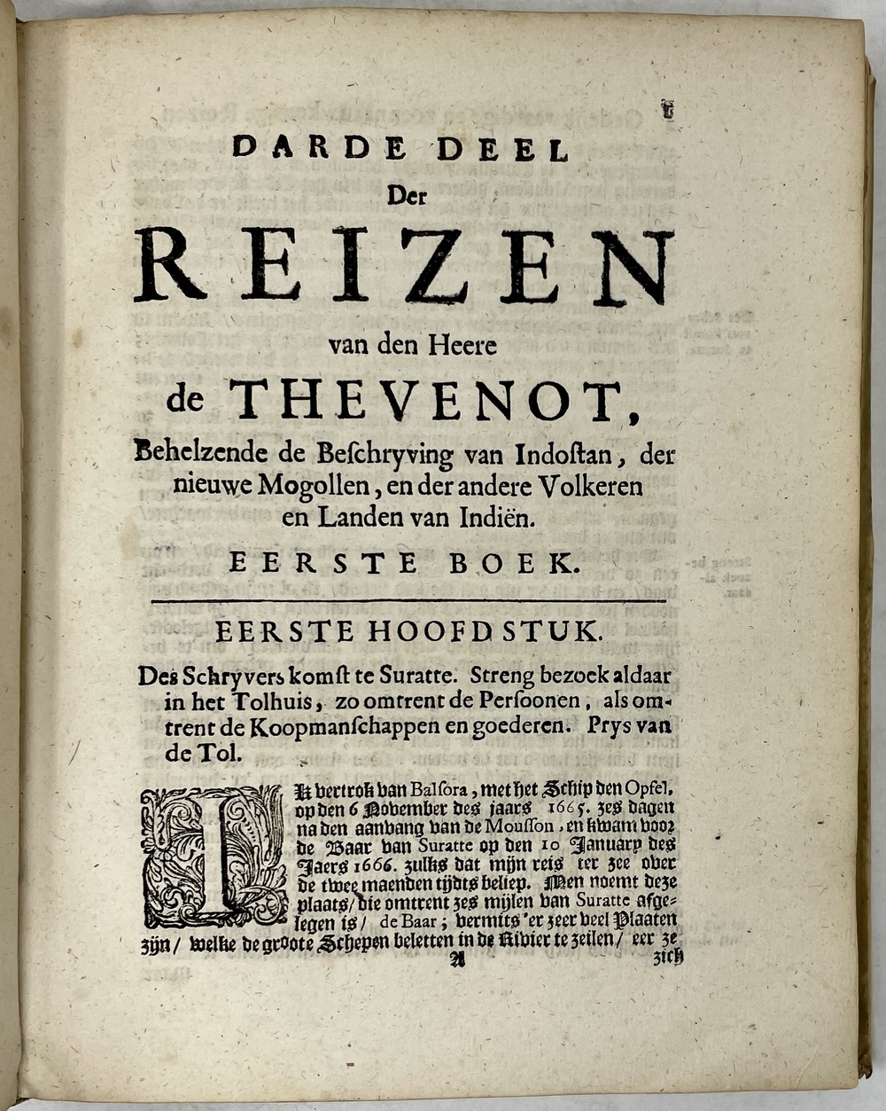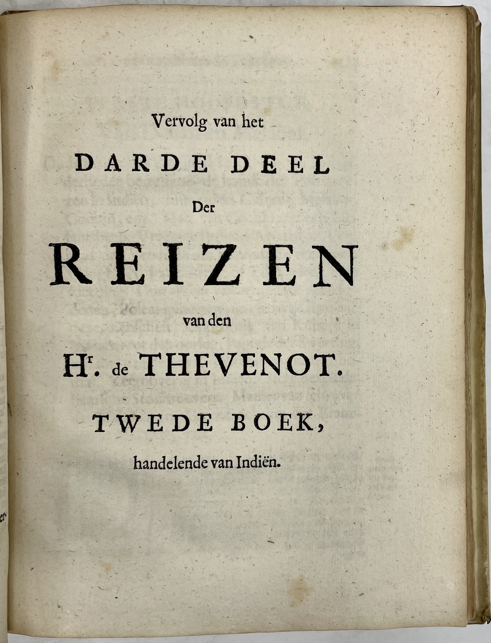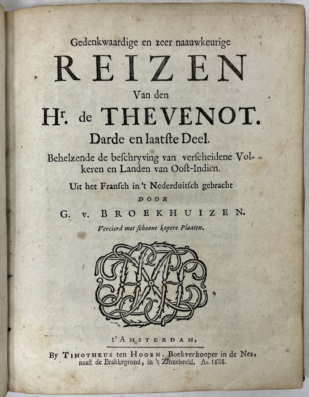 Gedenkwaardige en zeer Naauwkeurige REIZEN van den Hr. de THEVENOT. Darde en laaste Deel. Behelzende de beschryving van verscheidene Volkeren en Landen van Oost-Indien. Uit Fransch in ’t Nederduitsch gebracht DOOR G. V. BROEKHUIZEN….