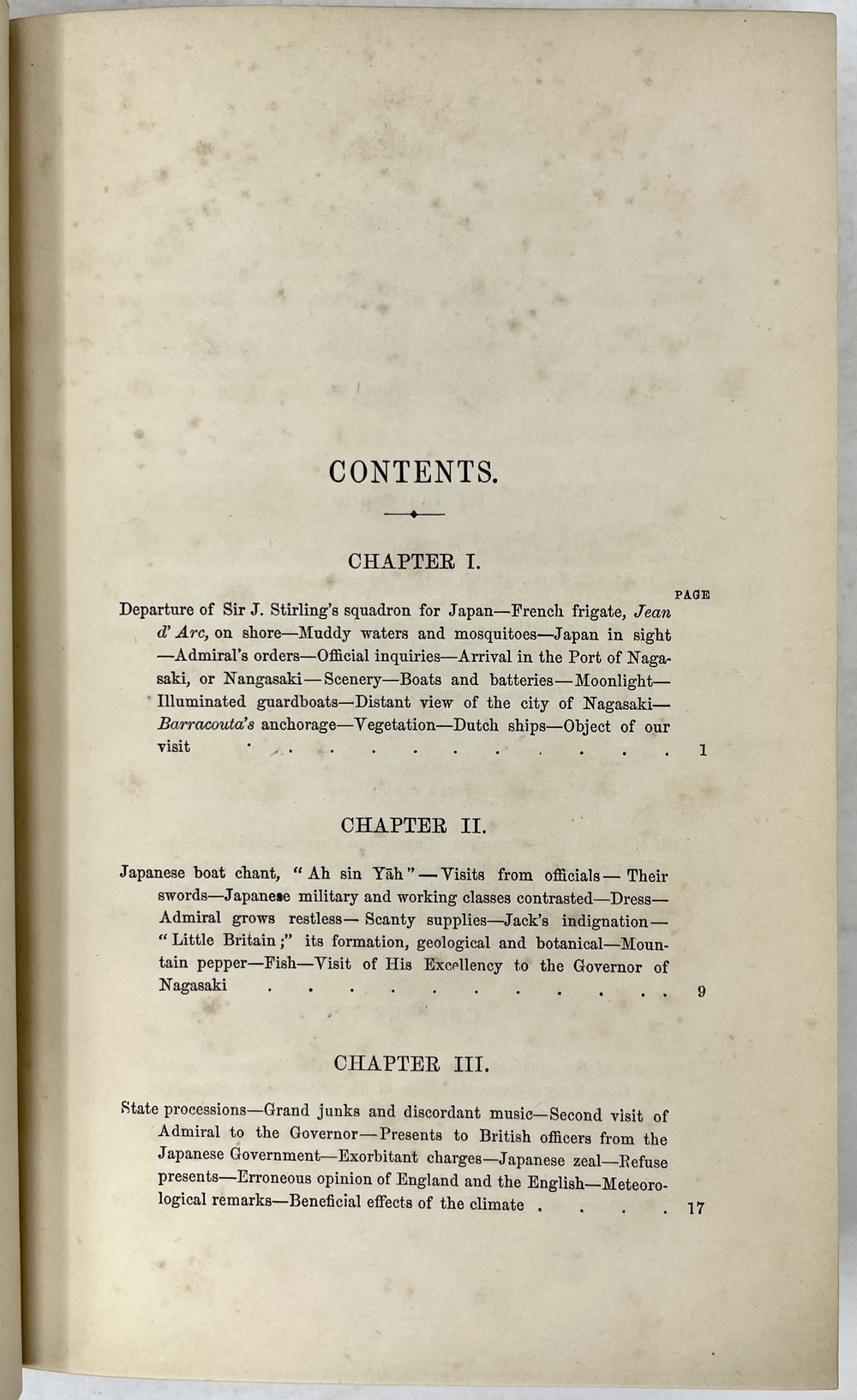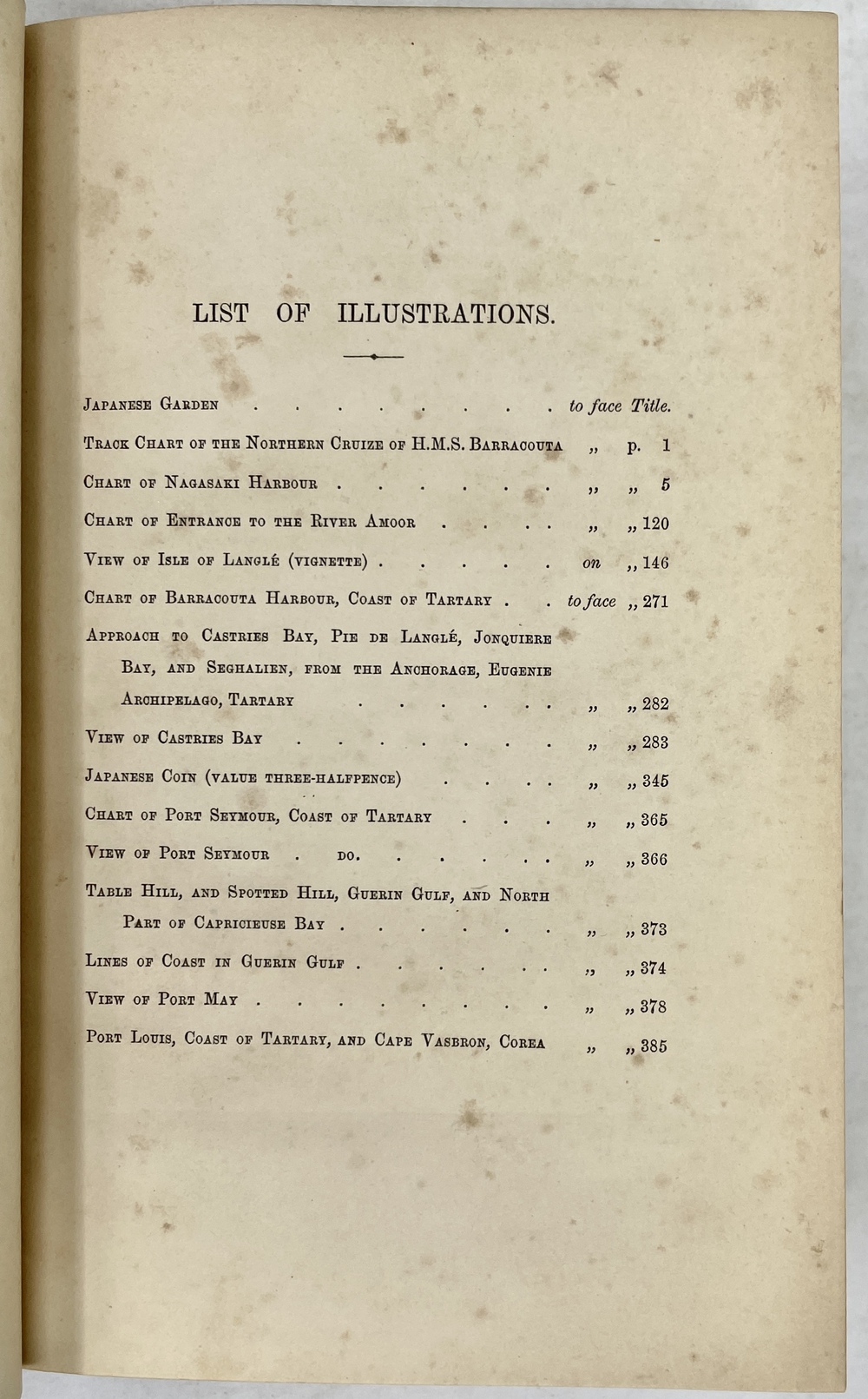 ロンドン日本協会旧蔵本で、装丁も同協会によるもの。独立した図版ページのうち次の3枚が欠落 ①TRACK CHART OF THE NORTHERN CRUIZE OF H.M.S. BARRACOUTA (to face p.1) / ②CHART OF NAGASAKI HARBOUR (to face p.5) / ③CHART OF BARRACOUTA HARBOUR, COAST OF TARTARY(to face p. 271)