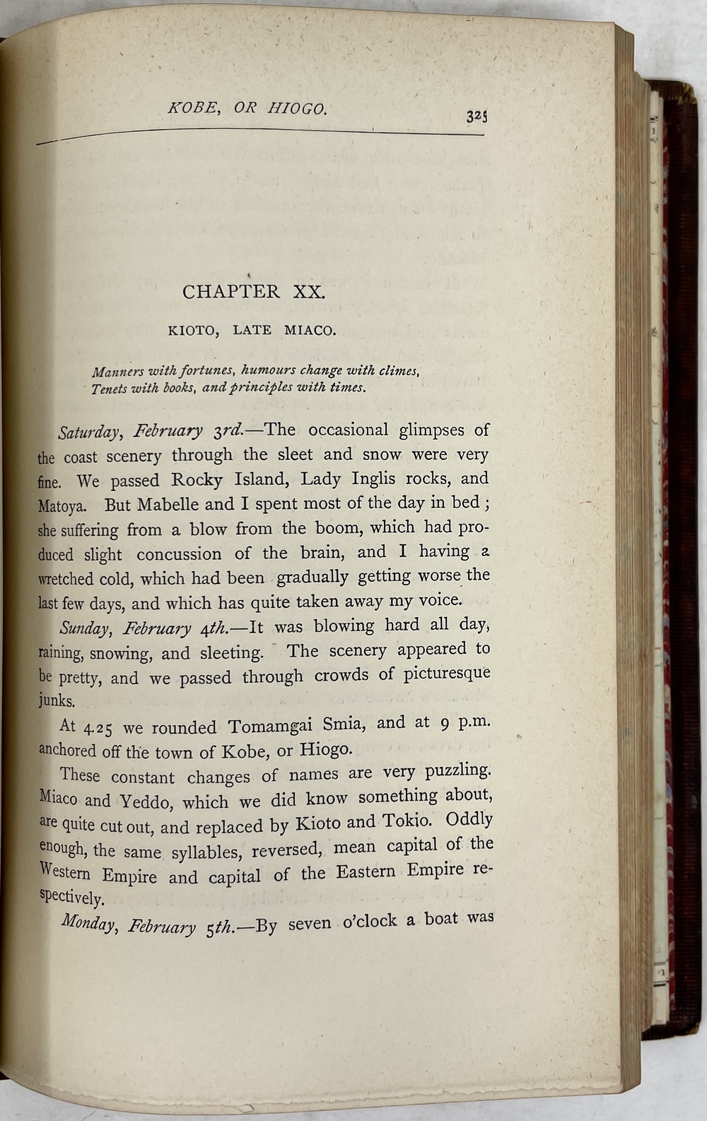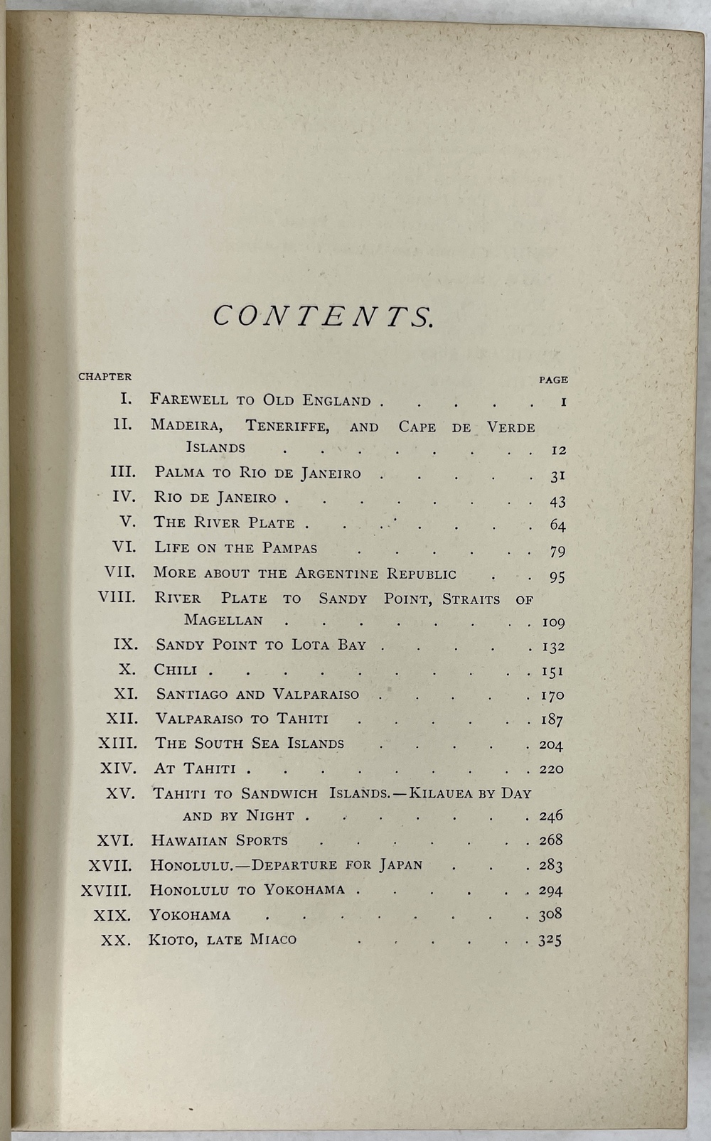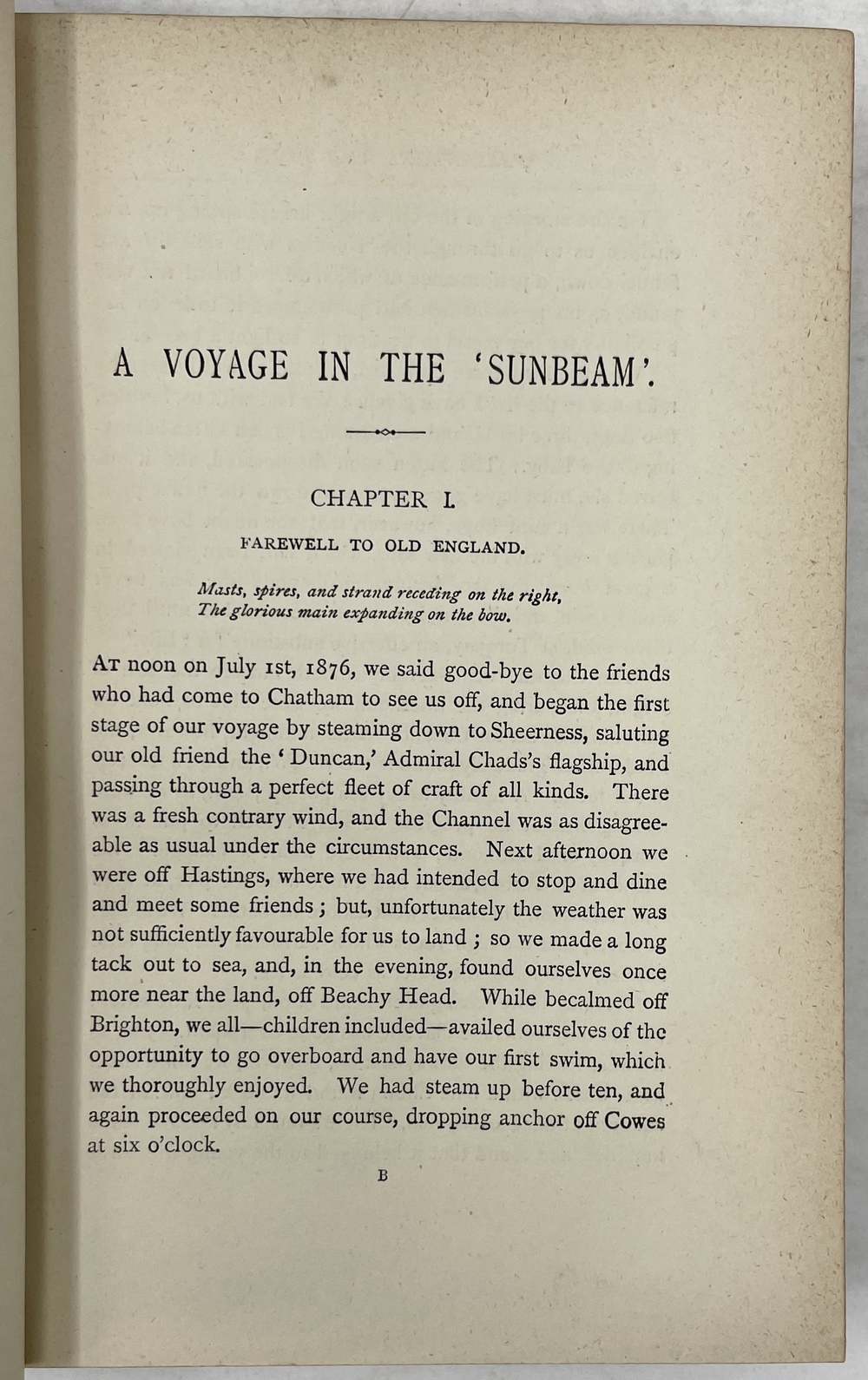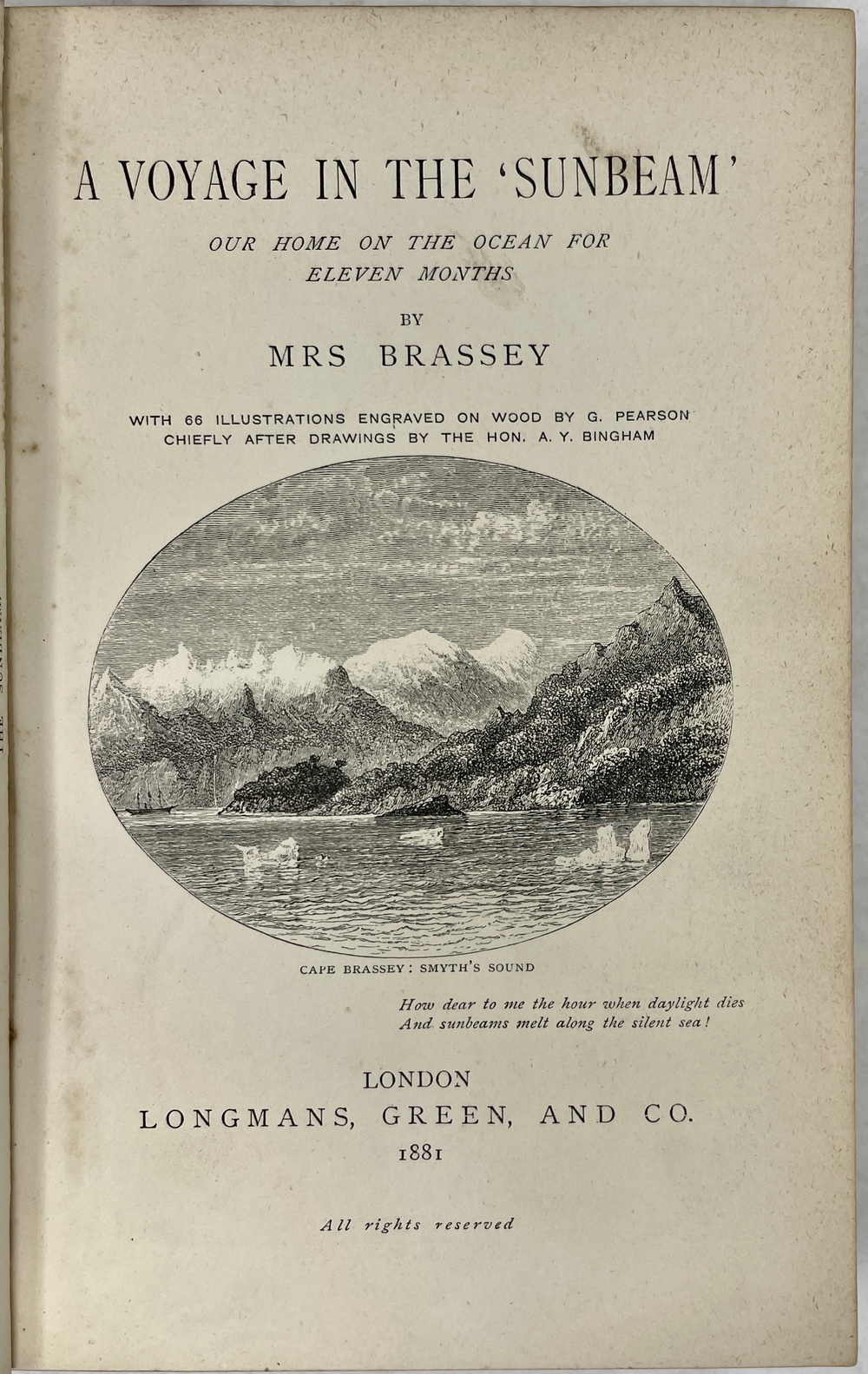 A VOYAGE IN THE ‘SUNBEAM’ OUR HOME ON THE OCEAN FOR ELEVEN MONTH…WITH 66 ILLUSTRATIONS ENGRAVED ON WOOD BY G. PEARSON CHIEFLY AFTER DRAWINGS BY THE HON. A. Y. BINGHAM.