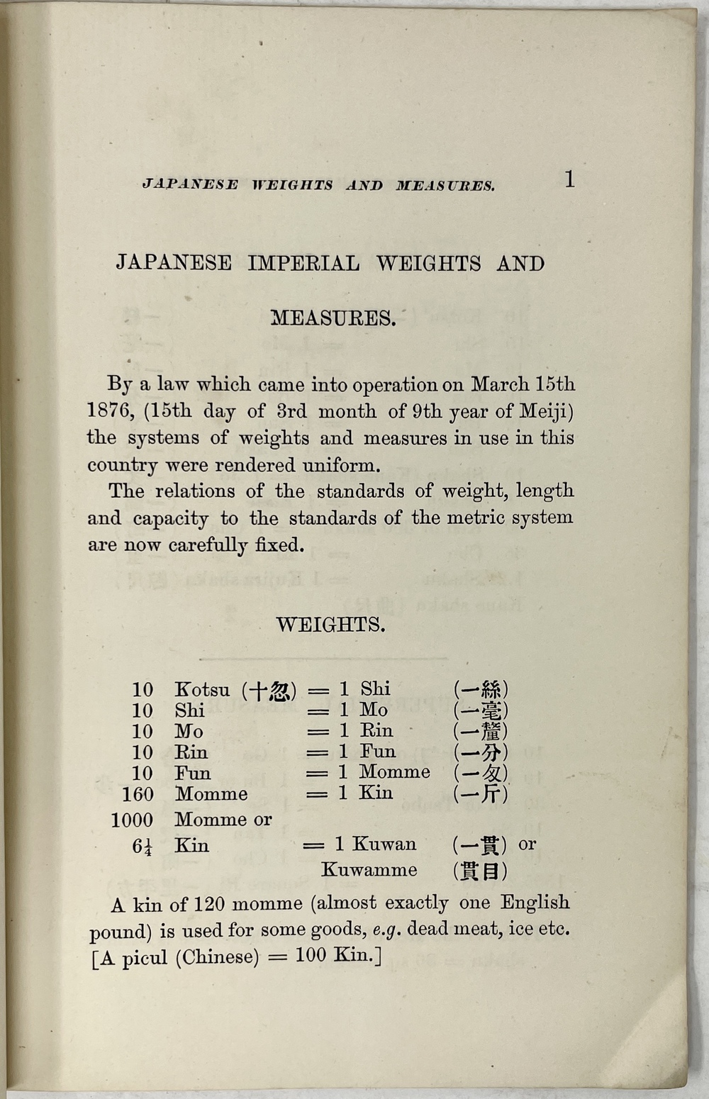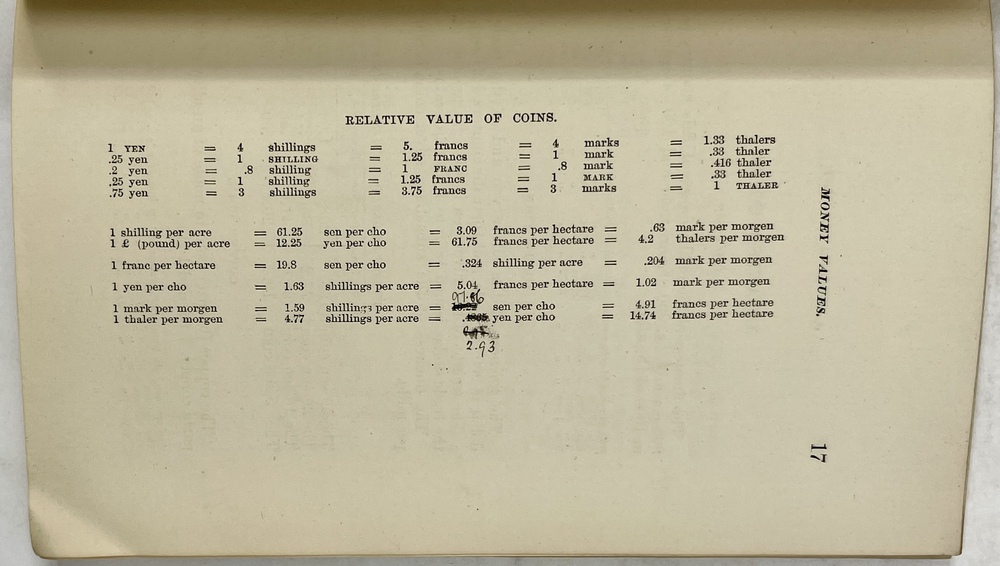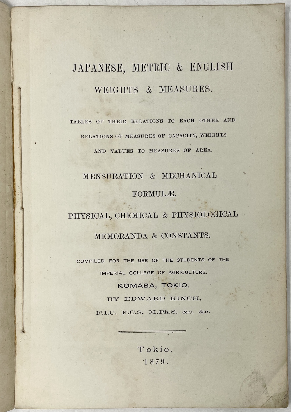 JAPANESE, METRIC & ENGLISH WEIGHTS & MEASURES. TABLES OF THEIR RELATIONS TO EACH OTHER AND RELATIONS OF MEASURES OF CAPACITY, WEIGHTS AND VALUES TO MEASURES OF AREA…COMPILED FOR THE USE OF THE STUDENTS OF THE IMPERIAL COLLEGE OF AGRICULTURE. KOMABA, TOKIO