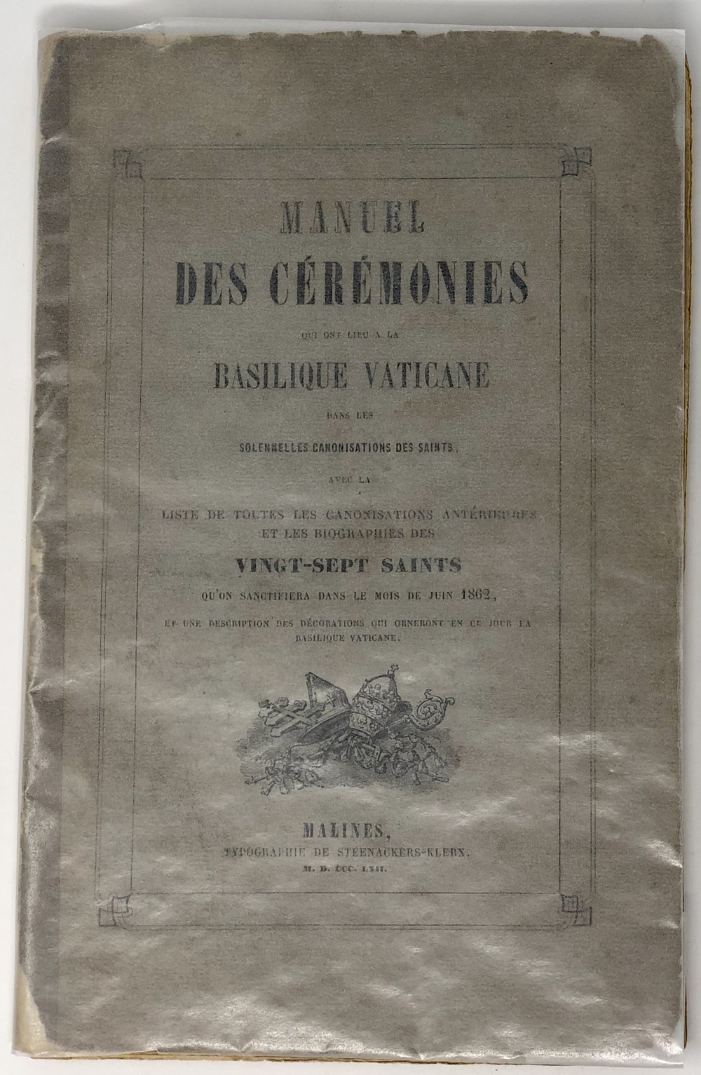 MANUEL DES CÉRÉMONIES QUI ONT LIEU A LA BASILIQUE VATICANE DANS LES SOLENNELLES CANONISATIONS DES SAINTS, AVEC LA LISTE DE TOUTES LES CANONISATIONS ANTÉRIEURES ET LES BIOGRAPHIES DES VINGT-SEPT SAINTS QU'ON SANCTIFIERA DANS LE MOIS DE JUIN 1862,...