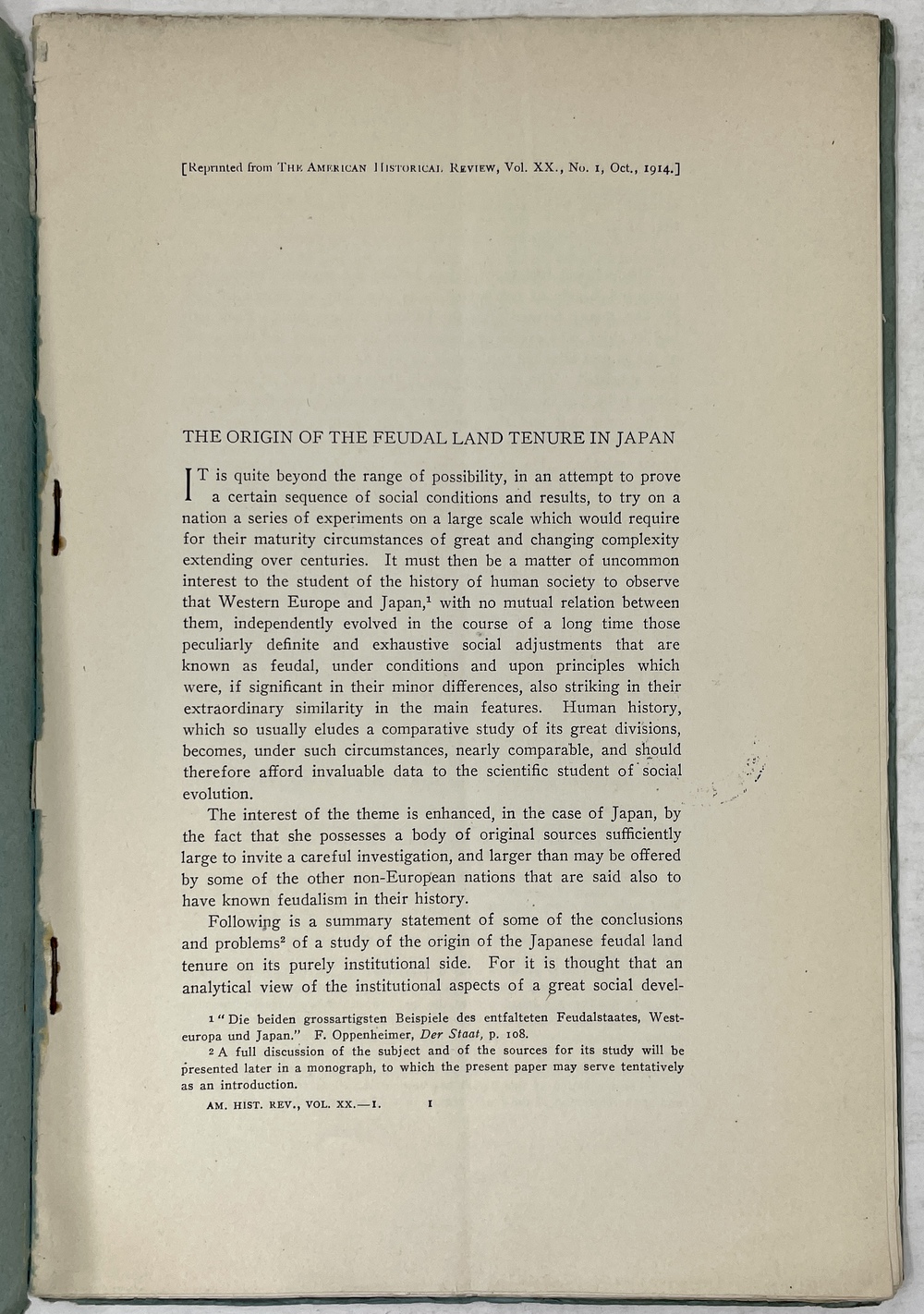『日本における中世封建制度の起源』(雑誌『アメリカ歴史報』第20巻第1号からの抜き刷り)