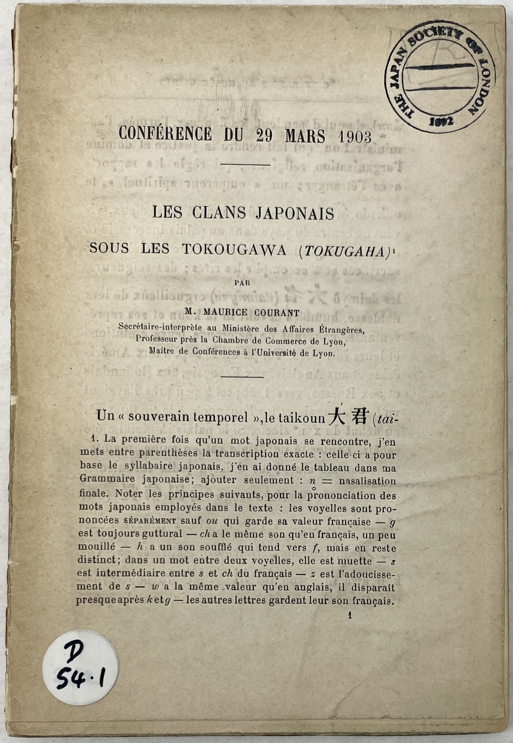 LES CLANS JAPONAIS SOUS LES TOKOUGAWA (TOKUGAHA). (CONFÉRENCE DU 29 MARS 1903)