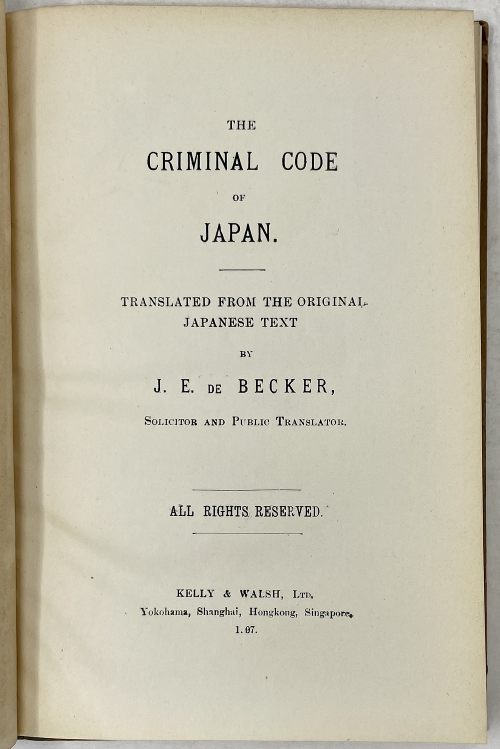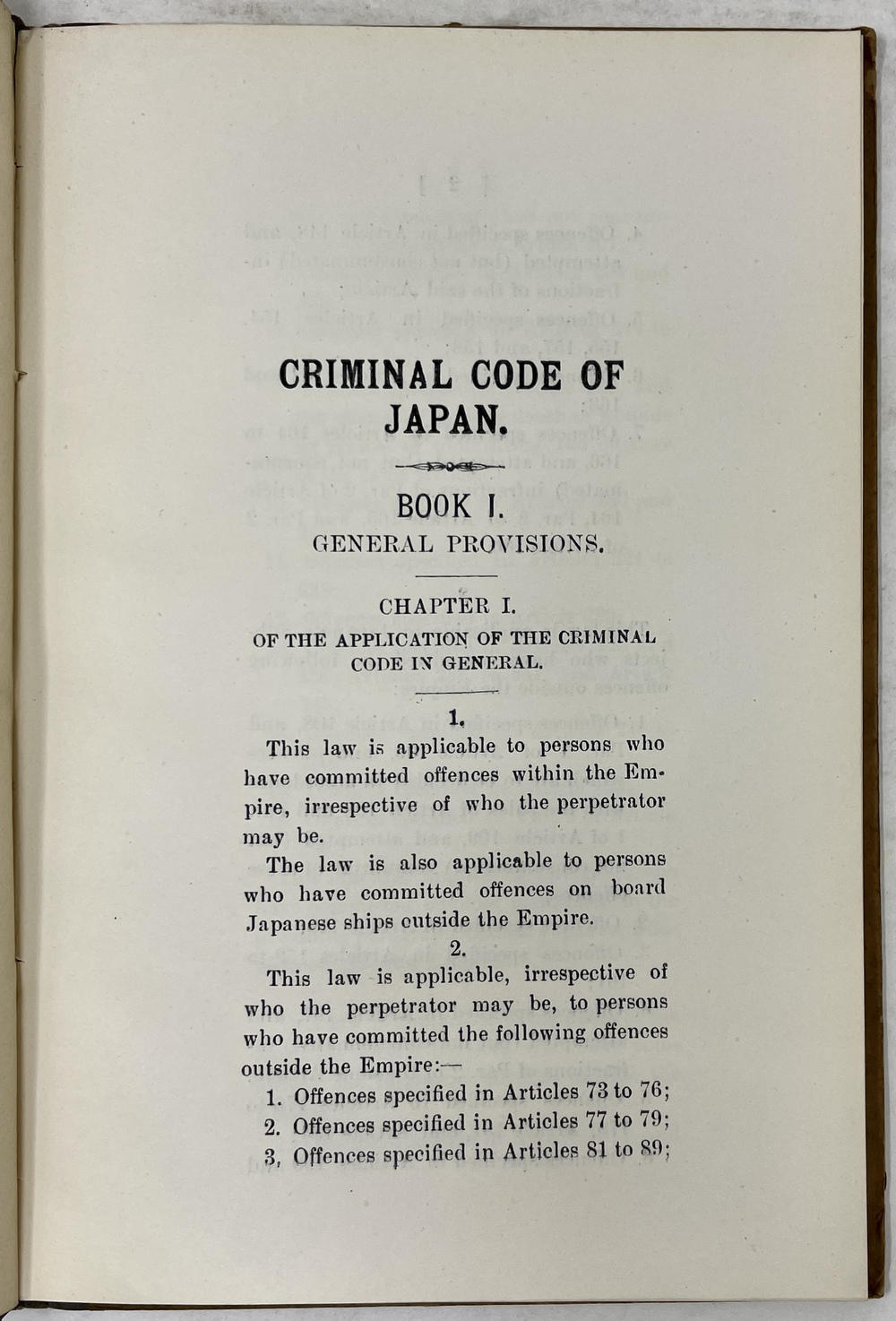 THE CRIMINAL CODE OF JAPAN. TRANSLATED FROM THE ORIGINAL JAPANESE TEXT.