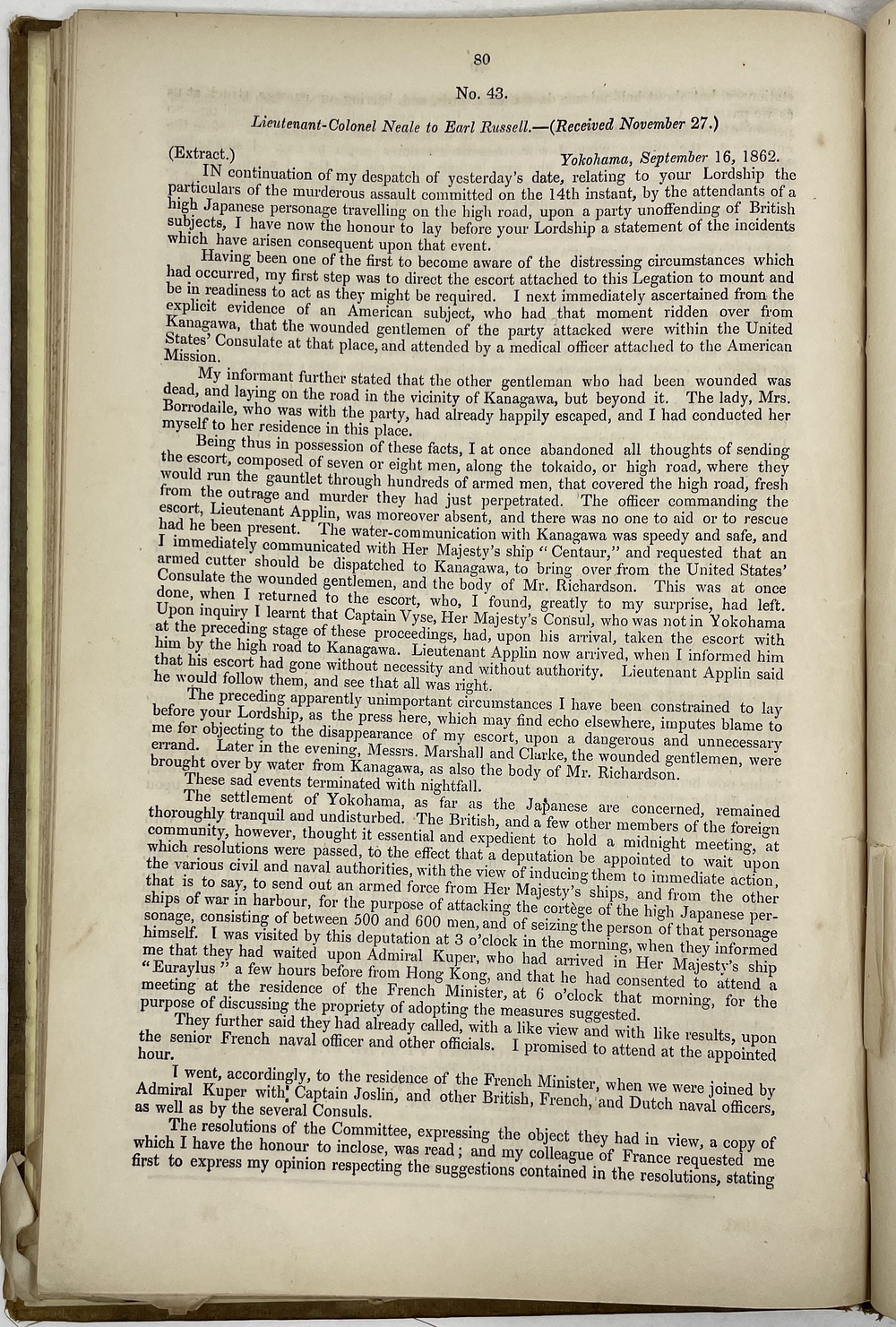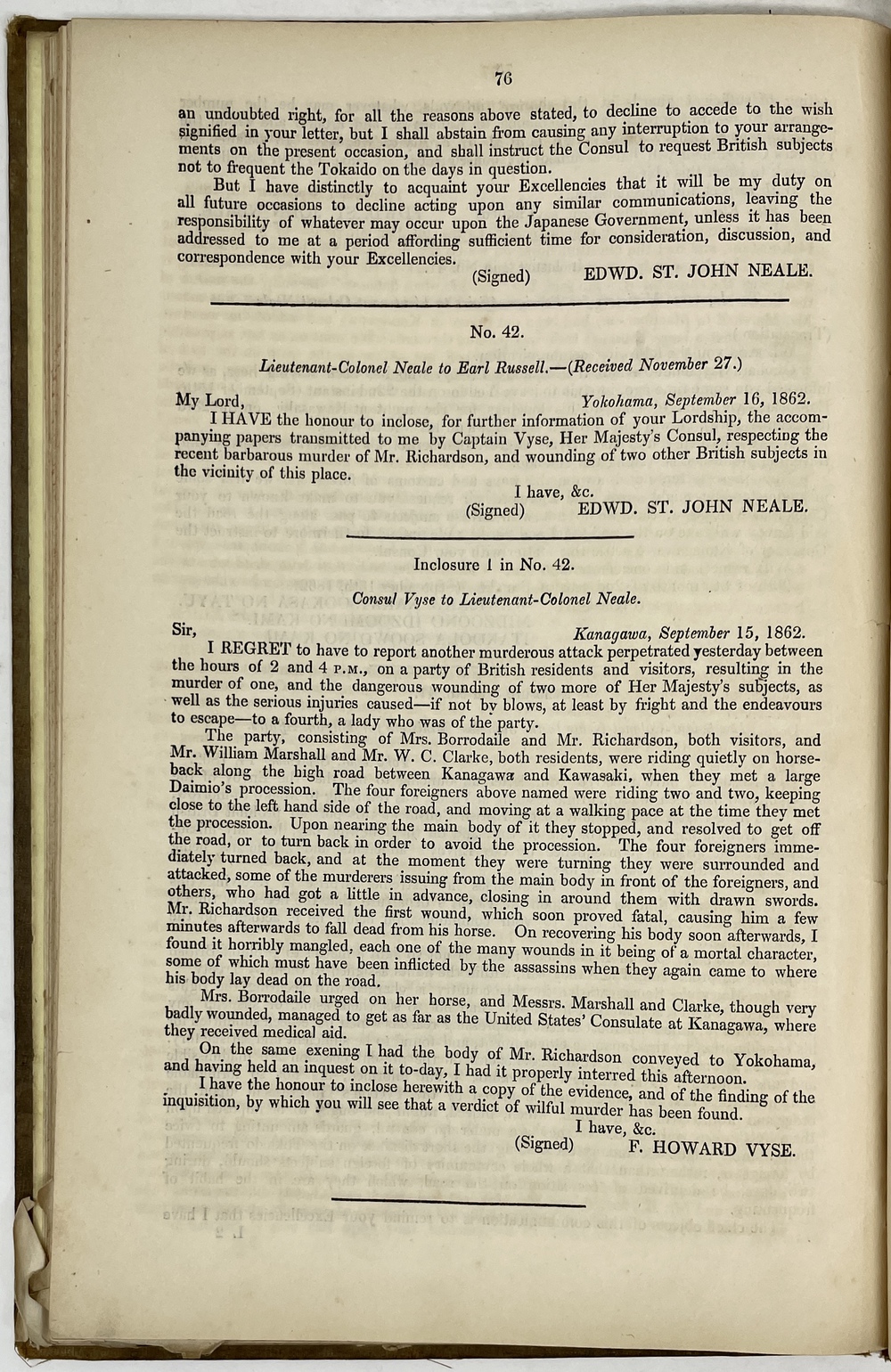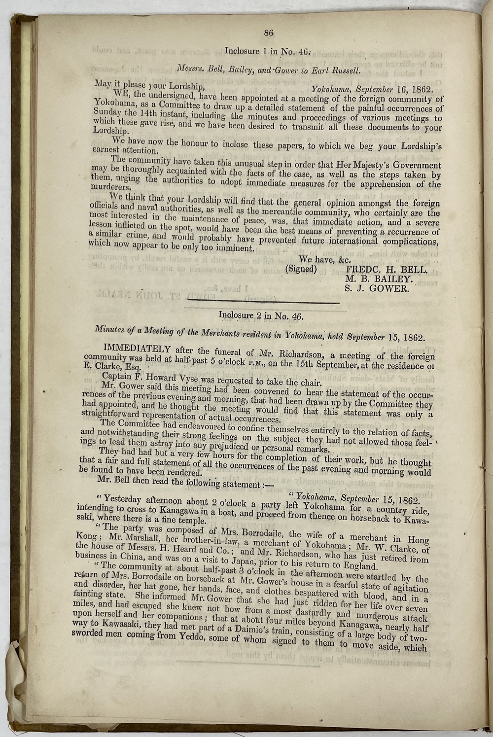 Both houses of Parliament. / Namamugi Incident / Margaret Watson Borradail / Gustave Duchesne, Prince de Bellecourt / John Neale.