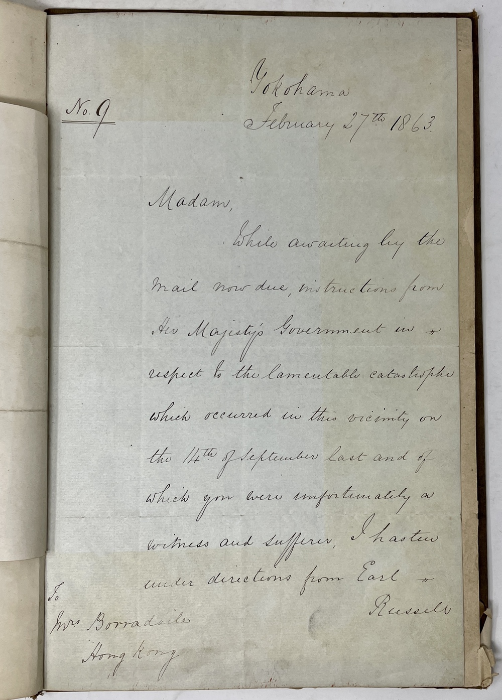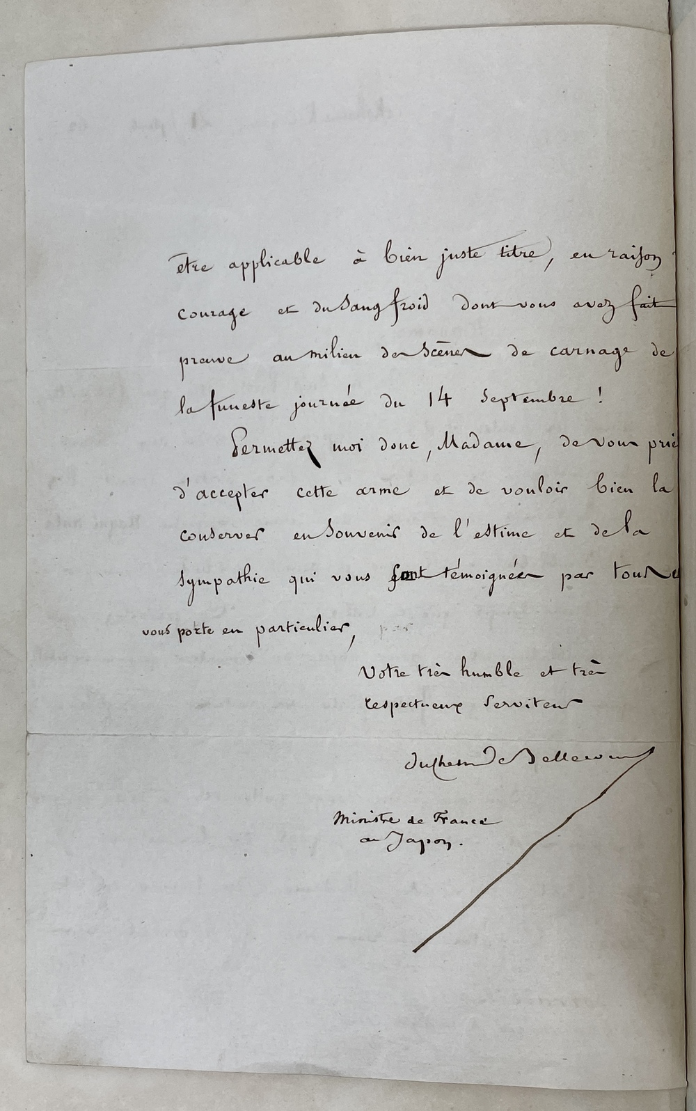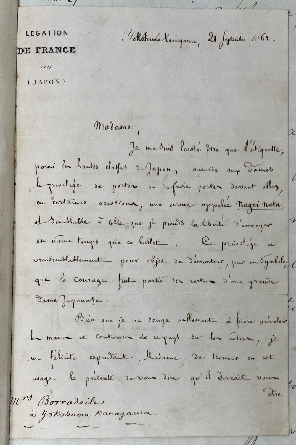 『1862年の日本に関する通信一覧』1862年9月21日付、駐日フランス公使ベルクールよりマーガレット・ボラディル(ボロデール)(在横浜)宛直筆書簡(仏文)、ならびに1863年2月27日付、駐日イギリス代理公使ニールより同(在香港)宛直筆書簡(英文)付属