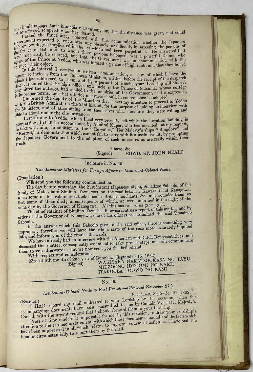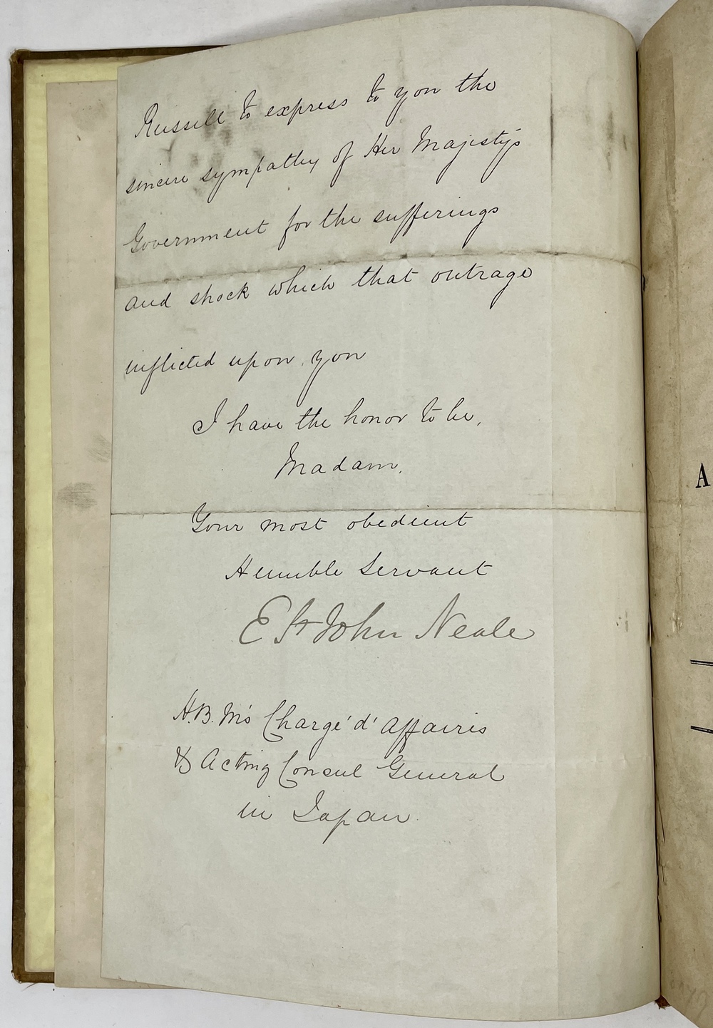 pp.[i(Title.)-iii], iv, pp.[1], 2-108. Boud with 2 autograph letters (To Margaret Watson Borradail from Bellecourt on 21 September 1862 at Yokohama, & to To the Same from Neale on 27 February 1863 at Yokohama),