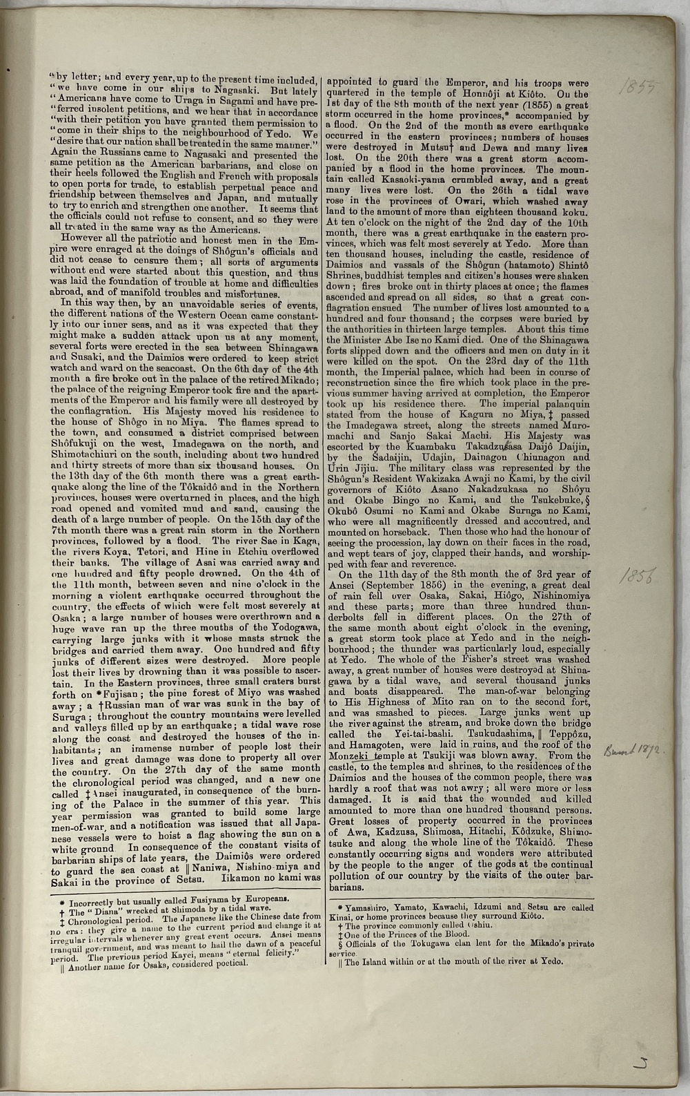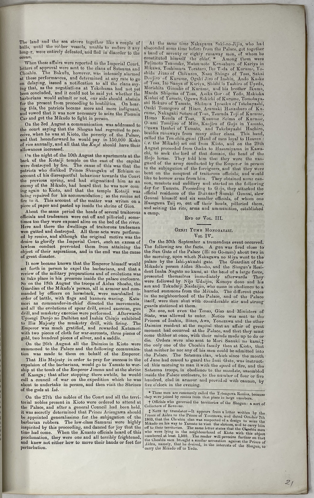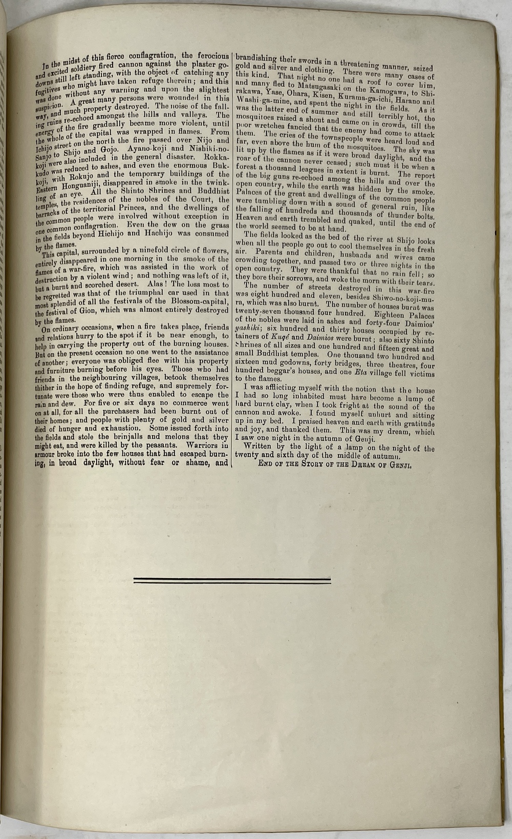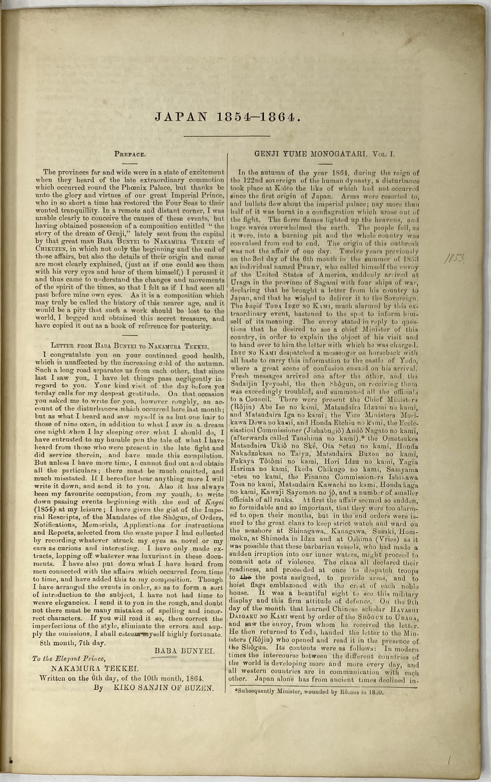 内外出版協会による1905年版がよく知られている、アーネスト・サトウによる英訳版『元治夢物語』の、同版より30年以上前に刊行(試刷)されていた極めて稀少な初版本。