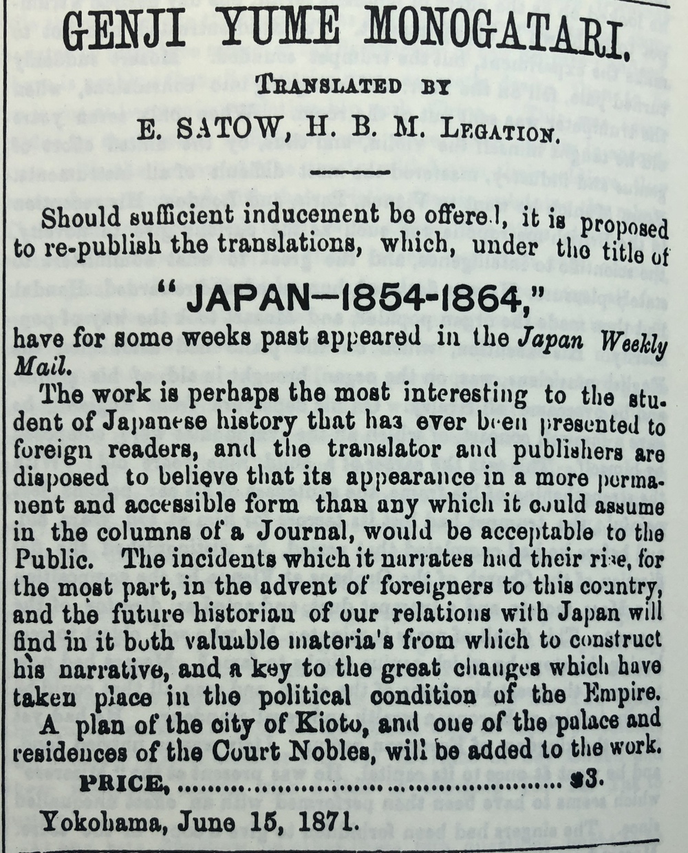 これらの情報から、サトウによる英訳版『元治夢物語』は、当初『Japan Weekly Mail』に匿名訳者による連載記事として発表され、原著第5巻の途中まで掲載が進んだ時点で連載が中断してしまうが、その理由は、より多くの読者に向けてまとまった形で公表するために、独立した単行本として出版することが決まったという事情があったことがわかる。