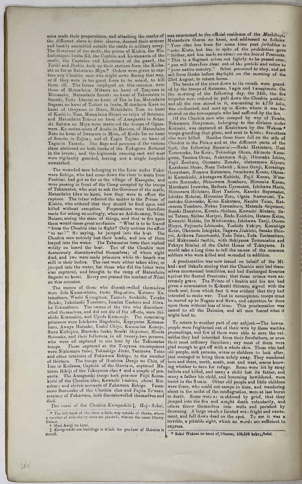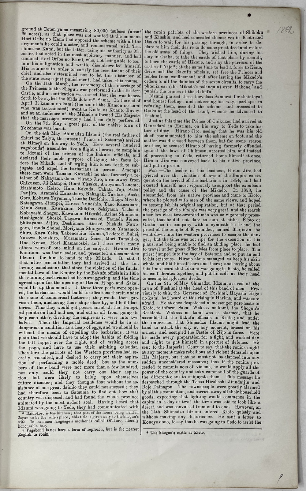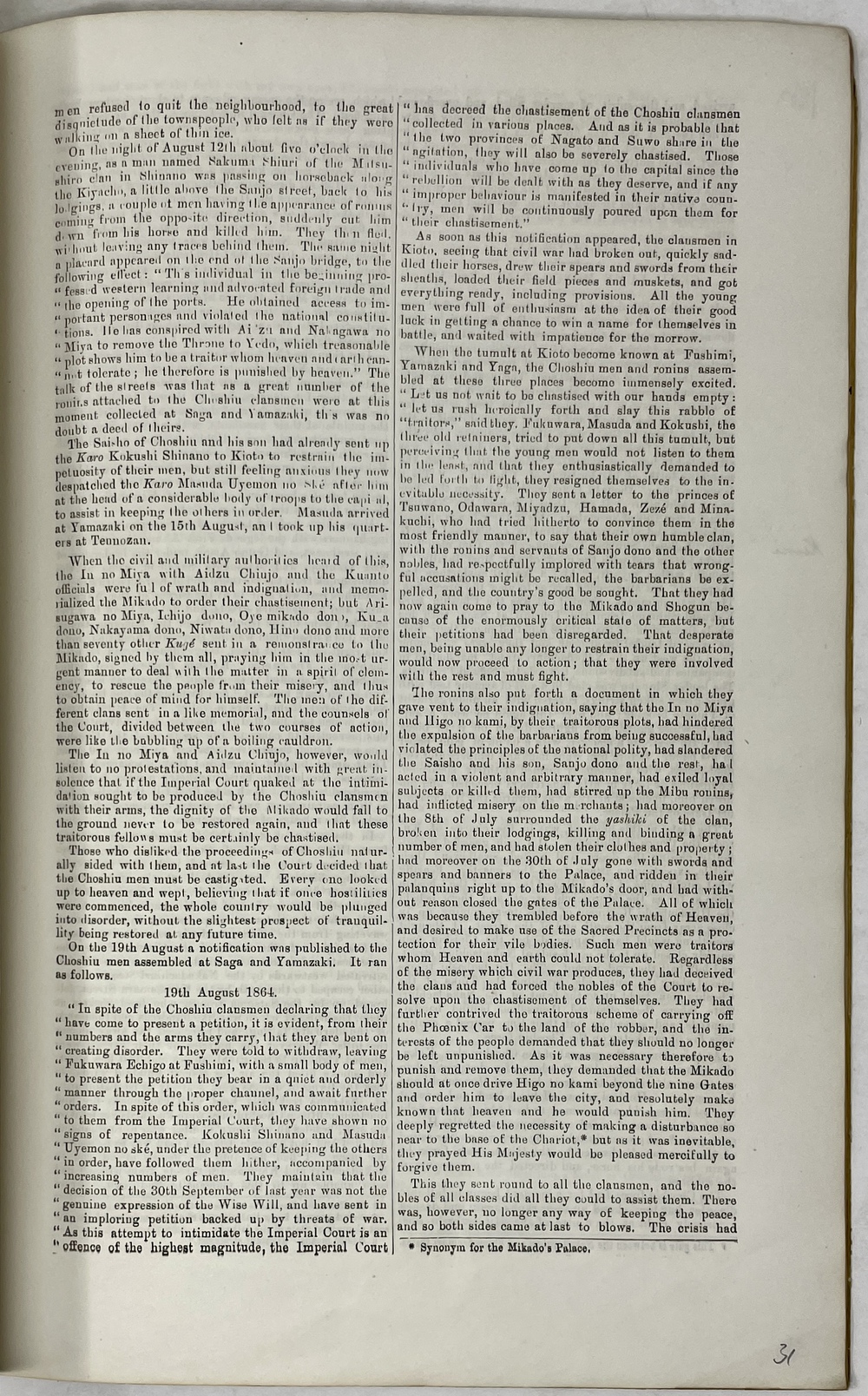 ただし、広告に1871年6月15日付で出版とあるものの、実際にはサトウ自身のために試し刷りが数部行われた程度で、刊行に至らなかったのではないかと推測される。また、この広告では京都地図が付される見込み(will be added)という趣旨も書かれているが、本書にこれに該当するような地図は付されておらず、本文のみがごく少部数印刷されたのみだったのではないか。本書と同じ体裁の書物は(店主の知る限り)これまで1冊のみが確認できる(安土堂書店HP:http://azuchi.cocolog-nifty.com/catalog/2004/09/post.html)が、これもサトウ自身の旧蔵本である。いかなる理由で公刊にいたらなかったのかは現時点では不明であるが、1905年の内外出版協会版をサトウ自身が「再版」とみなしていたという(馬場文英 / 徳田武(校註)『元治夢物語:幕末同時代史』岩波書店、2008年、「解説」326ページ)のは、本書の存在を念頭においてのことだと思われる。