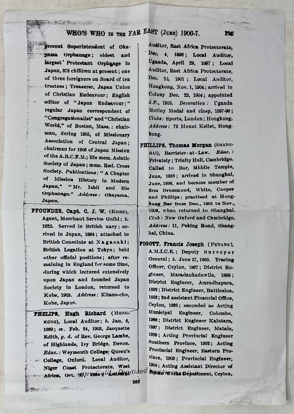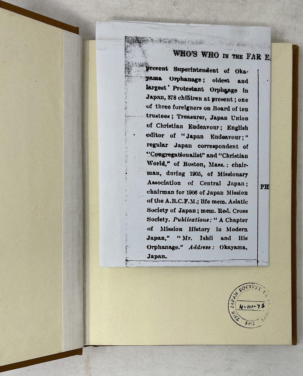 著者フォンデスの履歴に関する『Who’s Whoi n the Far East (June)1900-7.』の記事のコピーが挟み込まれている。[NCID: BA19703575]