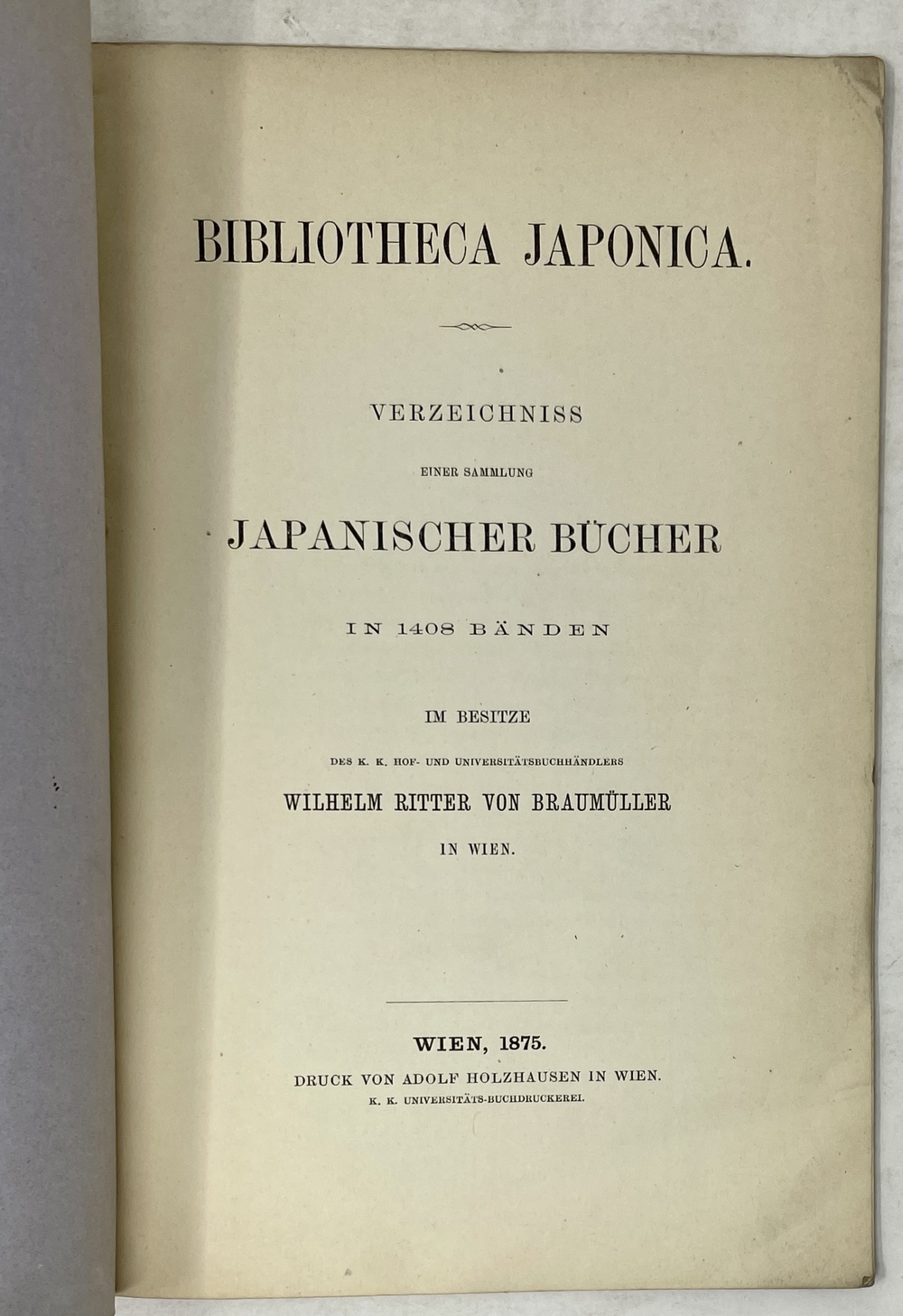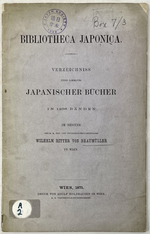 BIBLIOTHECA JAPONICA. VERZEICHNISS EINER SAMMLUNG JAPANISCHER BÜCHER IN 1408 BÄNDEN IM BESITZE DES K. K. HOF- UND UNIVERSITÄTSBUCHHÄNDLERS WILHELM RITTER VON BRAUMÜLLER IN WIEN.